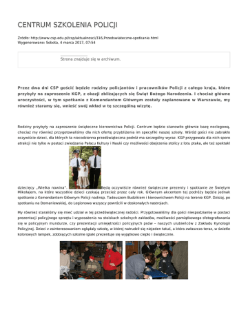 CENTRUM SZKOLENIA POLICJI Źródło: http://www.csp.edu.pl/csp/aktualnosci/316,Przedswiateczne-spotkanie.html Wygenerowano: Sobota, 4 marca 2017, 07:54 Strona znajduje się w archiwum. Przez dwa dni CSP gościć będzie rodziny policjantów i pracowników Policji z całego kraju, które przybyły na zaproszenie KGP, z okazji zbliżających się Świąt Bożego Narodzenia. I chociaż główne uroczystości, w tym spotkanie z Komendantem Głównym zostały zaplanowane w Warszawie, my również staramy się, wnieść swój wkład w tę szczególną wizytę. Rodziny przybyły na zaproszenie świąteczne kierownictwa Policji. Centrum będzie stanowiło głównie bazę noclegową, chociaż my również przygotowaliśmy dla nich ofertę przybliżenia im specyfiki naszej szkoły. Wśród gości nie zabrakło oczywiście dzieci, dla których ta niecodzienna przedświąteczna podróż ma szczególny wyraz. KGP przygowała dla nich sporo atrakcji nie tylko w postaci zwiedzania Pałacu Kultury i Nauki czy możliwości obejrzenia stolicy z lotu ptaka, ale też spektakl dziecięcy „Wielka nowina”. Będą oczywiście również świąteczne prezenty i spotkanie ze Świętym Mikołajem, na które wszystkie dzieci czekają przecież przez cały rok. Głównym akcentem tej podróży będzie jednak spotkanie z Komendantem Głównym Policji nadinsp. Tadeuszem Budzikiem i kierownictwem Policji na terenie KGP. Dzisiaj, po spotkaniu na Domaniewskiej, do Legionowa wszyscy powrócili w doskonałych nastrojach. My również staraliśmy się mieć udział w tej przedświątecznej radości. Przygotowaliśmy dla gości niespodziankę w postaci prezentacji policyjnego sprzętu i wyposażenia na stoiskach szkolnych zakładów, możliwości pamiątkowego sfotografowania się w policyjnym mundurze, czy prezentacji umiejętności policyjnych psów – naszych ulubieńców z Zakładu Kynologii Policyjnej. Dzieci z zainteresowaniem oglądały szkołę, w której natrudził się niejeden tatuś, a która zwłaszcza teraz, w świetle kolorowych lampek, zdobiących szkolne iglaki prezentuje się wyjątkowo ciepło i świątecznie. Anna Galant, rzecznik CSP zdjęcia Leszek Szulich ZTK Ocena: 0/5 (0) Tweetnij