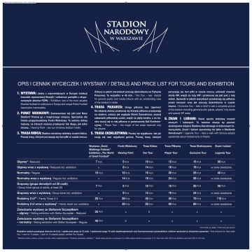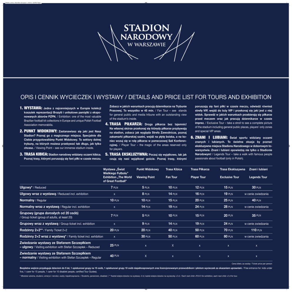 Stadion_cennik_135x135cm (3):Layout 1 4/19/13 1:56 PM Page 1 OPIS I CENNIK WYCIECZEK I WYSTAWY / DETAILS AND PRICE LIST FOR TOURS AND EXHIBITION 1. WYSTAWA: Jedna z najcenniejszych w Europie kolekcji koszulek reprezentacji Brazylii i unikatowe pamiątki z eksponowanych zbiorów PZPN. / Exhibition: one of the most valuable Brazilian football kit collections in Europe and unique Polish Football Association memorabilia. Zobacz w jakich warunkach pracują dziennikarze na Trybunie Prasowej. To wszystko w 45 min. / Fan Tour – see stands for general public and media tribune with an outstanding view of the stadium’s inside. 4. TRASA PIŁKARZA: Zastanawiasz się jaki jest Nasz Stadion? Poznaj go z magicznego miejsca. Specjalnie dla Ciebie przygotowaliśmy Punkt Widokowy. To sektory dolnej trybuny, na których możesz przebywać tak długo, jak tylko chcesz. / Viewing Point – see our immense stadium inside. Droga piłkarza bez tajemnic! Na własnej skórze przekonaj się którędy piłkarze przybywają na stadion, zobacz jak wygląda Strefa Zawodnicza, poznaj zakamarki piłkarskiej szatni, wejdź na płytę boiska, a na koniec wczuj się w rolę piłkarza w pomeczowej Sali Konferencyjnej. / Player Tour – the magic of the areas reserved only for players. 3. TRASA KIBICA: Stadion narodowy widziany oczami kibica. 5. TRASA EKSKLUZYWNA: Poczuj się wyjątkowo, tak jak Poznaj trasy, którymi poruszają się fani piłki w czasie meczu. czują się nasi wyjątkowi goście. Poznaj trasy, którymi 2. PUNKT WIDOKOWY: Wystawa „Świat Wielkiego Futbolu” Exhibition „The World of Great Football” Ulgowy* / Reduced poruszają się fani piłki w czasie meczu, odwiedź również strefę VIP, wejdź do loży VIP i przekonaj się jaki jest z niej widok. Sprawdź w jakich warunkach przebierają się piłkarze przed meczem oraz jak pracują dziennikarze w czasie imprez. / Exclusive Tour – take a stroll to see a complete picture of the stadium including general public places, players’ only zones and special VIP areas. 6. ZNANI I LUBIANI: Świat sportu widziany oczami znanych i lubianych. To świetna okazja by poznać ekskluzywne miejsca Stadionu Narodowego w doborowym towarzystwie. Znani i lubiani opowiedzą nie tylko o Stadionie Narodowym! / Legends Tour – take a walk with famous people passionate about football (only in Polish). Punkt Widokowy Trasa Kibica Trasa Piłkarza Trasa Ekskluzywna Znani i lubiani Viewing Point Fan Tour Player Tour Exclusive Tour Legends Tour 7 PLN 5 PLN 10 PLN 12 PLN 15 PLN 30 PLN x 8 PLN 14 PLN 16 PLN 19 PLN w cenie zwiedzania 10 PLN 10 PLN 15 PLN 20 PLN 25 PLN 40 PLN x 14 PLN 19 PLN 24 PLN 28 PLN w cenie zwiedzania 7 PLN 5 PLN 10 PLN 15 PLN 20 PLN 35 PLN x 9 PLN 14 PLN 19 PLN 24 PLN w cenie zwiedzania 20 PLN 20 PLN 40 PLN 50 PLN 70 PLN 110 PLN x 30 PLN 50 PLN 60 PLN 80 PLN w cenie zwiedzania Zwiedzanie wystawy ze Stefanem Szczepłkiem – ulgowy / Visiting exhibition with Stefan Szczepłek – Reduced 25 PLN x X x x x Zwiedzanie wystawy ze Stefanem Szczepłkiem – normalny / Visiting exhibition with Stefan Szczepłek – Regular 40 PLN X x x x x Ulgowy wraz z wystawą / Reduced incl. exhibition Normalny / Regular Normalny wraz z wystawą / Regular incl. exhibition Grupowy (grupa dorosłych od 20 osób) / Group ticket (group of adults, at least 20) Grupowy wraz z wystawą / Group ticket incl. exhibition Rodzinny 2+2** / Family Ticket 2+2 Rodzinny 2+2 wraz z wystawą* / Family ticket incl. exhibition Cena biletu za osobę / Ticket price per person Bezpłatne wejście przysługuje dzieciom do 5 lat, 1 opiekunowi grupy na 15 osób, 1 opiekunowi grupy 10 osób niepełnosprawnych oraz licencjonowanym przewodnikom i pilotom wycieczek za okazaniem uprawnień. / Free entrance for: kids under five, 1 carer for 15 people, 1 carer for 10 disablet people, certified Tour Guides). * Młodzież szkolna, studenci, emeryci i renciści, osoby niepełnosprawne. / Students, pensioners, disabled. | ** Każde kolejne dziecko na wystawę +5 zł, każde kolejne dziecko na wycieczkę +2 zł. / Each next child +PLN 5 for exhibition, each next child +2 zł for tour.
