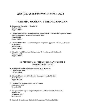 KSIĄŻKI ZAKUPIONE W ROKU 2014 1. CHEMIA OGÓLNA I NIEORGANICZNA 1. Bioorganic Chemistry / Rehder D. Oxford 2014 Sygn. 1.4249 2. Chemia obliczeniowa w laboratorium organicznym / Kaczmarek-Kędziera Anna, Ziegler-Borowska Marta, Kędziera Dariusz Toruń 2014 Sygn. 1.4234 3. Chemical Structure and Reactivity: an integrated approach. 2nd ed. / J. Keeler, P. Wothers Oxford 2014 Sygn. 1.4286 4. Chemistry and Chemical Biology / eds. R. Joswik, A.A. Dalinkevich Toronto 2015 Sygn. 1.4288 8. METODY W CHEMII ORGANICZNEJ I NIEORGANICZNEJ 1. Catalytic Cascade Reactions / eds Xu P.-F., Wang W. New Jersey 2014 Sygn. 8.4248 2. Chemical Synthesis of Nucleoside Analogues / ed. P. Merino New Jersey Sygn. 8.4233. 3. Chemistry of Bioconjugates / ed. R. Narain New Jersey 2014 Sygn. 8.4291 4. Design and Strategy in Organic Synthesis… / Hanessian S., Giroux S., Merner BL Weinheim 2013 Sygn. 8.4293 5. General, Organic, and Biological Chemistry / Timberlake K.C. 4th ed. Sygn. 8.4253 6. General, Organic, and Biological Chemistry Structures of Life / Timberlake K.C. 4th ed. Boston 2013 Sygn. 8.4254 7. Organic Mechanisms Reaction Methodology and Biological Appl. / Xiaoping S. New Jersey 2013 Sygn. 8.4225 9. BIOCHEMIA 1. Biochemistry of Signal Transduction and Regulation / Krauss G. Weinheim 2014 Sygn. 9.4247 2. PCR Technology. Current Innovations. 3rd Ed / T. Nolan, S.A. Bustin Boca Raton 2013 Sygn. 9.4281 3. Podstawy biochemii dla towaroznawców / red. nauk. M. Filipiak Poznań 2014 Sygn. 9.4268 11 BIAŁKA I KWASY NUKLEINOWE 1. Advanced Delivery and Therapeutic Applications of RNAi / eds Cheng K., Mahato R.I. Chichester 2013 Sygn. 11.4252 2. Analysis of RNA-Protein Complexes in Vitro / Kjems J. et al. Amsterdam 1998 Sygn. 11.4237 3. Ancient DNA / eds B. Shapiro, M. Hofreiter New York 2012 Sygn. 11.4272 4. Antiviral Agents/ed. E. de Clercq Amsterdam, 2013 Sygn. 11.4244 5. Chemical Biology of Nucleic Acids / eds Erdmann V.A. et al. Berlin 2014 Sygn. 11.4263 6. Chemical Synthesis of Nucleoside Analogues / ed. P. Merino New Jersey 2013 Sygn. 11.4287 7. DNA-Protein Interaction. 3rd ed. / ed. T.Moss, B. Leblanc Dordrecht 2009 Sygn. 11.4242 8. Homocysteine in Protein Structure/Function and Human Disease / Jakubowski H. Wien 2013 Sygn. 11.4224 9. MicroRNAs in Medicine / ed. Lawrie Ch.H. New Jersey 2014 Sygn. 11.4251 10. Nucleic Acid Detection / eds DM Kolpashchikov, YV Gerasimova New York 2013 Methods in Molecular Biology vol. 1039 Sygn. 11.4290 11. Plant Proteomics. Methods and Protocols. 2nd ed. New York 2014 Sygn. 11.4241 12. RNA. A Laboratory Manual/ D.Ch.Rio et al/ New York 2011 Sygn. 11.4238 13. RNA Folding Methods and Protocols / Waldsich Ch. Ed New York 2014 Sygn. 11.4236 14. RNA Nanotechnology / ed. Bin Wang Singapore, 2014 Sygn. 11.4265 15. RNA-Protein Interaction Protocols. 2nd / ed. Ren-Jang L. Totowa 2008 Sygn. 11.4223, 4243 16. RNA Regulation / ed. R.A.Meyers T.1-2:2014 Weinheim Sygn. 11.4282-4283 17. Systems Biology of RNA Binding Proteins / G.W. Yeo New York 2014 Sygn. 11.4270 18. BIOLOGIA 1. Biologia wg IX wyd. amer. / Solomon EP, Berg LR, Martin DW Warszawa 2014 Sygn. 18.4267 2. Cell Biology. International Student Version. Ed. 7th / G. Karp Singapore 2014 Sygn. 18.4279 3. Handbook of Chemical and Biological Plant Analytical Methods / Ed. K. Hostettmann Chichester 2014 T. 1-3 Sygn. 18.4274-4276 4. Na pograniczu chemii i biologii Poznań: Wydawnictwo Naukowe UAM T.30:2013 sygn. 18.4235 T.31:2013 sygn. 18.4232 5. Stress Signaling in Plants: Genomics and Proteomics Perspective, Vol. 1 New York 2013 Sygn. 18.4240 6. Tabacco BY-2 Cells / ed. Nagata T. et al Berlin [br.] (Biotechnology in Agriculture and Forestry t. 53) Sygn. 18.4231 19 GENETYKA 1. Data Production and Analysis in Population Genomics / eds F. Pompanon, A. Bonin New York 2012 Sygn. 19.4273 2. Epigenetics and Pathology /ed. K. Ayyanathan Toronto 2014 Sygn. 19.4292 3. Handbook of Genome Research / ed. Sensen Ch.W. Weinheim 2005 Vol. 1 Vol. 2 sygn. 19.4229 4230 4. Next-generation Sequencing / ed. J. Xu Norfolk 2014 Sygn. 19.4271 22. SPEKTROSKOPIA 1. Applied NMR Spectroscopy for Chemists and Life Scientists / Zerbe O., Jurt S. Weinheim 2014 Sygn. 22.4226, 4246 2. Modern NMR Techniques for Synthetic Chemistry / ed. J. Fisher Boca Raton 2015 Sygn. 22.4289 24 BIOLOGIA MOLEKULARNA 1. Equilibria and Kinetics of Biological Macromolecules / Hermans J., Lentz B. New Jersey 2014 Sygn. 24.4250 2. Fields Virology. Ed. 6th / eds Knipe D.M., Howley P.M. Philadelphia 2013 T. 1 sygn. 24.4227 T. 2 4228 3. Modern NMR Techniques for Synthetic Chemistry / ed. J. Fisher Boca Raton 2015 Sygn. 22.4289 4. Molecular Biology of the Cell / Wilson J., Hunt T. New York 2008 Sygn. 24.4245 5. Molecular Biology of the Gene. Ed. 7th / Watson J.D. et al. Boston 2014 Sygn. 24.4259 6. Tools and Techniques in Biomolecular Science / eds A. Divan, J. Royds Oxford 2013 Sygn. 24.4284 7. Wnt Signaling in Development and Disease / ed. Hoppler S., Moon R.T. New Jersey 2014 Sygn. 24.4262 25. CHEMIA W MEDYCYNIE 1. Diagnostyka laboratoryjna / Brunzel N.A. T.1-2. Wrocław 2010 Sygn. 25.4277-4278 2. Making and Using Antibodies / ed. Howard G.C., Kaser M.R. Boca Raton 2014 Sygn. 25.4255 3. Molecular Oncology / eds Gelman E.P., Sawyers Ch.L., Rauscher I. F.J. Cambridge 2014 Sygn. 25.4256 4. Neurocybernetyka teoretyczna / red. Tadeusiewicz R. Warszawa 2009 Sygn. 25.4258 5. Stem Cells from Basic Research to Therapy. Vol. 1 Basic Stem Cell … / eds Calegari F., Waskow C. Boca Raton 2014 Sygn. 25.4260 6. Stem Cells in Reproductive Medicine. 3rd ed. / eds Simon C., Pellicer A. Pera R.R. Cambridge 2013 Sygn. 25.4257 7. Transcriptional and Translational Regulation of Stem Cells / eds Hime G., Abud H. Dordrecht 2013 Sygn. 25.4261 8. Translation and Its Regulation in Cancer Biology and Medicine / ed. A. Parsyan Dordrecht 2014 Sygn. 25.4285