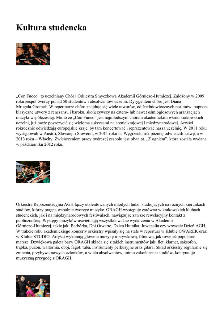 Kultura studencka „Con Fuoco” to uczelniany Chór i Orkiestra Smyczkowa Akademii Górniczo-Hutniczej. Założony w 2009 roku zespół tworzy ponad 50 studentów i absolwentów uczelni. Dyrygentem chóru jest Diana Mrugała-Gromek. W repertuarze chóru znajduje się wiele utworów, od średniowiecznych psalmów, poprzez klasyczne utwory z renesansu i baroku, skończywszy na cztero- lub nawet ośmiogłosowych aranżacjach muzyki współczesnej. Mimo że „Con Fuoco” jest najmłodszym chórem akademickim wśród krakowskich uczelni, już może poszczycić się wieloma sukcesami na arenie krajowej i międzynarodowej. Artyści rokrocznie odwiedzają europejskie kraje, by tam koncertować i reprezentować naszą uczelnię. W 2011 roku występowali w Austrii, Słowacji i Słowenii, w 2011 roku na Węgrzech, rok później odwiedzili Litwę, a w 2013 roku – Włochy. Zwieńczeniem pracy twórczej zespołu jest płyta pt. „Z ogniem”, która została wydana w październiku 2012 roku. Orkiestra Reprezentacyjna AGH łączy utalentowanych młodych ludzi, studiujących na różnych kierunkach studiów, którzy pragną wspólnie tworzyć muzykę. ORAGH występuje zarówno w krakowskich klubach studenckich, jak i na międzynarodowych festiwalach, nawiązując zawsze rewelacyjny kontakt z publicznością. Występy muzyków uświetniają wszystkie ważne wydarzenia w Akademii Górniczo-Hutniczej, takie jak: Barbórka, Dni Otwarte, Dzień Hutnika, Juwenalia czy wreszcie Dzień AGH. W trakcie roku akademickiego koncerty orkiestry wpisały się na stałe w repertuar w Klubie GWAREK oraz w Klubie STUDIO. Artyści wykonują głównie muzykę rozrywkową, filmową, jak również popularne marsze. Dźwiękowa paleta barw ORAGH składa się z takich instrumentów jak: flet, klarnet, saksofon, trąbka, puzon, waltornia, obój, fagot, tuba, instrumenty perkusyjne oraz gitara. Skład orkiestry regularnie się zmienia, przybywa nowych członków, a wielu absolwentów, mimo zakończenia studiów, kontynuuje muzyczną przygodę z ORAGH. Studencki Klub Taneczny AGH powstał w 1955 roku i jest najstarszym klubem tego typu w Polsce. Opiekę nad jego działalnością sprawował wówczas prof. Marian Wieczysty. Od blisko 60 lat klub prowadzi kursy tańca, a także szkoli tancerzy w sekcji turniejowej. Uczestnicy zajęć doskonalą swoje umiejętności pod okiem doświadczonych instruktorów – państwa Anny i Stanisława Smoroniów, którzy również są wychowankowie SKT. Siedziba klubu jest zlokalizowana przy ul. Reymonta 15, gdzie znajduje się jedna z sal ćwiczeniowych. Ponadto SKT organizuje obozy wakacyjne, podczas których – za sprawą intensywnych treningów stanowiących przedsmak nowego sezonu tanecznego – wypoczynek łączy się ze świetną zabawą. Zespół Pieśni i Tańca AGH „Krakus” jest najstarszym studenckim zespołem folklorystycznym w Polsce. Został on założony przez Wiesława Białowąsa przy Akademii Górniczo-Hutniczej w Krakowie w 1949 roku. Zespół prezentuje oryginalny polski folklor ludowy, przetworzony i przystosowany artystycznie do wymogów sceny. Pieśni, tańce i obrzędy przedstawione w suitach: krakowskiej, śląskiej, rzeszowskiej, łowickiej, sądeckiej, lubelskiej, kieleckiej, żywieckiej i beskidzkiej, barwnie i żywo opisują urodę oraz rozmaitość tych regionów. Pokazują jednocześnie kunszt, autentyzm i piękno polskiego stroju ludowego. Zobacz, co ciekawego dzieje się w klubach studenckich AGH ACK Klub STUDIO Klub Studencki Gwarek Klub Studencki Zaścianek Klub Studencki Karlik Klub Studencki Filutek