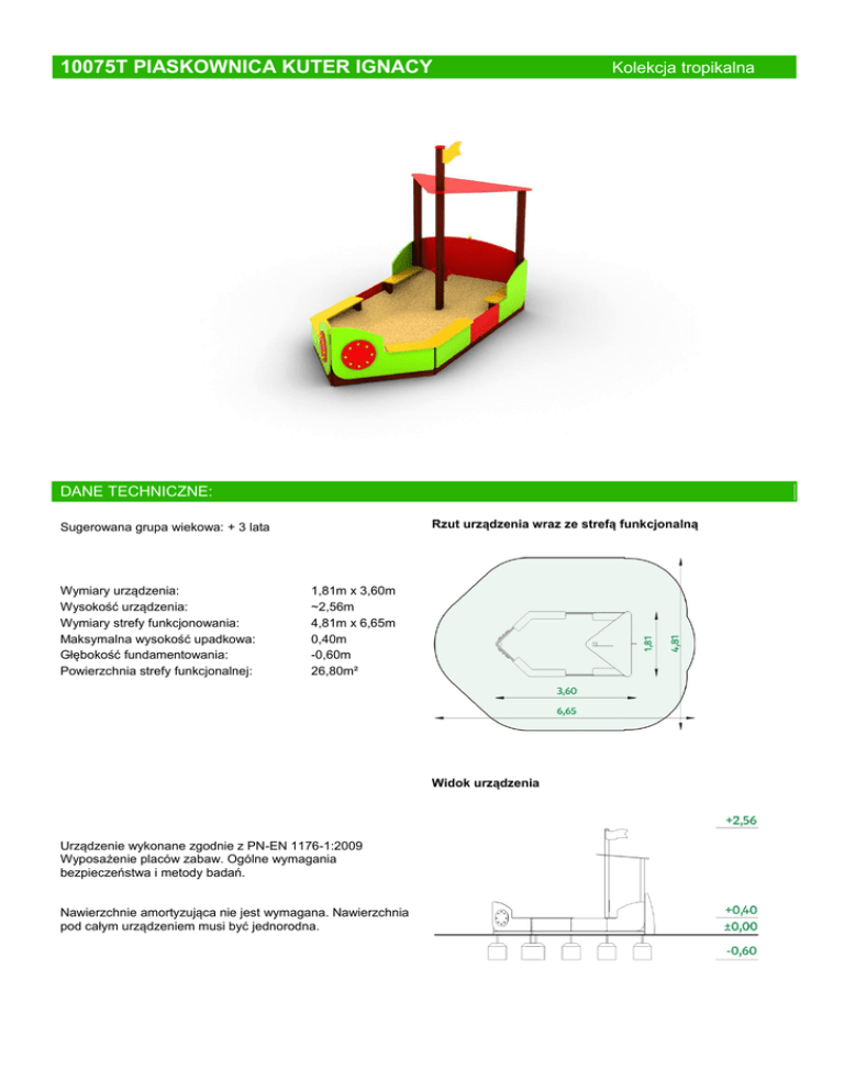 10075T PIASKOWNICA KUTER IGNACY Kolekcja tropikalna DANE TECHNICZNE: Rzut urządzenia wraz ze strefą funkcjonalną Sugerowana grupa wiekowa: + 3 lata Wymiary urządzenia: Wysokość urządzenia: Wymiary strefy funkcjonowania: Maksymalna wysokość upadkowa: Głębokość fundamentowania: Powierzchnia strefy funkcjonalnej: 1,81m x 3,60m ~2,56m 4,81m x 6,65m 0,40m -0,60m 26,80m² Widok urządzenia Urządzenie wykonane zgodnie z PN-EN 1176-1:2009 Wyposażenie placów zabaw. Ogólne wymagania bezpieczeństwa i metody badań. Nawierzchnie amortyzująca nie jest wymagana. Nawierzchnia pod całym urządzeniem musi być jednorodna. MATERIAŁY: Nogi konstrukcyjne: drewno klejone warstwowo, malowane lakierobejcą na kolor ciemny orzech Burty piaskownicy: drewno lite, impregnowane, lakierowane na kolor ciemny orzech Elementy połaciowe, aplikacje: płyty HDPE Kotwy: stal ocynkowana kąpielowo Elementy stalowe: stal ocynkowana kąpielowo, malowana proszkowo Zaślepki: tworzywo sztuczne Fundamenty: beton klasy min. B-15 SATERNUS DISTRIBUTION Sp. z o.o. sp. k. ul. Nowa 32 41-500 Chorzów SATERNUS DISTRIBUTION Sp. z o.o. sp. k. zastrzega sobie wszelkie prawa do ochrony praw autorskich na podstawie Ustawy z dnia 04.02.1994 r. o prawie autorskim i prawach pokrewnych ( DZ. U. Nr 28 poz. 83) a zwłaszcza art. 78 i 79 tejże ustawy. Właściciel certyfikatu: Producent: Dystrybutor: GRUPA SATERNUS Sp. z o.o. S. K. A. (następca prawny Place Zabaw Saternus Sp. z o.o.) Saternus Production Sp. z o.o. sp. k. Saternus Distribution Sp. z o.o. sp. k.
