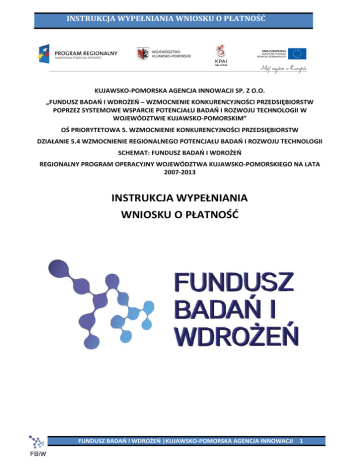 INSTRUKCJA WYPEŁNIANIA WNIOSKU O PŁATNOŚĆ KUJAWSKO-POMORSKA AGENCJA INNOWACJI SP. Z O.O. „FUNDUSZ BADAŃ I WDROŻEŃ – WZMOCNENIE KONKURENCYJNOŚCI PRZEDSIĘBIORSTW POPRZEZ SYSTEMOWE WSPARCIE POTENCJAŁU BADAŃ I ROZWOJU TECHNOLOGII W WOJEWÓDZTWIE KUJAWSKO-POMORSKIM” OŚ PRIORYTETOWA 5. WZMOCNIENIE KONKURENCYJNOŚCI PRZEDSIĘBIORSTW DZIAŁANIE 5.4 WZMOCNIENIE REGIONALNEGO POTENCJAŁU BADAŃ I ROZWOJU TECHNOLOGII SCHEMAT: FUNDUSZ BADAŃ I WDROŻEŃ REGIONALNY PROGRAM OPERACYJNY WOJEWÓDZTWA KUJAWSKO-POMORSKIEGO NA LATA 2007-2013 INSTRUKCJA WYPEŁNIANIA WNIOSKU O PŁATNOŚĆ FUNDUSZ BADAŃ I WDROŻEŃ |KUJAWSKO-POMORSKA AGENCJA INNOWACJI 1 INSTRUKCJA WYPEŁNIANIA WNIOSKU O PŁATNOŚĆ INFORMACJE OGÓLNE Przed rozpoczęciem wypełniania wniosku o płatność prosimy o zapoznanie się z niniejszą instrukcją wypełniania. Wnioskodawca zobowiązany jest do wypełnienia wszystkich pozycji wniosku o płatność, poza przypadkami, w których wskazano inaczej. Wniosek o płatność należy wypełniać w języku polskim. Wniosek o płatność jest dokumentem niezbędnym do rozliczenia poniesionych wydatków dotyczących realizowanego przedsięwzięcia (w formie refundacji) w ramach projektu „Fundusz Badań i Wdrożeń – wzmocnienie konkurencyjności przedsiębiorstw poprzez systemowe wsparcie potencjału badań i rozwoju technologii w Województwie Kujawsko-Pomorskim” realizowanego w ramach Osi priorytetowej 5. Wzmocnienie konkurencyjności przedsiębiorstw, Działania 5.4 Wzmocnienie regionalnego potencjału badań i rozwoju technologii, Schemat: fundusz badań i wdrożeń, Regionalnego Programu Operacyjnego Województwa Kujawsko-Pomorskiego na lata 2007-2013. Wniosek o płatność zawiera podstawowe informacje na temat przedsięwzięcia, rodzaju wniosku o płatność, zaawansowania finansowego i rzeczowego przedsięwzięcia, wydatkowanych środków, stopnia realizacji wskaźników oraz stanu realizacji przedsięwzięcia. Złożony wniosek o płatność wraz z wymaganymi załącznikami podlega ocenie i zatwierdzeniu przez KPAI w zakresie faktycznego i prawidłowego poniesienia wydatków oraz uznania ich za kwalifikujące się do objęcia wsparciem. Wnioskodawca składa wniosek o płatność nie częściej niż raz w danym kwartale kalendarzowym (I-III, IV-VI, VII-IX, X-XII), licząc od dnia zawarcia Umowy na realizację przedsięwzięcia, z zastrzeżeniem, że minimalna wartość wydatków kwalifikujących się do objęcia wsparciem ujętych we wniosku o płatność wynosi 20000,00 zł. Wnioskodawca składa wniosek o płatność końcową nie później niż do 14 dni od dnia zakończenia realizacji przedsięwzięcia. W przypadku zakończenia realizacji przedsięwzięcia przed dniem zawarcia Umowy na realizację przedsięwzięcia Wnioskodawca składa wniosek o płatność końcową nie później niż do 30 dni od dnia jej zawarcia. Minimalna wartość wydatków kwalifikujących się do objęcia wsparciem ujętych we wniosku o płatność końcową musi stanowić co najmniej 10% wartości wydatków kwalifikujących się do objęcia wsparciem w ramach przedsięwzięcia. KPAI przekazuje Wnioskodawcy całość lub część dofinansowania, w formie refundacji przelewem na rachunek bankowy wskazany przez Wnioskodawcę, na podstawie zweryfikowanego i zatwierdzonego przez KPAI wniosku o płatność. Przekazanie płatności końcowej (w tym jej wysokość) uzależnione jest od uzyskania pozytywnego wyniku kontroli (ewaluacji) przeprowadzonej przez KPAI na zakończenie realizacji przedsięwzięcia. Dofinansowanie przekazywane jest każdorazowo w wysokości procentowego udziału w wydatkach kwalifikujących się do objęcia wsparciem. Warunkiem przekazania Wnioskodawcy dofinansowania jest: 1) złożenie przez Wnioskodawcę do KPAI prawidłowego, kompletnego i spełniającego wymogi formalne i merytoryczne wniosku o płatność wraz z następującymi oznaczonymi datą i potwierdzonymi za zgodność z oryginałem przez Wnioskodawcę lub osobę upoważnioną do reprezentowania Wnioskodawcy kopiami: a) faktur lub innych dokumentów o równoważnej wartości dowodowej; b) dokumentów potwierdzających odbiór urządzeń/sprzętu lub wykonanie prac, jeżeli dokumenty odbioru wymagane są prawem; c) wyciągów bankowych z rachunku bankowego Wnioskodawcy, lub przelewów bankowych (potwierdzeń), a w przypadku płatności gotówkowych kopiami dokumentów, potwierdzających poniesienie wydatków w formie gotówkowej; d) umów z wykonawcą wraz z aneksami (jeśli wystąpiły) lub w przypadku, gdy umowa nie została zawarta – zleceń lub zamówień podpisanych przez obie strony; e) oświadczeń ostatniego sprzedawcy środka trwałego o tym, iż dany środek trwały nie był współfinansowany ze środków unijnych ani z dotacji krajowych w okresie 7 lat poprzedzających datę dokonania zakupu danego FUNDUSZ BADAŃ I WDROŻEŃ |KUJAWSKO-POMORSKA AGENCJA INNOWACJI 2 INSTRUKCJA WYPEŁNIANIA WNIOSKU O PŁATNOŚĆ środka trwałego przez Wnioskodawcę – w przypadku zakupu używanego środka trwałego dla potrzeb realizacji przedsięwzięcia, f) oświadczeń o kwalifikowalności podatku VAT według wzoru KPAI (dla każdego wniosku o płatność); g) oświadczeń dotyczących udzielenia zamówienia z zachowaniem odpowiednich procedur, w tym przejrzystości, jawności i uczciwej konkurencji przy wydatkowaniu środków w ramach realizowanego przedsięwzięcia według wzoru KPAI (dla każdego wniosku o płatność); h) innych dokumentów potwierdzających i uzasadniających prawidłową realizację przedsięwzięcia. 2) dokonanie przez KPAI poświadczenia faktycznego i prawidłowego poniesienia wydatków oraz uznania ich za kwalifikujące się do objęcia wsparciem na podstawie złożonego wniosku o płatność wraz z wymaganymi załącznikami, o których mowa w pkt 1; 3) dostępność środków w odpowiedniej wysokości otrzymanych od IZ RPO WK-P na realizację FBiW. 4) wniesienie przez Wnioskodawcę prawid