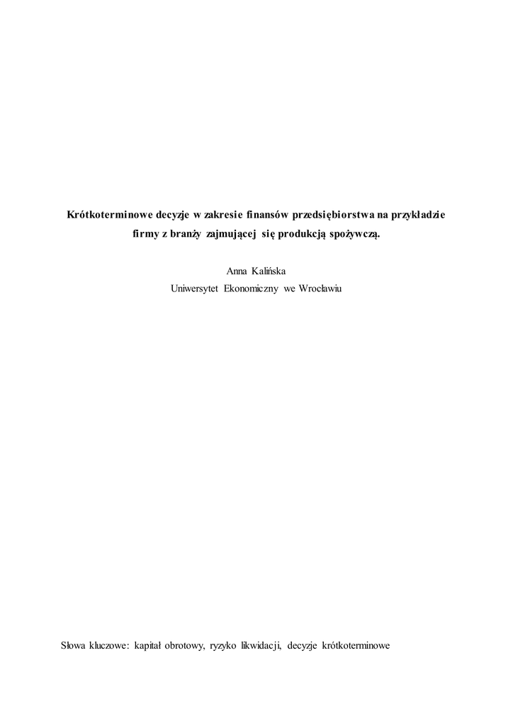 Krótkoterminowe decyzje w zakresie finansów przedsiębiorstwa na przykładzie firmy z branży zajmującej się produkcją spożywczą. Anna Kalińska Uniwersytet Ekonomiczny we Wrocławiu Słowa kluczowe: kapitał obrotowy, ryzyko likwidacji, decyzje krótkoterminowe Wprowadzenie Niniejszy raport dotyczy przedsiębiorstwa zajmującego się produkcją wyrobów cukierniczych. Praca ma na celu ocenę aktualnej sytuacji finansowej przedsiębiorstwa pod kątem posiadanego przez nie majątku obrotowego oraz zarekomendowanie odpowiednich działań mających na celu utrzymanie płynności płatniczej. Kapitał Obrotowy Netto Analiza NWC obrazuje w jakim stopniu aktywa finansowane są kapitałem stałym. Może on przyjmować wartość: dodatnią – co oznacza nadwyżkę kapitału, która pozostaje do dyspozycji przedsiębiorstwa ujemną – co oznacza, że część aktywów stałych finansowana jest ze źródeł krótkoterminowych zerową – oznacza to, że aktywa stałe są w całości finansowane kapitałem stałym NWC pozwala ocenić czy w danym przedsiębiorstwie istnieje ryzyko utraty płynności finansowej. NWC oblicza się ze wzoru: Wzór 1: Kapitał Obrotowy Netto NWC = Zapasy + Należności + Środki pieniężne i krótkoterminowe rozliczenia finansowe – Zobowiązania wobec dostawców Źródło: Michalski, G. Materiały dydaktyczne, Finanse Przedsiębiorstwa Obliczenia NWC dla wybranego przedsiębiorstwa są zamieszczone w Tabeli 1. Tabela 1: tys. zł. 2011 2012 Zapasy 44859 38618 Należności 134984 167424 Środki pieniężne i krótkoterminowe rozliczenia finansowe 6752 37356 Zobowiązania wobec dostawców 94736 102856 NWC 91859 140542 Źródło: Opracowanie własne na podstawie sprawozdań finansowych spółki z lat 2011 i 2012. Z powyższych obliczeń wynika, że NWC w obu latach miało wartość dodatnią oraz tendencję wzrostową. Oznacza to, że przedsiębiorstwo nie ma problemów z regulowaniem bieżących zobowiązań. 2 Wskaźniki płynności Płynność finansowa pozwala na swobodne działanie przedsiębiorstwa. Wiąże się on z zarządzaniem wpływami i wydatkami w taki sposób by zobowiązania były spłacane w terminie. Do sprawdzenia stopnia płynności w badanym przedsiębiorstwie zostaną użyte wskaźniki: wskaźnik płynności bieżącej wskaźnik płynności szybkiej Wskaźnik płynności bieżącej obliczany jest ze wzoru: Wzór 2. Wskaźnik płynności bieżącej Wskaźnik płynności bieżącej = aktywa obrotowe / zobowiązania krótkoterminowe Źródło:http://www.findict.pl/academy/analiza_finansowa/analiza_wskaznikowa/wskazniki_plynnosci_finansowej .php Tabela 2. tys. zł. 2011 2012 Aktywa obrotowe 186935 243779 Zobowiązania krótkoterminowe 94736 102856 Wskaźnik płynności bieżącej 1,97 2,37 Źródło: Opracowanie własne na podstawie sprawozdań finansowych sp ółki z lat 2011 i 2012. Wskaźnik płynności bieżącej ukazuje stopień pokrycia zobowiązań bieżących aktywami obrotowymi. Z powyższej tabeli wynika, że wartość wskaźnika wzrasta. W związku z tym, że wskaźnik ten nie może być za niski ani za wysoki, a jego optimum mieści się w przedziale 1,3-2. W przypadku badanej firmy wskaźnik wzrasta powyżej sugerowanej normy, co może wskazywać na to, że przedsiębiorstwo niepotrzebnie przechowuje zbyt dużo środków finansowych, które mogłoby wykorzystać na inwestycje, utrzymuje nadmierne zapasy lub posiada trudno ściągalne należności. Wskaźnik płynność szybkiej wskazuje pokrycie zobowiązań krótkoterminowych aktywami o wysokiej płynności. Wartością wzorcową tego wskaźnika jest 1, gdyż oznacza to, że przedsiębiorstwo jest w stanie pokryć wszystkie swoje zobowiązania przy pomocy płynnych aktywów finansowych. Wzór 3: Wskaźnik płynność szybkiej Wskaźnik płynności szybkiej = (aktywa obrotowe – zapasy – krótkoterminowe rozliczenia finansowe) / zobowiązania bieżące 3 Źródło:http://www.findict.pl/academy/analiza_finansowa/analiza_wskaznikowa/wskazniki_plynnosci_finansow ej.php Tabela 3. tys. zł. 2011 2012 aktywa obrotowe 186935 94736 zapasy 44859 38618 krótkoterminowe rozliczenia finansowe 340 381 zobowiązania bieżące 94736 102856 Wskaźnik płynność szybkiej 1,5 1,99 Źródło: Opracowanie własne na podstawie sprawozdań finansowych spółki z lat 2011 i 2012. Z obliczeń wnika, że wskaźniki płynności szybkiej przekraczają normę wynoszącą 1. Przekroczenie tej wartości może wskazywać na nadpłynność czyli nadmierne akumulowanie środków pieniężnych. Wskaźnik ryzyka likwidacji Wskaźnik ryzyka likwidacji jest jedną z miar wypłacalności przedsiębiorstwa. Stanowi on górną granicę straty na jaką można pozwolić przy wyprzedaży majątku firmy, nie narażając wierzycieli na straty. Pokazuje on o ile taniej można zbyć majątek by spłacić zobowiązania wobec wierzycieli. Wzór 4: WRL = kapitał własny / aktywa razem Źródło: Michalski, G. Materiały dydaktyczne, Finanse Przedsiębiorstwa Tabela 4. tys. zł. 2011 2012 Kapitał własny 262828 312758 Aktywa razem 378200 437625 Wskaźnik ryzyka likwidacji 0,69 0,71 Źródło: Opracowanie własne na podstawie sprawozdań finansowych spółki z lat 2011 i 2012. Z powyższej tabeli wynika, że wskaźnik ryzyka likwidacji jest dość wysoki. W roku 2011 wierzyciele zostaliby zaspokojeni w przypadku wyprzedaży majątku po cenie o 69% niższej niż wartość bilansowa, zaś w 2012 po cenie o 71% wyższej. Δ wskaźnika ryzyka likwidacji z lat 2011 i 2012 wynosi 0,028, co oznacza, że poziom ryzyka w przypadku likwidacji zmalał o 2,8%. 4 Wskaźnik Wilcoxa Metoda Wilcoxa pozwala na obliczenie jaką wartość likwidacyjną będzie miało przedsiębiorstwo w przypadku bankructwa. Wartość WLX oblicza się następująco: Wzór 5: WLX = Zapasy * 0,7 + Należności krótkoterminowe * 0,7 + Środki pieniężne i inne aktywa pieniężne + Aktywa trwałe * 0,5 + Krótkoterminowe rozliczenia finansowe * 0,5 – (Pasywa razem