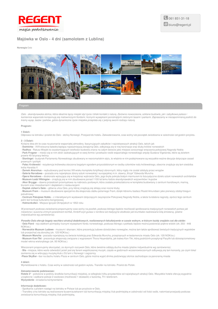 061 851-31-18 [email protected] Majówka w Oslo - 4 dni (samolotem z Lublina) Norwegia Oslo Program Oslo - skandynawska stolica, która idealnie łączy miejski styl życia i bliski kontakt z naturą. Zarówno nowoczesne, szklane budowle, jak i zabytkowe pałace i kamienice wspaniale komponują się malowniczymi fiordami, licznymi wysepkami porośniętymi zielonymi lasami i parkami. Zapraszamy w niezapomnianą podróż do krainy wysp, lasów i parków, gdzie dynamiczne życie miejskie przeplata się z jedyną swoim rodzaju naturą. Program: 1 Dzień: Odprawa na lotnisku i przelot do Oslo - stolicy Norwegii. Przejazd do hotelu. Zakwaterowanie, czas wolny lub początek zwiedzania w zależności od godzin przylotu. 2 - 3 Dzień: Kolejne dwa dni to czas na poznanie wspaniałej atmosfery, fascynujących zabytków i najciekawszych atrakcji Oslo, takich jak - Domkirke - XVII wieczna katedra będąca najważniejszą świątynią Oslo, odbywają się w niej koronacje oraz śluby królów norweskich - Radhus - Ratusz Miejski to oszałamiających wielkości budowla znana na całym świecie jako miejsce corocznego wręczania pokojowej Nagrody Nobla - Park Frogner – mieści się w nim zbiór zaskakujących w swej formie i przekazie rzeźb wspaniałego norweskiego artysty Gustava Vigelanda, które są dziełem prawie 40 lat pracy twórcy - Stortinget - budynek Parlamentu Norweskiego zbudowany w neoromańskim stylu, to właśnie w nim podejmowane są wszystkie ważne decyzje dotyczące zasad prawnych i polityki - Pałac Królewski - rezydencja królewska otoczona bogatym ogrodem przyozdobionym w rzeźby członków rodu królewskiego, obecnie znajduje się tam siedziba króla Haralda V - Zamek Akershus – wybudowany pod koniec XIII wieku kompleks fortyfikacji obronnych, który nigdy nie został zdobyty przez wrogów - Galeria Narodowa – posiada ona największe zbiory sztuki norweskiej i europejskiej m.in. sławny „Krzyk” Edwarda Muncha - Opera Narodowa – doskonale wpisująca się w krajobraz wybrzeża Oslo, jego bryła pokryta białym marmurem to futurystyczne dzieło sztuki norweskich architektów - Muzeum Łodzi Wikingów – znajdują się w nim zbudowane ponad 1100 lat temu łodzie skandynawskich wojowników i kupców - Aker Brygge – dawna przestrzeń przemysłowa na nabrzeżu portowym, która została przekształcona w kompleks budowlany z centrum handlowym, mariną, biurami oraz mieszkaniami i deptakiem z restauracjami - Deptak Johan’s Gate – główna ulica Oslo, przy której znajdują się sklepy oraz nocne kluby - Muzeum Fram – muzeum zbudowane specjalnie dla eksponatu statku polarnego Fram, dzięki któremu badacz Roald Amundsen jako pierwszy zdobył biegun południowy - Centrum Pokojowe Nobla – z interaktywnymi wystawami dotyczącymi zwycięzców Pokojowej Nagrody Nobla, a także fundatora nagrody, oprócz tego centrum pełni też funkcję kulturalno-kongresową - Holmenkollen - Miejsce Igrzysk Olimpijskich w 1952 roku W przerwach podczas zwiedzania proponujemy czas wolny na posiłek, podczas którego będzie możliwość spróbowania tradycyjnych norweskich potraw jak niesolona i suszona zimnym powietrzem torrfisk, finnbiff czyli gulasz z renifera lub tradycyjne słodkości jak krumkake nadziewane bitą śmietaną. (płatne indywidualnie wg zamówienia). Ponadto Oslo oferuje bogaty wachlarz atrakcji dodatkowych, realizowanych fakultatywnie w czasie wolnym, w którym każdy znajdzie coś dla siebie: - Oslo Fiord - rejs statkiem pomiędzy licznymi wysepkami fiordu norweskiego, podczas którego z pokładu będzie można podziwiać piękne widoki (ok. 203 - 448 NOK/os.) - Norweskie Muzeum Ludowe - muzeum i skansen, które prezentują ludowe dziedzictwo norwegów, można tam także spróbować świeżych tradycyjnych wypieków lub przejechać się dorożką (ok. 125 NOK/os.) - Muzeum Muncha - posiada największą na świecie kolekcję prac Edwarda Muncha, przepisanych w testamencie miastu Oslo (ok. 120 NOK/os.) - Muzeum Kon-Tiki - prezentuje eksponaty związane z wyprawami Thora Heyerdahla, jak tratwa Kon-Tiki, którą podróżnik przepłynął Pacyfik lub dziesięciometrowy model rekina wielorybiego (ok. 95 NOK/os.) Wieczorami proponujemy skorzystać, ze słynnych rozrywek Oslo, które świetnie oddają ducha miasta (płatne indywidualnie wg zamówienia): - Bla - miejsce, które warto odwiedzić jeżeli jest się fanem współczesnej muzyki, często w godzinach wczesnowieczornych odbywają się tam koncerty, po czym lokal zamienia się w wibrujący muzyką klub z DJ’ami z Norwegii i zagranicy -Plaza SkyBar - bar na dachu hotelu Plaza w centrum Oslo, gdzie można wypić drinka podziwiając słońce zachodzące za panoramą miasta 4 dzień: Wymeldowanie z hotelu. Czas wolny w zależności od godzin wylotu. Transfer na lotnisko. Przelot do Polski. Zakwaterowanie podstawowe: Hotele 3* - położone w pobliżu środków komunikacji miejskiej, w odległości kilku przystanków od największych atrakcji Oslo. Wszystkie hotele oferują wygodnie urządzone i zadbane pokoje 2 osobowe (możliwość 1 dostawki) z łazienką, TV i telefonem. Wyżywienie - śniadania kontynentalne Informacje dodatkowe: - Spotkanie z pilotem nastąpi na lotnisku w Polsce lub po przylocie w Oslo. - Transfery z/na lotnisko są realizowane busem/autokarem lub komunikacją miejską i/lub podmiejską w zależności od ilości osób, natomiast przejazdy podczas zwiedzania komunikacją miejską i/lub podmiejską. - Kolejność dni zwiedzania może ulec zmianie. - Pilot nie oprowadza wewnątrz obiektów. - W przypadku wylotu z Oslo w godzinach porannych zamiast śniadania może być wydany pakiet śniadaniowy. - Linia lotnicza i godziny przelotów mogą ulec zmianie. - „Single” - bez dopłaty, przy dokwaterowaniu do pokoju 2 lub 3 osobowego (opcja na zapytanie). - „Zniżki dla dzieci” - dotyczą dziecka do 12 lat zakwaterowanego wspólnie z 2 osobami pełnopłatnymi. WAŻNE: Bardzo prosimy o dokładne wype