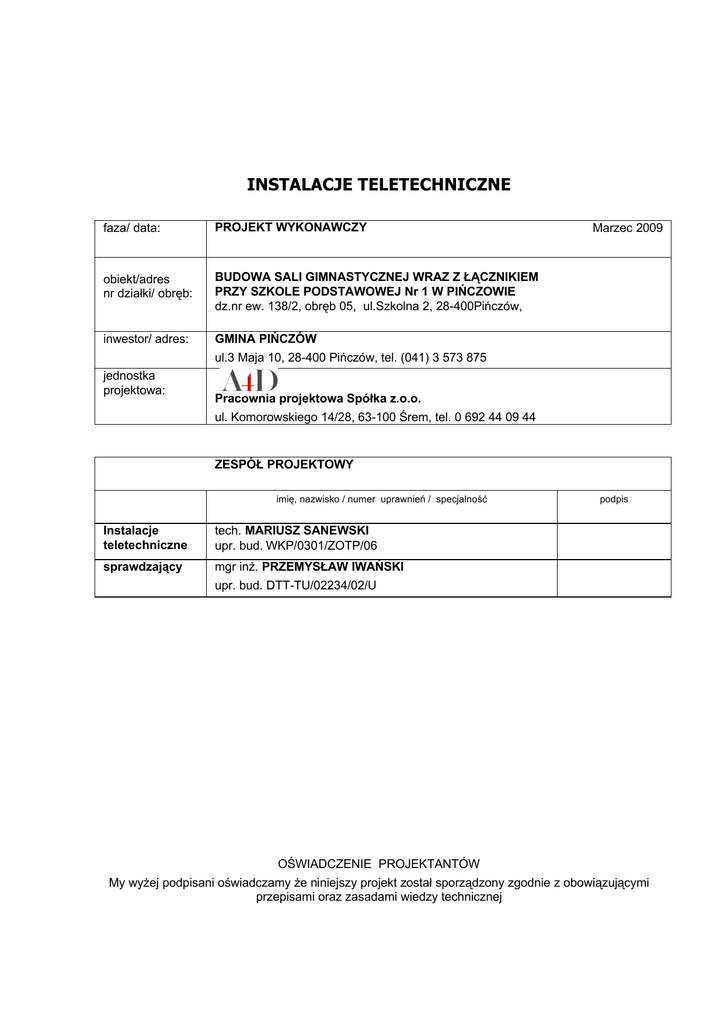 INSTALACJE TELETECHNICZNE faza/ data: PROJEKT WYKONAWCZY obiekt/adres nr działki/ obręb: BUDOWA SALI GIMNASTYCZNEJ WRAZ Z ŁĄCZNIKIEM PRZY SZKOLE PODSTAWOWEJ Nr 1 W PIŃCZOWIE dz.nr ew. 138/2, obręb 05, ul.Szkolna 2, 28-400Pińczów, inwestor/ adres: GMINA PIŃCZÓW Marzec 2009 ul.3 Maja 10, 28-400 Pińczów, tel. (041) 3 573 875 jednostka projektowa: Pracownia projektowa Spółka z.o.o. ul. Komorowskiego 14/28, 63-100 Śrem, tel. 0 692 44 09 44 ZESPÓŁ PROJEKTOWY imię, nazwisko / numer uprawnień / specjalność Instalacje teletechniczne tech. MARIUSZ SANEWSKI upr. bud. WKP/0301/ZOTP/06 sprawdzający mgr inż. PRZEMYSŁAW IWAŃSKI podpis upr. bud. DTT-TU/02234/02/U OŚWIADCZENIE PROJEKTANTÓW My wyżej podpisani oświadczamy że niniejszy projekt został sporządzony zgodnie z obowiązującymi przepisami oraz zasadami wiedzy technicznej Strona 2 SPIS TRE CI 1 2 3 4 5 6 DANE OGÓLNE ..........................................................................................................................................3 1.1 Inwestor ..............................................................................................................................................3 1.2 Wykonawca dokumentacji ..................................................................................................................3 1.3 Podstawa opracowania.......................................................................................................................3 1.4 Przedmiot opracowania ......................................................................................................................3 1.5 Projekty zwi zane...............................................................................................................................3 OPIS TECHNICZNY SIECI STRUKTURALNEJ .........................................................................................4 2.1 Stan projektowany ..............................................................................................................................4 2.2 Monta sieci strukturalnej ...................................................................................................................4 2.3 Numeracja punktów PEL ....................................................................................................................4 OPIS TECHNICZNY INSTALACJI TABLICY WYNIKÓW ...........................................................................5 3.1 Stan projektowany ..............................................................................................................................5 3.2 Monta tablicy wyników ......................................................................................................................5 OPIS TECHNICZNY INSTALACJI PRZYZYWOWEJ .................................................................................6 4.1 Stan projektowany ..............................................................................................................................6 4.2 Monta instalacji przyzywowej............................................................................................................6 OPIS TECHNICZNY SYSTEMU SYGNALIZACJI W AMANIA ..................................................................6 5.1 Stan projektowany ..............................................................................................................................6 5.2 Monta systemu sygnalizacji w amania..............................................................................................7 OPIS TECHNICZNY SYSTEMU ODDYMIANIA .........................................................................................7 6.1 Stan projektowany ..............................................................................................................................7 6.2 Monta systemu oddymiania ..............................................................................................................7 7 UWAGI KO COWE ....................................................................................................................................8 8 ZESTAWIENIE MATERIA ÓW PODSTAWOWYCH..................................................................................9 8.1 Zestawienie materia ów podstawowych sieci strukturalnej ................................................................9 8.2 Zestawienie materia ów podstawowych tablicy wyników ...................................................................9 8.3 Zestawienie materia ów podstawowych instalacji przyzywowej .........................................................9 8.4 Zestawienie materia ów podstawowych systemu oddymiania .........................................................10 8.5 Zestawienie materia ów podstawowych systemu sygnalizacji w amania .........................................10 SPIS RYSUNKÓW Instalacje teletechniczne Rzut parteru .............................................................................................. rys. TT-01 Instalacje teletechniczne Rzut pi tra ................................................................................................ rys. TT-02 Schemat sieci strukturalnej .................................................................................................................. rys. TT-03 Schematy pozosta ych instalacji teletechnicznych ............................................................................... rys. TT-04 826 Instalacje teletechniczne Strona 3 1 DANE OGÓLNE 1.1 Inwestor Gmina Pi czów ul. 3 Maja 10 28-400 Pi czów 1.2 Wykonawca dokumentacji A4D Pracowania Projektowa Sp. z o.o. ul. Komorowskiego 14/28 63-100 rem 1.3 Podstawa opracowania zlecenie Inwestora, podk ady budowlane, obowi zuj ce normy i zasady projektowania instalacji teletechnicznych. 1.4 Przedmiot opracowania Przedmiotem opracowania niniejszego projektu jest projekt monta u instalacji teletechnicznych w sali gimnastycznej wraz z 1.5 cznikiem przy Szk