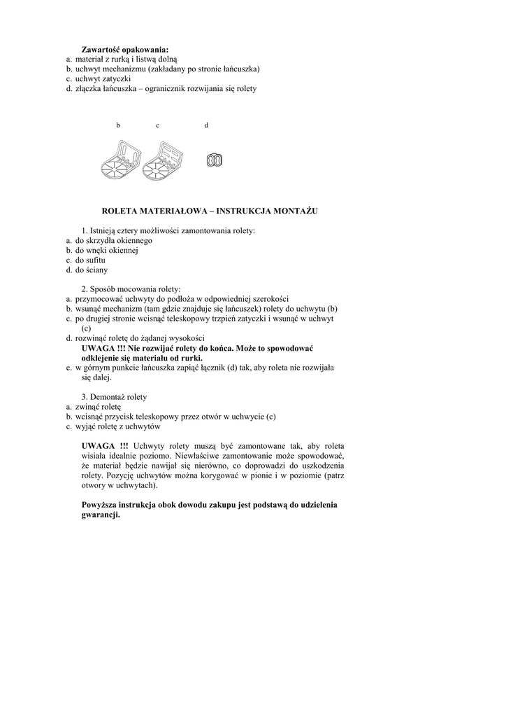 a. b. c. d. Zawartość opakowania: materiał z rurką i listwą dolną uchwyt mechanizmu (zakładany po stronie łańcuszka) uchwyt zatyczki złączka łańcuszka – ogranicznik rozwijania się rolety b c d ROLETA MATERIAŁOWA – INSTRUKCJA MONTAśU a. b. c. d. 1. Istnieją cztery moŜliwości zamontowania rolety: do skrzydła okiennego do wnęki okiennej do sufitu do ściany 2. Sposób mocowania rolety: a. przymocować uchwyty do podłoŜa w odpowiedniej szerokości b. wsunąć mechanizm (tam gdzie znajduje się łańcuszek) rolety do uchwytu (b) c. po drugiej stronie wcisnąć teleskopowy trzpień zatyczki i wsunąć w uchwyt (c) d. rozwinąć roletę do Ŝądanej wysokości UWAGA !!! Nie rozwijać rolety do końca. MoŜe to spowodować odklejenie się materiału od rurki. e. w górnym punkcie łańcuszka zapiąć łącznik (d) tak, aby roleta nie rozwijała się dalej. 3. DemontaŜ rolety a. zwinąć roletę b. wcisnąć przycisk teleskopowy przez otwór w uchwycie (c) c. wyjąć roletę z uchwytów UWAGA !!! Uchwyty rolety muszą być zamontowane tak, aby roleta wisiała idealnie poziomo. Niewłaściwe zamontowanie moŜe spowodować, Ŝe materiał będzie nawijał się nierówno, co doprowadzi do uszkodzenia rolety. Pozycję uchwytów moŜna korygować w pionie i w poziomie (patrz otwory w uchwytach). PowyŜsza instrukcja obok dowodu zakupu jest podstawą do udzielenia gwarancji.