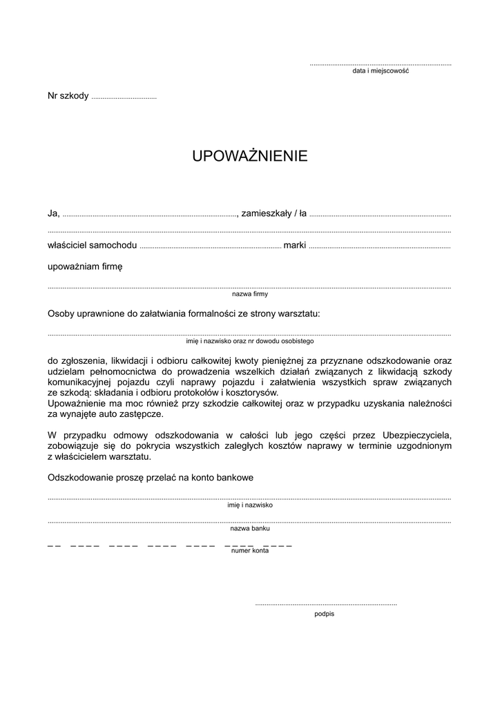............................................................................ data i miejscowość Nr szkody ................................... UPOWAŻNIENIE Ja, ............................................................................................., zamieszkały / ła ............................................................................ ........................................................................................................................................................................................................................ właściciel samochodu ............................................................................ marki ............................................................................ upoważniam firmę ........................................................................................................................................................................................................................ nazwa firmy Osoby uprawnione do załatwiania formalności ze strony warsztatu: ........................................................................................................................................................................................................................ imię i nazwisko oraz nr dowodu osobistego do zgłoszenia, likwidacji i odbioru całkowitej kwoty pieniężnej za przyznane odszkodowanie oraz udzielam pełnomocnictwa do prowadzenia wszelkich działań związanych z likwidacją szkody komunikacyjnej pojazdu czyli naprawy pojazdu i załatwienia wszystkich spraw związanych ze szkodą: składania i odbioru protokołów i kosztorysów. Upoważnienie ma moc również przy szkodzie całkowitej oraz w przypadku uzyskania należności za wynajęte auto zastępcze. W przypadku odmowy odszkodowania w całości lub jego części przez Ubezpieczyciela, zobowiązuje się do pokrycia wszystkich zaległych kosztów naprawy w terminie uzgodnionym z właścicielem warsztatu. Odszkodowanie proszę przelać na konto bankowe ........................................................................................................................................................................................................................ imię i nazwisko ........................................................................................................................................................................................................................ nazwa banku __ ____ ____ ____ ____ ____ ____ numer konta ............................................................................ podpis