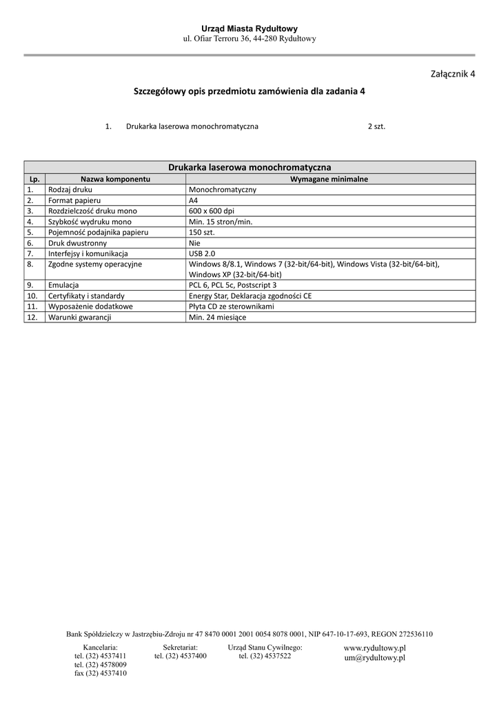 Urząd Miasta Rydułtowy ul. Ofiar Terroru 36, 44-280 Rydułtowy Załącznik 4 Szczegółowy opis przedmiotu zamówienia dla zadania 4 1. Drukarka laserowa monochromatyczna 2 szt. Drukarka laserowa monochromatyczna Lp. 1. 2. 3. 4. 5. 6. 7. 8. Nazwa komponentu Rodzaj druku Format papieru Rozdzielczość druku mono Szybkość wydruku mono Pojemność podajnika papieru Druk dwustronny Interfejsy i komunikacja Zgodne systemy operacyjne 9. 10. 11. 12. Emulacja Certyfikaty i standardy Wyposażenie dodatkowe Warunki gwarancji Wymagane minimalne Monochromatyczny A4 600 x 600 dpi Min. 15 stron/min. 150 szt. Nie USB 2.0 Windows 8/8.1, Windows 7 (32-bit/64-bit), Windows Vista (32-bit/64-bit), Windows XP (32-bit/64-bit) PCL 6, PCL 5c, Postscript 3 Energy Star, Deklaracja zgodności CE Płyta CD ze sterownikami Min. 24 miesiące Bank Spółdzielczy w Jastrzębiu-Zdroju nr 47 8470 0001 2001 0054 8078 0001, NIP 647-10-17-693, REGON 272536110 Kancelaria: tel. (32) 4537411 tel. (32) 4578009 fax (32) 4537410 Sekretariat: tel. (32) 4537400 Urząd Stanu Cywilnego: tel. (32) 4537522 www.rydultowy.pl [email protected]