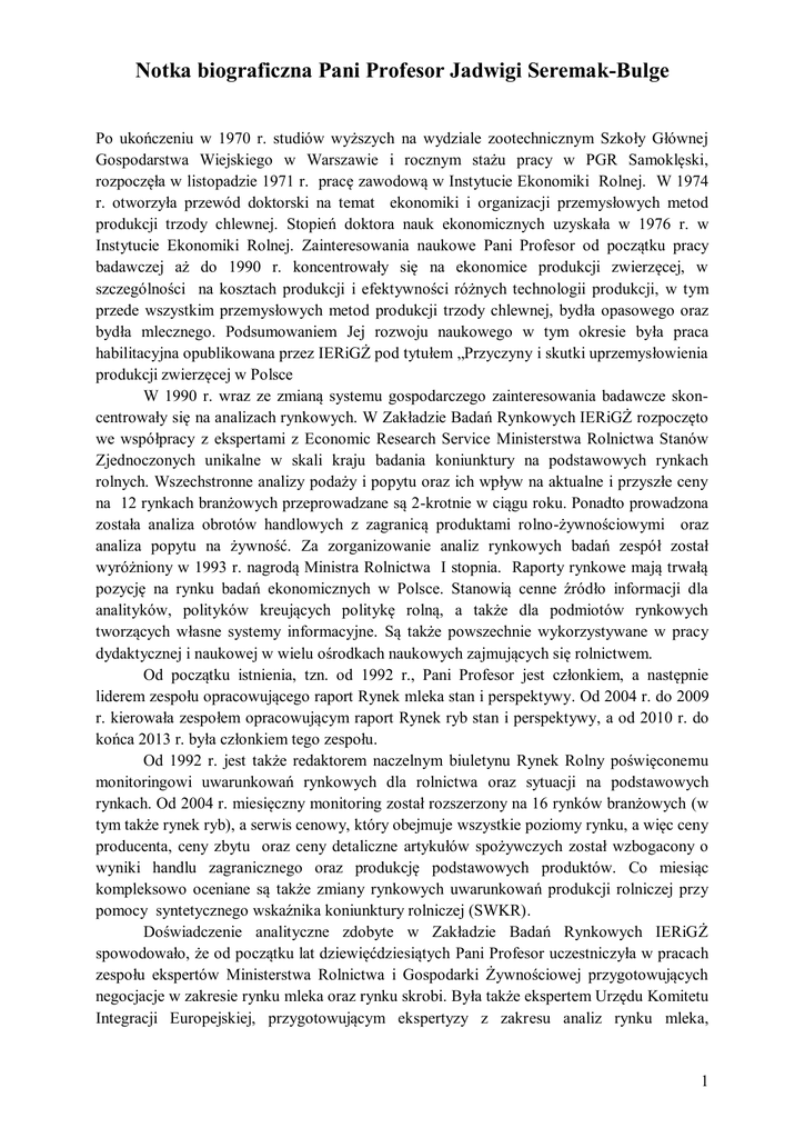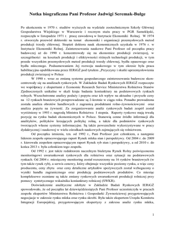 Notka biograficzna Pani Profesor Jadwigi Seremak-Bulge Po ukończeniu w 1970 r. studiów wyższych na wydziale zootechnicznym Szkoły Głównej Gospodarstwa Wiejskiego w Warszawie i rocznym stażu pracy w PGR Samoklęski, rozpoczęła w listopadzie 1971 r. pracę zawodową w Instytucie Ekonomiki Rolnej. W 1974 r. otworzyła przewód doktorski na temat ekonomiki i organizacji przemysłowych metod produkcji trzody chlewnej. Stopień doktora nauk ekonomicznych uzyskała w 1976 r. w Instytucie Ekonomiki Rolnej. Zainteresowania naukowe Pani Profesor od początku pracy badawczej aż do 1990 r. koncentrowały się na ekonomice produkcji zwierzęcej, w szczególności na kosztach produkcji i efektywności różnych technologii produkcji, w tym przede wszystkim przemysłowych metod produkcji trzody chlewnej, bydła opasowego oraz bydła mlecznego. Podsumowaniem Jej rozwoju naukowego w tym okresie była praca habilitacyjna opublikowana przez IERiGŻ pod tytułem „Przyczyny i skutki uprzemysłowienia produkcji zwierzęcej w Polsce W 1990 r. wraz ze zmianą systemu gospodarczego zainteresowania badawcze skoncentrowały się na analizach rynkowych. W Zakładzie Badań Rynkowych IERiGŻ rozpoczęto we współpracy z ekspertami z Economic Research Service Ministerstwa Rolnictwa Stanów Zjednoczonych unikalne w skali kraju badania koniunktury na podstawowych rynkach rolnych. Wszechstronne analizy podaży i popytu oraz ich wpływ na aktualne i przyszłe ceny na 12 rynkach branżowych przeprowadzane są 2-krotnie w ciągu roku. Ponadto prowadzona została analiza obrotów handlowych z zagranicą produktami rolno-żywnościowymi oraz analiza popytu na żywność. Za zorganizowanie analiz rynkowych badań zespół został wyróżniony w 1993 r. nagrodą Ministra Rolnictwa I stopnia. Raporty rynkowe mają trwałą pozycję na rynku badań ekonomicznych w Polsce. Stanowią cenne źródło informacji dla analityków, polityków kreujących politykę rolną, a także dla podmiotów rynkowych tworzących własne systemy informacyjne. Są także powszechnie wykorzystywane w pracy dydaktycznej i naukowej w wielu ośrodkach naukowych zajmujących się rolnictwem. Od początku istnienia, tzn. od 1992 r., Pani Profesor jest członkiem, a następnie liderem zespołu opracowującego raport Rynek mleka stan i perspektywy. Od 2004 r. do 2009 r. kierowała zespołem opracowującym raport Rynek ryb stan i perspektywy, a od 2010 r. do końca 2013 r. była członkiem tego zespołu. Od 1992 r. jest także redaktorem naczelnym biuletynu Rynek Rolny poświęconemu monitoringowi uwarunkowań rynkowych dla rolnictwa oraz sytuacji na podstawowych rynkach. Od 2004 r. miesięczny monitoring został rozszerzony na 16 rynków branżowych (w tym także rynek ryb), a serwis cenowy, który obejmuje wszystkie poziomy rynku, a więc ceny producenta, ceny zbytu oraz ceny detaliczne artykułów spożywczych został wzbogacony o wyniki handlu zagranicznego oraz produkcję podstawowych produktów. Co miesiąc kompleksowo oceniane są także zmiany rynkowych uwarunkowań produkcji rolniczej przy pomocy syntetycznego wskaźnika koniunktury rolniczej (SWKR). Doświadczenie analityczne zdobyte w Zakładzie Badań Rynkowych IERiGŻ spowodowało, że od początku lat dziewięćdziesiątych Pani Profesor uczestniczyła w pracach zespołu ekspertów Ministerstwa Rolnictwa i Gospodarki Żywnościowej przygotowujących negocjacje w zakresie rynku mleka oraz rynku skrobi. Była także ekspertem Urzędu Komitetu Integracji Europejskiej, przygotowującym ekspertyzy z zakresu analiz rynku mleka, 1 możliwości liberalizacji tego rynku i wpływu likwidacji kwot mlecznych na możliwości rozwojowe sektora mlecznego. W latach 1997 – 1999 była członkiem zespołu doradców Prezesa Agencji Rynku Rolnego. W latach 1999-2003 pracowała w ARR na stanowisku zastępcy Prezesa ARR, a następnie dyrektora Biura Integracji z Unią Europejską - aktywnie uczestnicząc w przygotowaniu Agencji do pełnienia funkcji agencji płatniczej odpowiedzialnej za administrowanie wszystkimi instrumentami Wspólnej Polityki Rolnej adresowanymi do rynku. W 2003 r. Pani Profesor powróciła do pracy naukowej w IERiGŻ, gdzie kontynuuje prace związane z analizami rynkowymi. W ramach programów wieloletnich: „Ekonomiczne i społeczne uwarunkowania rozwoju polskiej gospodarki żywnościowej po wstąpieniu Polski do Unii Europejskiej” oraz „Konkurencyjność polskiej gospodarki żywnościowej w warunkach globalizacji i integracji europejskiej” kierowała pracami związanymi z monitorowaniem oraz analizą zmian polskiego łańcucha żywnościowego i jego związkami z rynkiem światowym. W ramach realizacji tych tematów w latach 2005 – 2012 przygotowanych zostało pod Jej redakcją naukową 7 monografii: Rozwój rynku mleczarskiego i zmiany jego funkcjonowania w latach 1990 – 2005, Ewolucja rynku zbożowego i jej wpływ na proces transmisji cen, Rynek ziemniaka i ewolucja jego funkcjonowania oraz wpływ na proces transmisji cen, Ewolucja rynku mięsnego i jej wpływ na proces transmisji cen, Rozwój rynku ryb i zmiany jego funkcjonowania w latach 1990-2007, Ewolucja podstawowych rynków rolnych i jej wpływ na transmisję cen w latach 19902008, Światowy rynek mleka i jego wpływ na polskie mleczarstwo po zniesieniu kwot mlecznych. Ponadto prowadzone przez zespół badawczy ZBR analizy rynkowe stały się podstawą do opracowania pod redakcją naukową Pani Profesor dwóch monografii: Podstawowe rynki rolne w pierwszym roku po integracji Polski z Unią Europejską, Handel zagraniczny produktami rolno-spożywczymi w latach 1995-2009. Od wielu lat jest członkiem zespołu ekspertów Agencji Rynku Rolnego ds. prognozowania cen skupu podstawowych produktów rolnych, a także zespołu ekspertów Narodowego Banku Polskiego ds. prognozowania cen detalicznych żywności. Łącznie w dorobku naukowym uzyskanym w trakcie pracy w Instytucie Ekonomiki Rolnictwa i Gospodarki Żywnościo