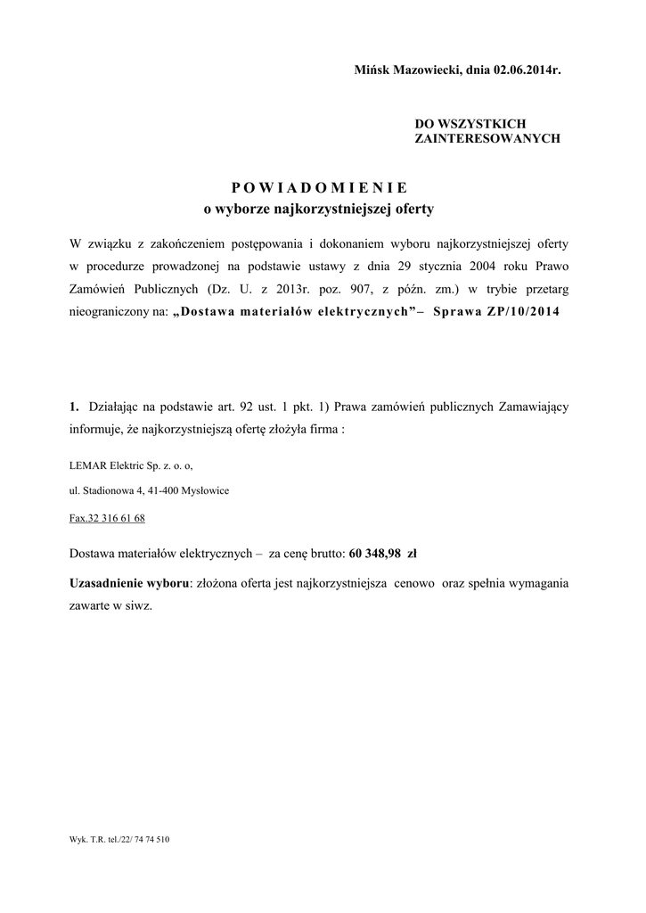 Mińsk Mazowiecki, dnia 02.06.2014r. DO WSZYSTKICH ZAINTERESOWANYCH POWIADOMIENIE o wyborze najkorzystniejszej oferty W związku z zakończeniem postępowania i dokonaniem wyboru najkorzystniejszej oferty w procedurze prowadzonej na podstawie ustawy z dnia 29 stycznia 2004 roku Prawo Zamówień Publicznych (Dz. U. z 2013r. poz. 907, z późn. zm.) w trybie przetarg nieograniczony na: „Dostawa materiałów elektrycznych” – Sprawa ZP/10/2014 1. Działając na podstawie art. 92 ust. 1 pkt. 1) Prawa zamówień publicznych Zamawiający informuje, że najkorzystniejszą ofertę złożyła firma : LEMAR Elektric Sp. z. o. o, ul. Stadionowa 4, 41-400 Mysłowice Fax.32 316 61 68 Dostawa materiałów elektrycznych – za cenę brutto: 60 348,98 zł Uzasadnienie wyboru: złożona oferta jest najkorzystniejsza cenowo oraz spełnia wymagania zawarte w siwz. Wyk. T.R. tel./22/ 74 74 510 Streszczenie oceny i porównanie złożonych ofert: Zadanie Nazwa i adres wykonawcy Punkty przyznane ofercie w ustalonym w siwz kryterium Tech Trade Sp. Jawna Dostawa materiałów elektrycznych A Wojtczyk, H Nowak 45-205 Opole, ul Budowlanych 6 Oferta odrzucona na podstawie art.89 ust.1 pkt 2 ustawy PZP ELKOND Sp. z. o. o Dostawa materiałów elektrycznych Dostawa materiałów elektrycznych 15-399 Białystok ul. Handlowa 6c ELEKTROSKANDIA POLSKA SP. Z. o. o, 61- 248 Poznań, ul Dziadoszańska10 83,88 pkt Oferta odrzucona na podstawie art.89 ust.1 pkt 2 ustawy PZP Dostawa materiałów elektrycznych LEMAR Elektric Sp. z. o. o, ul. Stadionowa 4,41-400 Mysłowice Dostawa materiałów elektrycznych DOKO Sp. Z. o. o ul. Lidzbarska 2 87-300 Brodnica Oferta odrzucona na podstawie art.89 ust 1 pkt 1 Dostawa materiałów elektrycznych Przedsiębiorstwo el 12 Sp. Z. o. o ul. Świętej Anny 5 45-117 Opole Oferta odrzucona na podstawie art.89 ust.1 pkt 2 ustawy PZP Dostawa materiałów elektrycznych Wyk. T.R. tel./22/ 74 74 510 Przedsiębiorstwo Produkcyjno Handlowo Usługowe ,,ELDOR’’ Łukasz Baranowski 18-400 Łomża , Ul Poznańska 125 100 pkt Oferta odrzucona na podstawie art.89 ust.1 pkt 2 ustawy PZP Dostawa materiałów elektrycznych ELPIN Artykuły Elektryczne 05-300 Mińsk Mazowiecki ul. Spółdzielcza 7 Oferta odrzucona na podstawie art.89 ust.1 pkt 5 ustawy PZP Dostawa materiałów elektrycznych BTS 2 Hurtownia Elektrotechniczna Robert Szymański 18-402 Łomża, ul. Poznańska 43 Oferta odrzucona na podstawie art.89 ust.1 pkt 2 ustawy PZP 2. Działając na podstawie art. 92 ust. 1 pkt. 2) Prawa zamówień publicznych Zamawiający informuje, że w prowadzonym postępowaniu zostały odrzucone oferty firm. 2.1) ELPIN Artykuły Elektryczne; 05-300 Mińsk Mazowiecki ul. Spółdzielcza 7 Podstawa Prawna odrzucenia oferty Wykonawcy Art. 89 ust.1 pkt 5 – została złożona przez Wykonawcę wykluczonego z udziału w postepowaniu o udzielenie zamówienia. Uzasadnienie faktyczne: W związku z przedłużającą się procedurą zakończenia postępowania w dniu 30. 04.2014r . Zamawiający Zwrócił się z wnioskiem do Wykonawców o przedłużenie terminu związania ofertą o 60 dni. Wykonawca ELPIN Artykuły Elektryczne nie udzielił odpowiedzi na wniosek . Brak odpowiedzi na wniosek Zamawiającego o wyrażenie zgody na przedłużenie terminu związania ofertą o czas oznaczony potraktowany został przez Zamawiającego jako brak zgody Wykonawcy na przedłużenie terminu związania oferta i skutkuje wykluczeniem z postępowania o udzielenie Zamówienia zgodnie z art.24 ust 2 pkt 2 ustawy PZP. Oferta Wykonawcy wykluczonego z postępowania zostaje odrzucona zgodnie z art.24 ust 4 2.2) ELEKTROSKANDIA POLSKA SP. Z. o. o, 61- 248 Poznań, ul Dziadoszańska10 Podstawa Prawna odrzucenia oferty Wykonawcy Art. 89 ust 1 pkt.2 – jej treść nie odpowiada treści SIWZ, z zastrzeżeniem art.87 ust.2 pkt.3; Uzasadnienie faktyczne: Zgodnie z rozdziałem VI pkt 1 ppkt. 1.4 siwz – w celu potwierdzenia, że oferowane dostawy spełniają wymagania określone przez Zamawiającego należy dostarczyć: b) opisu produktu w formie niezbędnego certyfikatu dopuszczenia do obrotu handlowego na terenie Polski i stosowania w budownictwie(CE, ITB, CIOP, Deklaracja zgodności producenta, Karta techniczna materiału) . Dokumenty te wymagane będą od wykonawcy którego oferta będzie wybrana i z którym Zamawiający zawrze umowę, a także na każde żądanie Zamawiającego w trakcie oceny ofert. W dniu 20.05.2014r. Zamawiający zwrócił się z pismem do Wykonawcy wzywając na podstawie art. 26 ust 3 ustawy Prawa Zamówień Publicznych do uzupełnienia w/w dokumentów potwierdzających wymagania Zamawiającego w terminie do 26.05.2014r. do godziny 12:00. Wyk. T.R. tel./22/ 74 74 510 Wykonawca w określonym terminie nie uzupełnił wymaganych dokumentów tym samym spełniona została przesłanka odrzucenia oferty. 2.3) Przedsiębiorstwo Produkcyjno Handlowo Usługowe ,,ELDOR’’; Łukasz Baranowski 18-400 Łomża ,ul Poznańska 125 Podstawa Prawna odrzucenia oferty Wykonawcy Art. 89 ust 1 pkt.2 – jej treść nie odpowiada treści SIWZ, z zastrzeżeniem art.87 ust.2 pkt.3; Uzasadnienie faktyczne: Zgodnie z rozdziałem VI pkt 1 ppkt. 1.4 siwz – w celu potwierdzenia, że oferowane dostawy spełniają wymagania określone przez Zamawiającego należy dostarczyć: b) opisu produktu w formie niezbędnego certyfikatu dopuszczenia do obrotu handlowego na terenie Polski i stosowania w budownictwie(CE, ITB, CIOP, Deklaracja zgodności producenta, Karta techniczna materiału) . Dokumenty te wymagane będą od wykonawcy którego oferta będzie wybrana i z którym Zamawiający zawrze umowę, a także na każde żądanie Zamawiającego w trakcie oceny ofert. W dniu 20.05.2014r. Zamawiający zwrócił się z pismem do Wykonawcy wzywając na podstawie art. 26 ust 3 ustawy Prawa Zamówień Publicznych do uzupełnienia w/w dokumentów potwierdzających wymagania Zamawiającego w terminie do 26.05.2014r. do godziny 12:00. Wykonawca w określonym terminie nie uzup