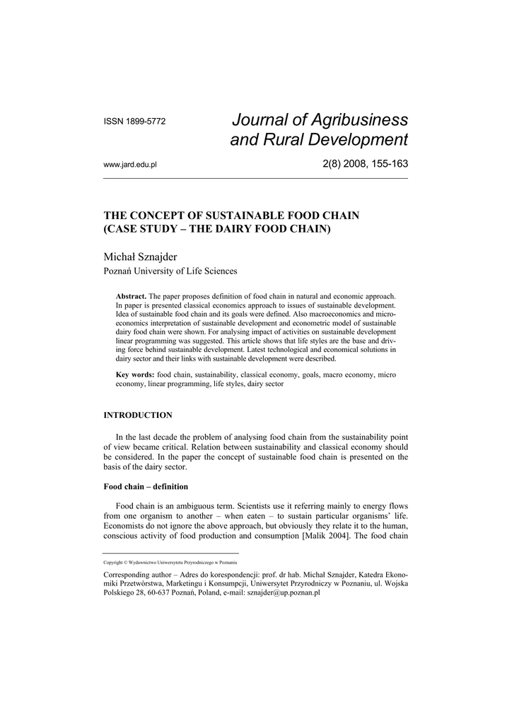 ISSN 1899-5772 Journal of Agribusiness and Rural Development www.jard.edu.pl 2(8) 2008, 155-163 THE CONCEPT OF SUSTAINABLE FOOD CHAIN (CASE STUDY – THE DAIRY FOOD CHAIN) Michał Sznajder Poznań University of Life Sciences Abstract. The paper proposes definition of food chain in natural and economic approach. In paper is presented classical economics approach to issues of sustainable development. Idea of sustainable food chain and its goals were defined. Also macroeconomics and microeconomics interpretation of sustainable development and econometric model of sustainable dairy food chain were shown. For analysing impact of activities on sustainable development linear programming was suggested. This article shows that life styles are the base and driving force behind sustainable development. Latest technological and economical solutions in dairy sector and their links with sustainable development were described. Key words: food chain, sustainability, classical economy, goals, macro economy, micro economy, linear programming, life styles, dairy sector INTRODUCTION In the last decade the problem of analysing food chain from the sustainability point of view became critical. Relation between sustainability and classical economy should be considered. In the paper the concept of sustainable food chain is presented on the basis of the dairy sector. Food chain – definition Food chain is an ambiguous term. Scientists use it referring mainly to energy flows from one organism to another – when eaten – to sustain particular organisms’ life. Economists do not ignore the above approach, but obviously they relate it to the human, conscious activity of food production and consumption [Malik 2004]. The food chain Copyright © Wydawnictwo Uniwersytetu Przyrodniczego w Poznaniu Corresponding author – Adres do korespondencji: prof. dr hab. Michał Sznajder, Katedra Ekonomiki Przetwórstwa, Marketingu i Konsumpcji, Uniwersytet Przyrodniczy w Poznaniu, ul. Wojska Polskiego 28, 60-637 Poznań, Poland, e-mail: [email protected] 156 M. Sznajder may consist of several links, e.g. food production, assembling (collection), processing, storage, trading and finally purchase of food. Raw agricultural products while moving through the food chain are processed, packed, merchandised and finally consumed. Classical economy and sustainability Classical, liberal economists expect that the food chain has to provide maximum return on the capital invested in the chain. In fact, environmental and social issues are considered as limiting factors or constraints. Some environment elements are treated as free goods which do not cost anything – for example air. The dispute over the way to include ecological, environmental and social aspects in economic models, calculations and considerations has always been very important. Linear programming, a very popular mathematical method in the second half of the 20th century, seemed to be the best method for merging ecology and the environment into the economic model to maximize profit. The concept of sustainability may enrich classical economy with environmental and social aspects. Some people believe that the concept of sustainability is the UE self-defence theory, necessary in WTO negotiations to protect the European Model of Agriculture. They even forecast the theory should collapse under the free market regime. As it was said, economists have discussed environmental issues for a very long time. Maybe the concept of sustainability is the right one economists have been looking for. Economists, including the author, who had lived under centrally planned economy for years, remember that communists tried to practice a kind of sustainability, hidden behind such key words as equality and harmonious development. Neither equality nor harmonious development have ever been achieved. It is evident that the terms at most may express the human willingness and may only direct the way of development. Strong backward and independent processes have always created a new big inequality and disharmony. The final result of centrally planned economy was disastrous. The author’s personal experience indicates that we have to be aware that sustainability may trigger strong backward processes. Sustainable food chain As it is widely known, sustainability may be linked to institutions, economy and ecology. The following three elements play a key role here: sustainability, durability and balance. All these above involved in the food chain result in sustained development. Food chain directed toward sustainability or considered as sustainable must achieve environmental, nutritional, economic and social goals. Goals of the sustainable food chain The food chain classified as sustainable should lead to the following clusters of objectives: A. Environmental objectives: 1) air pollution control, 2) water pollution control, 3) soil pollution control, Journal of Agribusiness and Rural Development The concept of sustainable food chain (case study – the dairy food chain) 157 4) noise pollution control, 5) protection against radiation. B. Nutritional objectives: 1) providing enough food for mankind, 2) providing nutritious food (macro- and microelements), 3) providing safe food, 4) providing stable food delivery, 5) providing food in time and place required by consumers. C. Economic objectives: 1) achievement of equality point between supply and demand, 2) ensuring moderate food prices, 3) maintenance of job posts, 4) maximization of added value, 5) maximization of return on investment. D. Social objectives: 1) ensuring a good standard of life for families of farmers, processors, traders and all involved in the food chain, 2) promotion of good interpersonal relations between people involved in the food chain, 3) promotion of good health of all food consumers, 4) promotion of prolonged lifespan of all food consumers. The concept of sustainability leads to many other goals, which not necessary concern the food chai