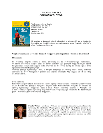 WANDA WITTER FOTOGRAFIA NIEBA Wydawnictwo: Świat Książki ISBN: 978-83-247-0865-9 Format: 130 x 205 mm Oprawa: twarda Wydanie:1 Liczba stron: 256 III miejsce w kategorii książek dla dzieci w wieku 6-10 lat w Konkursie literackim im. Astrid Lindgren zorganizowanym przez Fundację ABCXXI Cała Polska czyta dzieciom. Ciepła i wzruszająca opowieść o dzieciach ratujących przed upadkiem schronisko dla zwierząt Streszczenie Po rodzinnej tragedii Tomek z mamą przenoszą się do podwarszawskiego Konstancina. W obcym środowisku chłopiec czuje się bardzo samotny: jego jedynym przyjacielem jest aparat fotograficzny, którym robi zdjęcia nieba. Pozwala mu to oswoić pustkę po śmierci ojca i brata i poczuć z nimi metafizyczną więź. Wkrótce poznaje tajemniczego Bena, z którym podejmuje się trudnej misji: muszą uratować schronisko dla psów. Pomaga im w tym rezolutna kuzynka z Ameryki. Aby osiągnąć ten cel, nie cofną się przed niczym… Nota z okładki Samotne wakacje w obcym mieście to nie jest nic fajnego. Dziesięcioletni Tomek musi przeprowadzić się do Konstancina, pożegnać kolegów i znajome kąty. Nieoczekiwanie wszystko się zmienia za sprawą tajemniczego przyjaciela Bena i małej Vicky, rezolutnej kuzynki z Ameryki. To z nimi Tomek podejmie się ważnej misji uratowania podupadającego schroniska dla bezdomnych psów i pozwoli się porwać niezwykłej przygodzie. Wanda Witter – urodzona 1943, jest prawniczką i dziennikarką. Zadebiutowała powieścią dla młodzieży "Przebiegniesz przez lato". Jej kolejne powieści to: „Stan zawieszenia”, „Sarna”, „Trzecia próba lotu” i „Właściwe życie”. Była laureatką i zdobywczynią pierwszych nagród na prestiżowych konkursach literackich na polską powieść współczesną. Oprócz pisarstwa zajmuje się także publicystyką kulturalną i krytyką literacką.