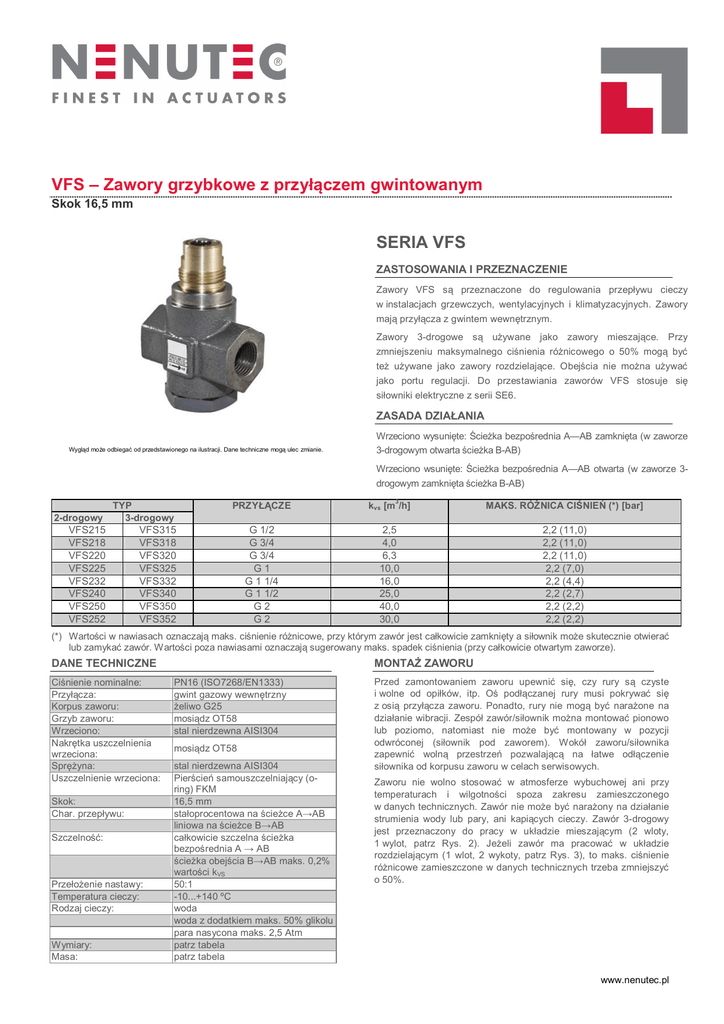 VFS – Zawory grzybkowe z przyłączem gwintowanym Skok 16,5 mm SERIA VFS ZASTOSOWANIA I PRZEZNACZENIE Zawory VFS są przeznaczone do regulowania przepływu cieczy w instalacjach grzewczych, wentylacyjnych i klimatyzacyjnych. Zawory mają przyłącza z gwintem wewnętrznym. Zawory 3-drogowe są używane jako zawory mieszające. Przy zmniejszeniu maksymalnego ciśnienia różnicowego o 50% mogą być też używane jako zawory rozdzielające. Obejścia nie można używać jako portu regulacji. Do przestawiania zaworów VFS stosuje się siłowniki elektryczne z serii SE6. ZASADA DZIAŁANIA Wygląd może odbiegać od przedstawionego na ilustracji. Dane techniczne mogą ulec zmianie. Wrzeciono wysunięte: Ścieżka bezpośrednia A—AB zamknięta (w zaworze 3-drogowym otwarta ścieżka B-AB) Wrzeciono wsunięte: Ścieżka bezpośrednia A—AB otwarta (w zaworze 3drogowym zamknięta ścieżka B-AB) 2-drogowy TYP 3-drogowy VFS215 VFS218 VFS220 VFS225 VFS232 VFS240 VFS250 VFS252 3 PRZYŁĄCZE kvs [m /h] MAKS. RÓŻNICA CIŚNIEŃ (*) [bar] G 1/2 G 3/4 G 3/4 G1 G 1 1/4 G 1 1/2 G2 G2 2,5 4,0 6,3 10,0 16,0 25,0 40,0 30,0 2,2 (11,0) 2,2 (11,0) 2,2 (11,0) 2,2 (7,0) 2,2 (4,4) 2,2 (2,7) 2,2 (2,2) 2,2 (2,2) VFS315 VFS318 VFS320 VFS325 VFS332 VFS340 VFS350 VFS352 (*) Wartości w nawiasach oznaczają maks. ciśnienie różnicowe, przy którym zawór jest całkowicie zamknięty a siłownik może skutecznie otwierać lub zamykać zawór. Wartości poza nawiasami oznaczają sugerowany maks. spadek ciśnienia (przy całkowicie otwartym zaworze). DANE TECHNICZNE Ciśnienie nominalne: Przyłącza: Korpus zaworu: Grzyb zaworu: Wrzeciono: Nakrętka uszczelnienia wrzeciona: Sprężyna: Uszczelnienie wrzeciona: Skok: Char. przepływu: Szczelność: Przełożenie nastawy: Temperatura cieczy: Rodzaj cieczy: Wymiary: Masa: MONTAŻ ZAWORU PN16 (ISO7268/EN1333) gwint gazowy wewnętrzny żeliwo G25 mosiądz OT58 stal nierdzewna AISI304 mosiądz OT58 stal nierdzewna AISI304 Pierścień samouszczelniający (oring) FKM 16,5 mm stałoprocentowa na ścieżce A→AB liniowa na ścieżce B→AB całkowicie szczelna ścieżka bezpośrednia A → AB ścieżka obejścia B→AB maks. 0,2% wartości kVS 50:1 -10...+140 ºC woda woda z dodatkiem maks. 50% glikolu para nasycona maks. 2,5 Atm patrz tabela patrz tabela Przed zamontowaniem zaworu upewnić się, czy rury są czyste i wolne od opiłków, itp. Oś podłączanej rury musi pokrywać się z osią przyłącza zaworu. Ponadto, rury nie mogą być narażone na działanie wibracji. Zespół zawór/siłownik można montować pionowo lub poziomo, natomiast nie może być montowany w pozycji odwróconej (siłownik pod zaworem). Wokół zaworu/siłownika zapewnić wolną przestrzeń pozwalającą na łatwe odłączenie siłownika od korpusu zaworu w celach serwisowych. Zaworu nie wolno stosować w atmosferze wybuchowej ani przy temperaturach i wilgotności spoza zakresu zamieszczonego w danych technicznych. Zawór nie może być narażony na działanie strumienia wody lub pary, ani kapiących cieczy. Zawór 3-drogowy jest przeznaczony do pracy w układzie mieszającym (2 wloty, 1 wylot, patrz Rys. 2). Jeżeli zawór ma pracować w układzie rozdzielającym (1 wlot, 2 wykoty, patrz Rys. 3), to maks. ciśnienie różnicowe zamieszczone w danych technicznych trzeba zmniejszyć o 50%. www.nenutec.pl VFS – Zawory grzybkowe z przyłączem gwintowanym Skok 16,5 mm INSTALOWANIE Połączenia rurowe Kierunek przepływu cieczy musi być zgodny z oznaczeniami umieszczonymi na korpusie zaworu (patrz rysunki). Port AB jest zawsze portem wylotowym. W zaworze 2-drogowym portem wlotowym jest port A, natomiast w zaworze 3-drogowym portami wlotowymi są porty A i B. Zawór 2-drogowy Zawór 3-drogowy Rys. 1 Zawór 2-drogowy Rys. 2 Zawór 3-drogowy w układzie mieszającym Rys. 3 Zawór 3-drogowy w układzie rozdzielającym CHARAKTERYSTYKA PRZEPŁYWU Przepływ A-AB stałoprocentowa B-AB (obejście) liniowa Zawór 3-drogowy w układzie mieszającym: wloty A i B, wylot AB Zawór 3-drogowy w układzie rozdzielającym: wylot AB, wyloty A i B Port AB Port A Port B (obejście) stały przepływ przepływ zmienny przepływ zmienny Skok www.nenutec.pl VFS – Zawory grzybkowe z przyłączem gwintowanym Skok 16,5 mm WYKRES SPADKU CIŚNIENIA kvs Nominalne natężenie przepływu V100 Nominalna prędkość przepływu przy ciśnieniu pv100 różnica ciśnień na całkowicie otwartym zaworze PV100 Ciśnienie robocze WYKRES CIŚNIENIA W FUNKCJI TEMPERATURY Temperatura pracy www.nenutec.pl VFS – Zawory grzybkowe z przyłączem gwintowanym Skok 16,5 mm WYMIARY [mm] G G 1/2 G 3/4 G1 G 1 1/4 G 1 1/2 G2 A 66 90 96 109 122 196 B 87,0 85,5 93,0 96,0 100,5 113,5 C VFS3 45,5 53,5 56,5 60,4 64,5 95,0 C1 VFS2 32,5 42,0 42,5 47,5 55,0 71,0 D 33,0 45,0 48,0 54,5 61,0 98,0 H min. 300 305 310 315 320 335 Masa [g] VFS2 650 1100 1450 1950 2750 3950 VFS3 800 1250 1650 2200 2950 4250 Ze względu na stałe doskonalenie naszych produktów, dane techniczne mogą ulec zmianie bez uprzedzenia. Nenutec Polska 00-213 Warszawa ul. Bonifraterska 14 tel.: +48-(0)-504-050225 [email protected] www.nenutec.pl