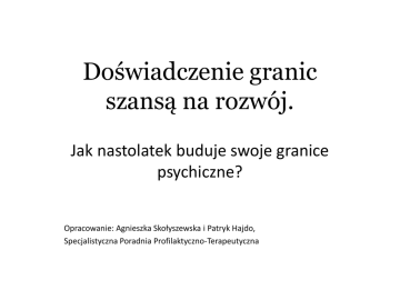 Doświadczenie granic szansą na rozwój. Jak nastolatek buduje swoje granice psychiczne? Opracowanie: Agnieszka Skołyszewska i Patryk Hajdo, Specjalistyczna Poradnia Profilaktyczno-Terapeutyczna RÓŻNICA WYZNACZA GRANICĘ dwa zielone kwadraty RÓŻNICA WYZNACZA GRANICĘ dwa zielone kwadraty tworzą prostokąt RÓŻNICA WYZNACZA GRANICĘ zielony i czerwony kwadrat nadal są kwadratami RÓŻNICA WYZNACZA GRANICĘ W Niemczech W Polsce obowiązuje zasada obowiązuje zasada UŻYWAMY JĘZYKA NIEMIECKIEGO UŻYWAMY JĘZYKA POLSKIEGO RÓŻNICA WYZNACZA GRANICĘ OJCIEC Mam takie zasady: • ubieram się w garnitur, • noszę krótkie włosy, • używam teczki. SYN Mam takie zasady: • ubieram się w garnitur, • noszę krótkie włosy, • używam teczki. RÓŻNICA WYZNACZA GRANICĘ OJCIEC i SYN Mamy takie zasady: • ubieramy się w garnitury, • nosimy krótkie włosy, • używamy teczki. RÓŻNICA WYZNACZA GRANICĘ OJCIEC Mam takie zasady: • ubieram się w garnitur, • noszę krótkie włosy, • używam teczki. SYN Mam takie zasady: • ubieram się w dresy, • strzygę się do łysa, • używam plecaka. RÓŻNICA WYZNACZA GRANICĘ Różnica to element kształtowania się granic: JA vs INNY JA - granica - INNY JA vs ŚWIAT JA - granica -ŚWIAT RÓŻNICA WYZNACZA GRANICĘ • Im większa różnica tym wyraźniejsza granica Szary jest słabo widoczny na białej tablicy Czarny jest dobrze widoczny na białej tablicy ODWROTNOŚD jako MAKSYMALNA RÓŻNICA RÓŻNICA WYZNACZA GRANICĘ konflikt separacyjny Nie wszyscy naraz mogą byd zadowoleni Zadowolenie vs niezadowolenie Różnica w emocjach to granica psychologiczna RÓŻNICA WYZNACZA GRANICĘ konflikt separacyjny Umiejętnośd znoszenia cudzego niezadowolenia jako element granic OGRANICZENIE Nie można mied wszystkiego naraz Zachowanie (wybór) -> konsekwencja Przekroczenie granic (wybór) -> konsekwencja Trzy drogi w wychowaniu czyli o tym, jak stawiad granice by budowad relację opartą na dialogu i wzajemnym szacunku Władza Rodzic/wychowawca dominujący (stosujący system władzy) ma przekonanie, że zawsze ma rację, a dziecko powinno się mu podporządkowad, słuchad go. Ma wysokie oczekiwania, sztywne zasady i jest przekonany, że pewne rzeczy są złe, a dzieci powinny trzymad się od nich z daleka. Przyjmuje często rolę egzekutora, kontrolera, a nawet kata. Jest sztywny w myśleniu i zachowaniu. Stosuje kary. Władza Przykładowe wypowiedzi i zachowania rodziców/wychowawców: • Nie obchodzi mnie dlaczego się spóźniłeś, mamy zasady, masz 5 punktów karnych. • Nie musisz wiedzied dlaczego, ja tak mówię i tak ma byd. • Ile razy mówiłem że tak ma byd? Za karę….. • Nie dyskutuj Kowalski tylko słuchaj, co mówię! • Mówiłam, że nie wolno ci się spóźniad?! Za karę nie możesz więcej tam chodzid!. Władza Reakcje dzieci, które mają rodziców lub wychowawców stosujących władzę: • Brak ochoty, by się zmieniad, kto mnie nie szanuje i kto nie liczy się z moimi uczuciami, potrzebami • Zależnośd od zdania i ocen innych, • Niezdolnośd do twórczego myślenia, do samodzielnego rozwiązywania problemów, • Niskie poczucie własnej wartości, • Niewiara we własne możliwości, • Odrzucenie zasad, bunt. Władza Rekcja rodzica/wychowawcy: • Poczucie bezradności • Bezsilnośd, • Frustracja z powodu krótkotrwałych efektów swoich wysiłków, • Niezadowolenie z siebie jako rodzica/wychowawcy i z dziecka W relacji: • Chłód • Oddalenie • Niechęd • Dzieci nie mogą wytrzymad z rodzicami/wychowawcami Stopieo okazywania dziecku miłości i wsparcia: niski Stopieo kontrolowania dziecka przez zasady i ograniczenia: wysoki władza • • Dominacja potrzeb i uczud rodzica kosztem potrzeb i uczud dziecka - brak symetrii i wzajemności. Dzieci, które miały/mają naruszane granice, szczególnie przez dorosłych mogą mied tendencje do naruszania/przekraczania granic innym. Uległośd • Rodzic/wychowawca dla „świętego spokoju” ustępuje dziecku, chod to jest sprzeczne z jego uczuciami i potrzebami. Miły i wspierający - nie stawia granic, nie egzekwuje ograniczeo. Boi się, że zrobi dziecku krzywdę, jeśli będzie zbyt surowy. Poddaje się woli dziecka, by uniknąd konfrontacji. Postawa rodzica/wychowawcy jest uległa, lecz podminowana złością do dziecka - gdyż rodzic nie dba o swoje uczucia i potrzeby. • Dziecko natomiast ma mieszane uczucia. Z jednej strony poczucie wygranej, z drugiej strony brak granic i oparcia ze strony dorosłego budzi w nim niepokój i niepewnośd. Może myśled: „wystarczy że się uprę, że będę krzyczed, a będzie tak, jak chcę”. uległośd Przykładowe wypowiedzi i zachowania rodziców/wychowawców: • W porządku, tym razem nie wpiszę Ci tych 5 punktów karnych za spóźnienie, ale następnym razem nie spóźnij się….. • No dobrze, niech będzie tak, jak Ty chcesz…. • Bardzo Cię proszę pośpiesz się, bo nie zdążę do pracy. • Nie chcę słyszed o waszych kłótniach, dogadajcie się jakoś z siostrą…. uległośd Reakcje dzieci, które mają rodziców lub wychowawców uległych: • Niepewnośd, czy rodzic go kocha • Dziecko pozornie „silne”. Zachowania dziecka: • Dziecko uczy się manipulacji, • Dziecko traci poczucie bezpieczeostwa, • Dziecko może darzyd siebie niewielkim szacunkiem, ponieważ nie nauczyło się kontrolowad siebie i nie opanowało innych umiejętności związanych z dyscypliną życia. • Dziecko uczy się relatywizmu zasad- manipulacji uległośd Skutki dla rodzica/wychowawcy: • Niechęd do dziecka, • Bezsilnośd, • Niezadowolenie z siebie jako rodzica i z dziecka, • Frustracja z powodu ciągłego ustępowania dziecku wbrew swoim uczuciom i potrzebom. W relacji: • Chłód • Oddalenie • Niechęd • Rodzice/wychowawcy nie mogą wytrzymad z dziedmi. Stopieo okazywania dziecku miłości i wsparcia: wysoki Stopieo kontrolowania dziecka przez zasady i ogranicze
