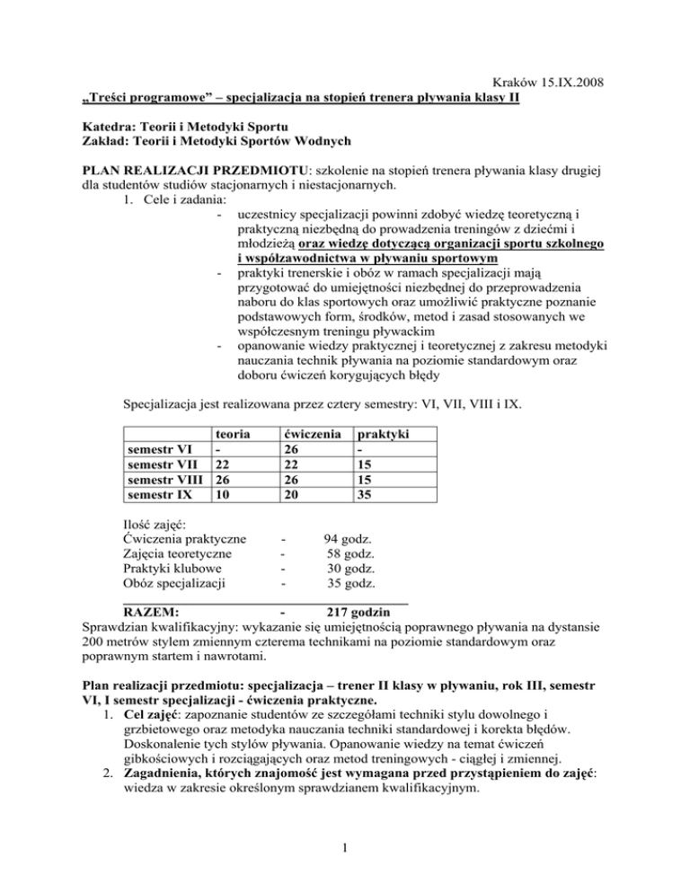 Kraków 15.IX.2008 „Treści programowe” – specjalizacja na stopień trenera pływania klasy II Katedra: Teorii i Metodyki Sportu Zakład: Teorii i Metodyki Sportów Wodnych PLAN REALIZACJI PRZEDMIOTU: szkolenie na stopień trenera pływania klasy drugiej dla studentów studiów stacjonarnych i niestacjonarnych. 1. Cele i zadania: - uczestnicy specjalizacji powinni zdobyć wiedzę teoretyczną i praktyczną niezbędną do prowadzenia treningów z dziećmi i młodzieżą oraz wiedzę dotyczącą organizacji sportu szkolnego i współzawodnictwa w pływaniu sportowym - praktyki trenerskie i obóz w ramach specjalizacji mają przygotować do umiejętności niezbędnej do przeprowadzenia naboru do klas sportowych oraz umożliwić praktyczne poznanie podstawowych form, środków, metod i zasad stosowanych we współczesnym treningu pływackim - opanowanie wiedzy praktycznej i teoretycznej z zakresu metodyki nauczania technik pływania na poziomie standardowym oraz doboru ćwiczeń korygujących błędy Specjalizacja jest realizowana przez cztery semestry: VI, VII, VIII i IX. semestr VI semestr VII semestr VIII semestr IX teoria 22 26 10 ćwiczenia 26 22 26 20 praktyki 15 15 35 Ilość zajęć: Ćwiczenia praktyczne 94 godz. Zajęcia teoretyczne 58 godz. Praktyki klubowe 30 godz. Obóz specjalizacji 35 godz. _________________________________________ RAZEM: 217 godzin Sprawdzian kwalifikacyjny: wykazanie się umiejętnością poprawnego pływania na dystansie 200 metrów stylem zmiennym czterema technikami na poziomie standardowym oraz poprawnym startem i nawrotami. Plan realizacji przedmiotu: specjalizacja – trener II klasy w pływaniu, rok III, semestr VI, I semestr specjalizacji - ćwiczenia praktyczne. 1. Cel zajęć: zapoznanie studentów ze szczegółami techniki stylu dowolnego i grzbietowego oraz metodyka nauczania techniki standardowej i korekta błędów. Doskonalenie tych stylów pływania. Opanowanie wiedzy na temat ćwiczeń gibkościowych i rozciągających oraz metod treningowych - ciągłej i zmiennej. 2. Zagadnienia, których znajomość jest wymagana przed przystąpieniem do zajęć: wiedza w zakresie określonym sprawdzianem kwalifikacyjnym. 1 3. Umiejętności wymagane przed przystąpieniem do zajęć: umiejętność pływania w zakresie określonym sprawdzianem kwalifikacyjnym. 4. Literatura obowiązkowa: - Bartkowiak E.(1995): Sportowa technika pływania, Biblioteka trenera, COS Warszawa -Waade B. (red.)(2003):Pływanie sportowe i ratunkowe–teoria i metodyka. AWF Gdańsk 5. Literatura zalecana: -Karpiński R. (2002): Pływanie. Podstway techniki, nauczanie. AWF Katowice. -Maglischo E.W.: Swimming Fastest. Human Kinetics 2003 -Chollet D.: Approche scientifique de la natation sportive.Vigot, Paris 1990 -Bartkowiak E.: Pływanie – program szkolenia dzieci i młodzieży. COS Warszawa 1997 6. Plan i organizacja zajęć Zajęcia obejmują 26 godzin, zakończone zaliczeniem praktycznym. Ćwiczenia nr 1. Liczba godzin:10 godz. Wymagana znajomość zagadnień związanych z techniką pływania stylem dowolnym i przepisami FINA w tym stylu Problematyka ćwiczenia: analiza techniki stylu dowolnego, metodyka nauczania na poziomie standardowym (z uwzględnieniem przepisów FINA) startu, nawrotu i pływania na dystansie oraz postępowanie związane z korektą błędów Nabyte umiejętności: wiedza w zakresie specyfiki procesu nauczania techniki standardowej oraz jej analizy pod kątem błędów stylu dowolnego, opanowanie poprawnej techniki pływania kraulem na piersiach Ćwiczenia nr 2. Liczba godzin:10 godz. Wymagana znajomość zagadnień związanych z techniką pływania stylem grzbietowym i przepisami FINA w tym stylu Problematyka ćwiczenia: analiza techniki stylu grzbietowego, metodyka nauczania na poziomie standardowym (z uwzględnieniem przepisów FINA) startu, nawrotu i pływania na dystansie oraz postępowanie związane z korektą błędów Nabyte umiejętności: wiedza w zakresie specyfiki procesu nauczania techniki standardowej oraz jej analizy pod kątem błędów stylu grzbietowego, opanowanie poprawnej techniki pływania stylem grzbietowym Ćwiczenia nr 3. Liczba godzin:6 godz. Wymagana znajomość zagadnień dotycząca podstawowych uwarunkowań treningu sportowego dzieci i młodzieży Problematyka ćwiczenia: ćwiczenia gibkościowe i rozciągające na lądzie w I etapie szkolenia, wykorzystanie metody ciągłej i zmiennej do kształtowania wytrzymałości tlenowej u dzieci na etapie treningu wszechstronnego Nabyte umiejętności: wiedza w zakresie specyfiki treningu dzieci w etapie wszechstronnym Podstawę zaliczenia stanowi: przepłynięcie dystansu 1500 metrów stylem dowolnym na czas, praktyczne posługiwanie się stoperem z pomiarem międzyczasów, wykazanie się znajomością tematyki dotyczącej etapu treningu wszechstronnego. Obowiązkowy udział w zawodach Ligi Międzyuczelnianej AZS. 2 Plan realizacji przedmiotu: specjalizacja – trener II klasy w pływaniu, rok IV, semestr VII, II semestr specjalizacji - ćwiczenia praktyczne. 1. Cel zajęć: zapoznanie studentów ze szczegółami techniki stylu motylkowego i klasycznego oraz metodyka nauczania techniki standardowej i korekta błędów. Doskonalenie tych stylów pływania oraz stylu zmiennego. Opanowanie wiedzy na temat treningu tlenowego na etapie wszechstronnym i ukierunkowanym oraz metod oceny wytrzymałości tlenowej i kontroli techniki pływania w stylu zmiennym. 2. Zagadnienia, których znajomość jest wymagana przed przystąpieniem do zajęć: wiedza i umiejętności w zakresie nauczanym w I semestrze. 3. Umiejętności wymagane przed przystąpieniem do zajęć: posiadanie kompetencji pływackich w zakresie nauczanym w I semestrze. 4. Literatura obowiązkowa: - Bartkowiak E.(1995): Sportowa technika pływania, Biblioteka trenera, COS Warszawa -Waade B. (red.)(2003):Pływanie sportowe i ratunkowe–teoria i metodyka. AWF Gdańsk 5. Literatura zalecana: -Karpiński R. (2002): Pływanie. Pods