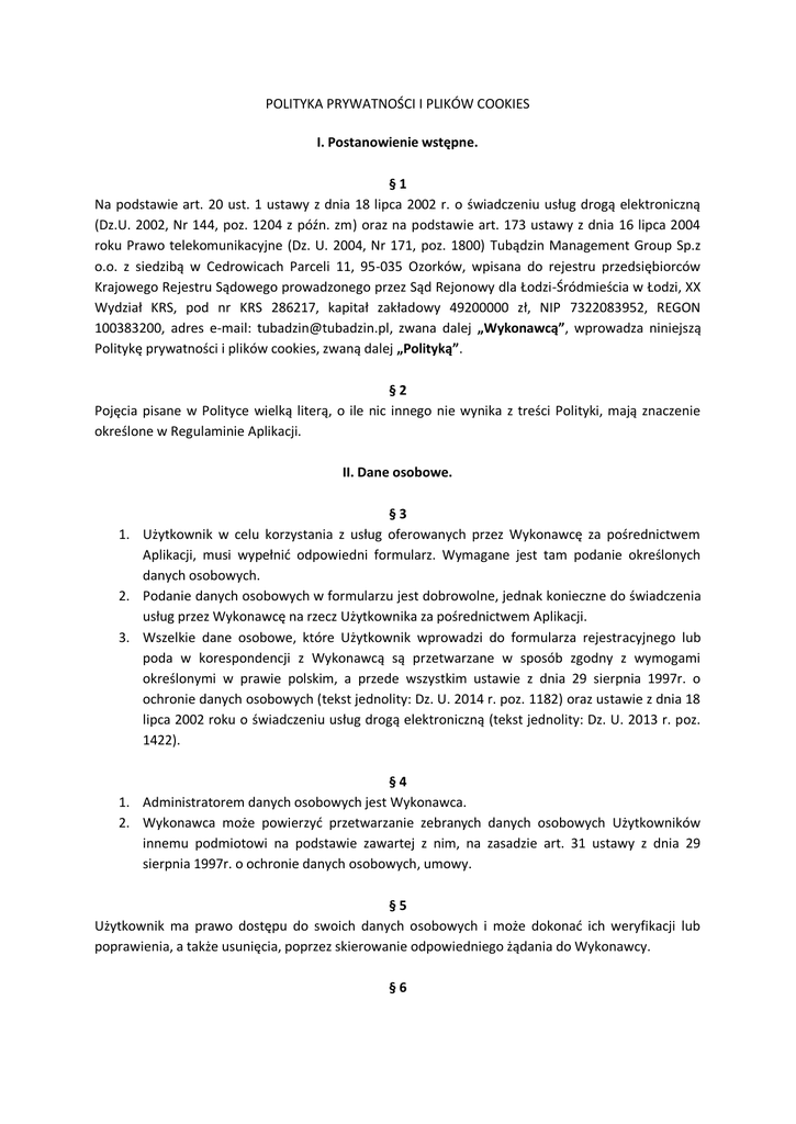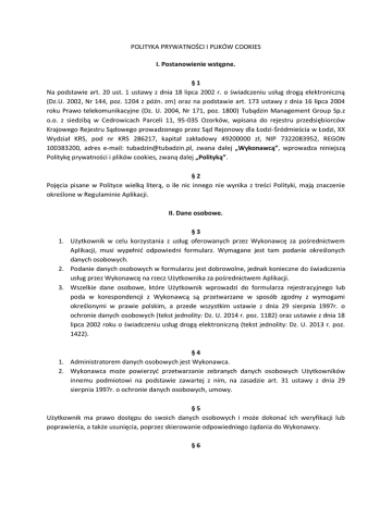 POLITYKA PRYWATNOŚCI I PLIKÓW COOKIES I. Postanowienie wstępne. §1 Na podstawie art. 20 ust. 1 ustawy z dnia 18 lipca 2002 r. o świadczeniu usług drogą elektroniczną (Dz.U. 2002, Nr 144, poz. 1204 z późn. zm) oraz na podstawie art. 173 ustawy z dnia 16 lipca 2004 roku Prawo telekomunikacyjne (Dz. U. 2004, Nr 171, poz. 1800) Tubądzin Management Group Sp.z o.o. z siedzibą w Cedrowicach Parceli 11, 95-035 Ozorków, wpisana do rejestru przedsiębiorców Krajowego Rejestru Sądowego prowadzonego przez Sąd Rejonowy dla Łodzi-Śródmieścia w Łodzi, XX Wydział KRS, pod nr KRS 286217, kapitał zakładowy 49200000 zł, NIP 7322083952, REGON 100383200, adres e-mail: [email protected], zwana dalej „Wykonawcą”, wprowadza niniejszą Politykę prywatności i plików cookies, zwaną dalej „Polityką”. §2 Pojęcia pisane w Polityce wielką literą, o ile nic innego nie wynika z treści Polityki, mają znaczenie określone w Regulaminie Aplikacji. II. Dane osobowe. §3 1. Użytkownik w celu korzystania z usług oferowanych przez Wykonawcę za pośrednictwem Aplikacji, musi wypełnić odpowiedni formularz. Wymagane jest tam podanie określonych danych osobowych. 2. Podanie danych osobowych w formularzu jest dobrowolne, jednak konieczne do świadczenia usług przez Wykonawcę na rzecz Użytkownika za pośrednictwem Aplikacji. 3. Wszelkie dane osobowe, które Użytkownik wprowadzi do formularza rejestracyjnego lub poda w korespondencji z Wykonawcą są przetwarzane w sposób zgodny z wymogami określonymi w prawie polskim, a przede wszystkim ustawie z dnia 29 sierpnia 1997r. o ochronie danych osobowych (tekst jednolity: Dz. U. 2014 r. poz. 1182) oraz ustawie z dnia 18 lipca 2002 roku o świadczeniu usług drogą elektroniczną (tekst jednolity: Dz. U. 2013 r. poz. 1422). §4 1. Administratorem danych osobowych jest Wykonawca. 2. Wykonawca może powierzyć przetwarzanie zebranych danych osobowych Użytkowników innemu podmiotowi na podstawie zawartej z nim, na zasadzie art. 31 ustawy z dnia 29 sierpnia 1997r. o ochronie danych osobowych, umowy. §5 Użytkownik ma prawo dostępu do swoich danych osobowych i może dokonać ich weryfikacji lub poprawienia, a także usunięcia, poprzez skierowanie odpowiedniego żądania do Wykonawcy. §6 1. Wykonawca przetwarza dane osobowe Użytkowników i wykorzystuje je w zakresie i w celu niezbędnym do realizacji usług oferowanych za pośrednictwem Aplikacji, w tym dodaje dane Użytkowników – profesjonalistów do bazy wykonawców i udostępnia je na mapie geolokalizacji. 2. Na podstawie dodatkowej i opcjonalnej zgody, którą Użytkownik może wyrazić w osobnym oświadczeniu, Wykonawca może przetwarzać dane osobowe Użytkowników w celach marketingowych. Jeżeli Użytkownik udzieli takiej zgody, to może ją następnie w każdej chwili odwołać. §7 Wykonawca na podstawie udzielonej przez Użytkownika dodatkowej i opcjonalnej zgody ma prawo do wysyłania do niego na podane adresy e-mail lub numery telefonu informacji handlowych. Zgoda, o której mowa w zdaniu poprzedzającym może zostać w każdej chwili odwołana przez Użytkownika. §8 Dane osobowe zebrane przez Wykonawcę mogą zostać przekazane upoważnionym, na podstawie obowiązujących przepisów prawa, organom państwowym. III. Pliki cookies i podobne technologie. §9 1. Wykonawca wykorzystuje pliki cookies (ciasteczka), czyli niewielkie informacje tekstowe, przechowywane na urządzeniu końcowym Użytkownika (np. komputerze, tablecie, smartfonie), oraz podobne technologie. Cookies mogą być odczytywane przez system teleinformatyczny Wykonawcy. 2. Wykonawca przechowuje pliki cookies na urządzeniu końcowym Użytkownika, a następnie uzyskuje dostęp do informacji w nich zawartych w celach: statystycznych, marketingowych oraz zapewnienia prawidłowego działania Aplikacji, a w szczególności utrzymania sesji po zalogowaniu. § 10 1. Wykonawca informuje także Użytkowników, że istnieje możliwość takiej konfiguracji przeglądarki internetowej, która uniemożliwia przechowywanie plików cookies na urządzeniu końcowym Użytkownika. 2. Wykonawca wskazuje także, że pliki cookies mogą być przez Użytkownika usunięte po ich zapisaniu przez Wykonawcę, poprzez: odpowiednie funkcje przeglądarki internetowej, programy służące w tym celu lub skorzystanie z odpowiednich narzędzi dostępnych w ramach systemu operacyjnego, z którego korzysta Użytkownik. 3. Pod poniższymi linkami zamieszczone są informacje o sposobach usunięcia cookies w najpopularniejszych przeglądarkach internetowych: o Firefox: http://support.mozilla.org/pl/kb/usuwanie-ciasteczek, o Opera: http://help.opera.com/Linux/9.60/pl/cookies.html, o Internet Explorer: http://support.microsoft.com/kb/278835/pl, o Chrome: http://support.google.com/chrome/bin/answer.py?hl=pl&answer=95647 § 11 Wykonawca informuje także Użytkowników, że zmiana konfiguracji przeglądarki internetowej, która uniemożliwia lub ogranicza przechowywanie plików cookies na urządzeniu końcowym Użytkownika może spowodować ograniczenia funkcjonalności świadczonych usług. Do podobnych skutków może prowadzić wykasowanie plików cookies w trakcie świadczenia usługi. Może to powodować brak możliwości zalogowania się do Aplikacji lub przerwanie sesji po zalogowaniu. IV. Środki techniczne stosowane przez Wykonawcę. § 12 Wykonawca stosuje wymagane aktualnymi przepisami o ochronie danych osobowych środki techniczne zapobiegające pozyskiwaniu i modyfikowaniu przez osoby nieuprawnione danych osobowych przesyłanych drogą elektroniczną. V. Inne. § 13 Użytkownik nie ma możliwości korzystania z usług realizowanych za pośrednictwem Aplikacji pod pseudonimem. § 14 Wykonawca będzie także rejestrował nr IP urządzenia, za pośrednictwem którego Użytkownik będzie korzystać z Aplikacji. § 15 W przypadku pytań i opinii dotyczących stosowanej przez Wykonawcy Polityki prosimy o ich przesyłanie na adres e-mail: [
