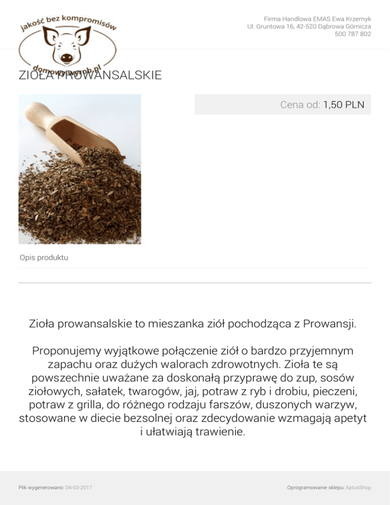Firma Handlowa EMAS Ewa Krzemyk Ul. Gruntowa 16, 42-520 Dąbrowa Górnicza 500 787 802 ZIOŁA PROWANSALSKIE Cena od: 1,50 PLN Opis produktu Zioła prowansalskie to mieszanka ziół pochodząca z Prowansji. Proponujemy wyjątkowe połączenie ziół o bardzo przyjemnym zapachu oraz dużych walorach zdrowotnych. Zioła te są powszechnie uważane za doskonałą przyprawę do zup, sosów ziołowych, sałatek, twarogów, jaj, potraw z ryb i drobiu, pieczeni, potraw z grilla, do różnego rodzaju farszów, duszonych warzyw, stosowane w diecie bezsolnej oraz zdecydowanie wzmagają apetyt i ułatwiają trawienie. Plik wygenerowano: 04-03-2017 Oprogramowanie sklepu: AptusShop Firma Handlowa EMAS Ewa Krzemyk Ul. Gruntowa 16, 42-520 Dąbrowa Górnicza 500 787 802 Skład mieszanki: oregano, tymianek, bazylia, cząber, estragon. KRAJ POCHODZENIA POLSKA Warianty produktu 30g 1,50 PLN 50,00 PLN/1KG 100g 2,80 PLN 28,00 PLN/1KG 250g 5,00 PLN 20,00 PLN/1KG Plik wygenerowano: 04-03-2017 Powered by TCPDF (www.tcpdf.org) Oprogramowanie sklepu: AptusShop