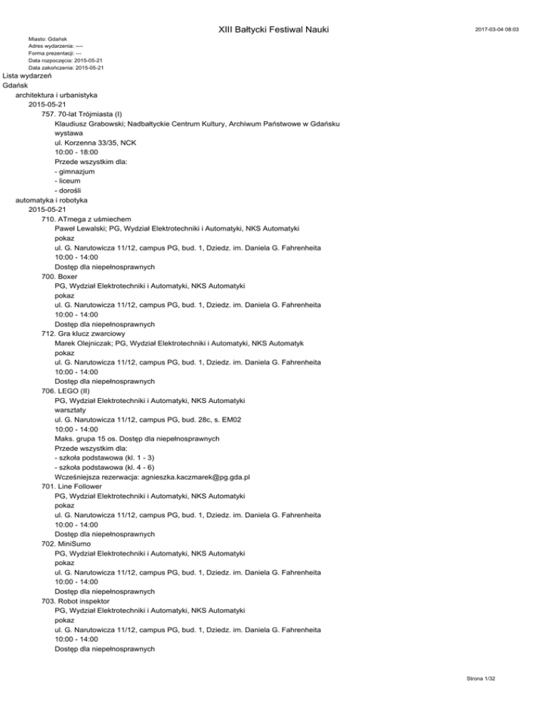 XIII Bałtycki Festiwal Nauki 2017-03-04 08:03 Miasto: Gdańsk Adres wydarzenia: ---Forma prezentacji: --Data rozpoczęcia: 2015-05-21 Data zakończenia: 2015-05-21 Lista wydarzeń Gdańsk architektura i urbanistyka 2015-05-21 757. 70-lat Trójmiasta (I) Klaudiusz Grabowski; Nadbałtyckie Centrum Kultury, Archiwum Państwowe w Gdańsku wystawa ul. Korzenna 33/35, NCK 10:00 - 18:00 Przede wszystkim dla: - gimnazjum - liceum - dorośli automatyka i robotyka 2015-05-21 710. ATmega z uśmiechem Paweł Lewalski; PG, Wydział Elektrotechniki i Automatyki, NKS Automatyki pokaz ul. G. Narutowicza 11/12, campus PG, bud. 1, Dziedz. im. Daniela G. Fahrenheita 10:00 - 14:00 Dostęp dla niepełnosprawnych 700. Boxer PG, Wydział Elektrotechniki i Automatyki, NKS Automatyki pokaz ul. G. Narutowicza 11/12, campus PG, bud. 1, Dziedz. im. Daniela G. Fahrenheita 10:00 - 14:00 Dostęp dla niepełnosprawnych 712. Gra klucz zwarciowy Marek Olejniczak; PG, Wydział Elektrotechniki i Automatyki, NKS Automatyk pokaz ul. G. Narutowicza 11/12, campus PG, bud. 1, Dziedz. im. Daniela G. Fahrenheita 10:00 - 14:00 Dostęp dla niepełnosprawnych 706. LEGO (II) PG, Wydział Elektrotechniki i Automatyki, NKS Automatyki warsztaty ul. G. Narutowicza 11/12, campus PG, bud. 28c, s. EM02 10:00 - 14:00 Maks. grupa 15 os. Dostęp dla niepełnosprawnych Przede wszystkim dla: - szkoła podstawowa (kl. 1 - 3) - szkoła podstawowa (kl. 4 - 6) Wcześniejsza rezerwacja: [email protected] 701. Line Follower PG, Wydział Elektrotechniki i Automatyki, NKS Automatyki pokaz ul. G. Narutowicza 11/12, campus PG, bud. 1, Dziedz. im. Daniela G. Fahrenheita 10:00 - 14:00 Dostęp dla niepełnosprawnych 702. MiniSumo PG, Wydział Elektrotechniki i Automatyki, NKS Automatyki pokaz ul. G. Narutowicza 11/12, campus PG, bud. 1, Dziedz. im. Daniela G. Fahrenheita 10:00 - 14:00 Dostęp dla niepełnosprawnych 703. Robot inspektor PG, Wydział Elektrotechniki i Automatyki, NKS Automatyki pokaz ul. G. Narutowicza 11/12, campus PG, bud. 1, Dziedz. im. Daniela G. Fahrenheita 10:00 - 14:00 Dostęp dla niepełnosprawnych Strona 1/32 XIII Bałtycki Festiwal Nauki 2017-03-04 08:03 445. Świat inżynierii biomedycznej – zrób to sam, czyli jak mierzyć biosygnały Tomasz Kocejko; PG, Wydział Elektroniki, Telekomunikacji i Informatyki pokaz i warsztaty ul. G. Narutowicza 11/12, campus PG, bud. A ETI, lab. 102 10:00 - 15:00 Maks. grupa 12 os. Dostęp dla niepełnosprawnych 930. Spotkanie z mechatroniką dr inż. Ryszard Jasiński; PG, Wydział Mechaniczny pokaz i warsztaty ul. G. Narutowicza 11/12, campus PG, bud. 20, s. 5 11:15 - 16:00 429. Bezzałogowa zdalnie sterowana jednostka latająca inż. Patryk Piotrowski, inż. Tomasz Witkowski, dr inż. Robert Piotrowski; PG, Wydział Elektrotechniki i Automatyki wykład i pokaz ul. G. Narutowicza 11/12, campus PG, bud. 1, Dziedz. im. Daniela G. Fahrenheita 12:00 - 13:00 Dostęp dla niepełnosprawnych Przede wszystkim dla: - liceum - dorośli 436. Prezentacja makiety kolejowej w Laboratorium Integracji Systemów Automatyki Michał Czubenko, Tomasz Merta, Agnieszka Kania, Michał Droździel; PG, Wydział Elektroniki, Telekomunikacji i Informatyki pokaz laboratoryjny ul. G. Narutowicza 11/12, campus PG, n. bud. ETI, s. 367 13:00 - 14:00 Dostęp dla niepełnosprawnych bibliotekoznawstwo i informacja naukowo-techniczna 2015-05-21 223. Kreatywne dzieciaki - warsztaty mgr Agnieszka Wasilewska, mgr Klaudia Gromek; UG, Biblioteka UG warsztaty ul. Wita Stwosza 53, UG BUG, II p., s. 3.36 08:30 - 09:30, 10:00 - 11:00, 11:30 - 12:30 Maks. grupa 25 os. Dostęp dla niepełnosprawnych Przede wszystkim dla: - szkoła podstawowa (kl. 1 - 3) Wcześniejsza rezerwacja: od 20 kwietnia do 15 maja, [email protected] 224. Poranki prasoznawcze - warsztaty mgr Aleksandra Pańka, dr Katarzyna Wawrzynkowska; UG, Biblioteka UG warsztaty ul. Wita Stwosza 53, UG BUG, parter, Czytelnia Informacji Naukowej 08:30 - 10:00 Maks. grupa 25 os. Dostęp dla niepełnosprawnych Przede wszystkim dla: - gimnazjum - liceum Wcześniejsza rezerwacja: od 20 kwietnia do 15 maja, [email protected] 220. Bindowanie, bigowanie, prasowanie czyli tajemnice introligatorni - pokaz Monika Marcinkowska, Bogumiła Niklaszewska; UG, Biblioteka UG pokaz ul. Wita Stwosza 53, UG BUG, parter, Introligatornia 08:30 - 14:00 Maks. grupa 15 os. Dostęp dla niepełnosprawnych Przede wszystkim dla: - szkoła podstawowa (kl. 1 - 3) - szkoła podstawowa (kl. 4 - 6) Wcześniejsza rezerwacja: od 20 kwietnia do 15 maja, [email protected] 222. W przybliżeniu, czyli sekrety biblioteki - zwiedzanie mgr Marzena Grzegowska; UG, Biblioteka UG wycieczka lub zwiedzanie ul. Wita Stwosza 53, UG BUG 08:30 - 14:00 Maks. grupa 25 os. Dostęp dla niepełnosprawnych Wyłącznie dla: - szkoła podstawowa (kl. 1 - 3) Strona 2/32 XIII Bałtycki Festiwal Nauki 2017-03-04 08:03 - szkoła podstawowa (kl. 4 - 6) Wcześniejsza rezerwacja: od 20 kwietnia do 15 maja, [email protected] Impreza przeznaczona przede wszystkim dla grup spoza Trójmiasta oraz dzieci ze szkół podstawowych. 620. Parkietażowe zakładki/okładki do książek - warsztaty mgr Marietta Tiszbein, dr Katarzyna Wawrzynkowska; UG, Biblioteka UG warsztaty ul. Wita Stwosza 53, UG BUG, parter, s. 0.30 09:00 - 10:30, 11:00 - 12:30, 13:00 - 14:30 Maks. grupa 25 os. Dostęp dla niepełnosprawnych Przede wszystkim dla: - szkoła podstawowa (kl. 1 - 3) - szkoła podstawowa (kl. 4 - 6) - gimnazjum Wcześniejsza rezerwacja: od 20 kwietnia do 15 maja, [email protected] 613. Marzę, maluję i własną bajkę kreuję - warsztaty z bajkopisarstwa mgr Aleksandra Pańka, mgr Marzena Grzegowska; UG, Biblioteka UG warsztaty ul. Wita Stwosza 53, UG BUG, II p., s. 2.32 10:00 - 12:00, 12:30 - 14:00 Maks. grupa 25 os. Dostęp dla niepełnosprawnych Przede wszystkim dla: - szkoła podstawowa (kl. 1 - 3) - szkoła podstawowa (kl. 4 - 6) Wcześniejsza rezerwacja: od 20 kwietnia do 15 maja, [email protected] biocybernetyka i inżynieria biomedyczna 2015-05-21 858. Ele