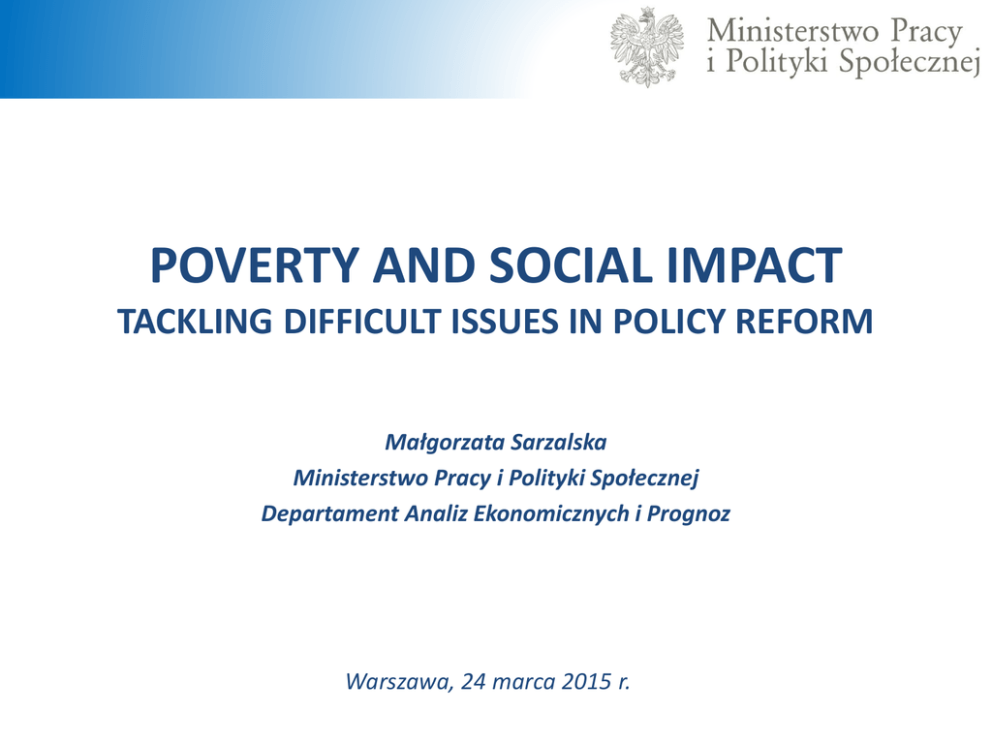 POVERTY AND SOCIAL IMPACT TACKLING DIFFICULT ISSUES IN POLICY REFORM Małgorzata Sarzalska Ministerstwo Pracy i Polityki Społecznej Departament Analiz Ekonomicznych i Prognoz Warszawa, 24 marca 2015 r. Plan prezentacji: polityka oparta na dowodach – cel polityka oparta na dowodach – realizacja w Polsce przykłady 2 Polityka oparta na dowodach cel Zwiększenie skuteczności i efektywności polityki publicznej, poprzez: wypełnienie luk informacyjnych diagnozę problemu wraz ze wskazaniem różnych możliwych do podjęcia interwencji wskazanie interwencji, które przy danych uwarunkowaniach (np. ograniczeniach budżetowych) będą najskuteczniejsze minimalizowanie negatywnych efektów / maksymalizowanie pozytywnych efektów 3 Polityka oparta na dowodach Projektowanie i ewaluacja interwencji podejmowanych w ramach polityki publicznej Monitorowanie sytuacji społecznej Diagnoza problemów społecznych i identyfikacja obszarów wymagających interwencji 4 Polityka oparta na dowodach realizacja Uwarunkowania strategiczne •Strategia Rozwoju Kraju 2020 Istotnym warunkiem dla wysokiej efektywności interwencji publicznych jest oparcie polityk publicznych na dowodach (evidence based policies), czyli podejmowanie decyzji zarówno na poziomie strategicznym, jak i operacyjnym w oparciu o analizy. •Strategia Rozwoju Kapitału Ludzkiego Realizacja polityk rynku pracy w oparciu o fakty (ang. evidence based policy) wymaga solidnych podstaw analitycznych i starannego monitorowania rynków pracy. 5 Polityka oparta na dowodach realizacja Ocena Skutków Regulacji Obowiązek opracowywania OSR do rządowych projektów aktów prawnych został wprowadzony w 2001 r. Przed opracowaniem projektu aktu normatywnego dokonuje się oceny przewidywanych skutków regulacji, a wyniki OSR stanowią część uzasadnienia do aktów normatywnych. „Wytyczne do oceny skutków regulacji (OSR)” wprowadzone w 2006 r., aktualizacja 2015 r. Zasada obiektywizmu - wyboru sposobu działania należy dokonywać po przeprowadzeniu, opartej na różnych źródłach, rzetelnej analizy, przy wykorzystaniu np. ekonomicznych metod pomiaru kosztów i korzyści proponowanych rozwiązań. Zasady przejrzystości i jawności - wymóg przeprowadzenia konsultacji i przedstawienia ich wyników. 6 Polityka oparta na dowodach realizacja Ocena Skutków Regulacji OSR zawiera obowiązkowo analizę wpływu projektowanego aktu normatywnego na sektor finansów publicznych, rynek pracy, konkurencyjność gospodarki i przedsiębiorczość. Od 2013 r. OSR uzupełniany jest testem regulacyjnym, w którym przedstawia się m.in. wstępną analizę ekonomiczną, finansową i społeczną w tym oszacowanie obciążeń regulacyjnych oraz porównanie z rozwiązaniami przyjętymi w innych krajach. Od 2013 r. wprowadzono opracowywanie OSR ex-post. Ocena wpływu regulacji na sytuację gospodarstw domowych, rynek pracy i ubóstwo - ograniczona 7 Polityka oparta na dowodach realizacja Co jest potrzebne by prowadzić politykę opartą na dowodach? odpowiednia metodologia, czytelność przyjętych założeń dane ilościowe i jakościowe i ich publiczna dostępność czas potrzebny na przeprowadzenie analiz i skonsultowanie ich z interesariuszami pracownicy z odpowiednimi umiejętnościami analitycznymi odpowiednie podejście decydentów 8 Polityka oparta na dowodach realizacja KLUCZOWE WYKAZANIE ZWIĄZKÓW PRZYCZYNOWO-SKUTKOWYCH • Istnieje wiele dostępnych źródeł danych (w tym statystyka publiczna, dane administracyjne, wyniki ewaluacji, specjalne badania tematyczne, w tym dane o charakterze jakościowych, metaanalizy)…. • ….ale są one niewystarczające do potrzeb prowadzenia polityki opartej na dowodach (raczej dane przekrojowe, niż panelowe, brak elastyczności wobec bieżących potrzeb informacyjnych, brak porównywalności, niska jakość badań i ewaluacji, brak informacji o populacji nieobjętej interwencją itp.) 9 Polityka oparta na dowodach realizacja Dotychczasowe doświadczenia: Zbyt słabe powiązania prowadzonych prac badawczoanalitycznych z potrzebami informacyjnymi i elementami wdrożeniowymi. Brak odpowiedniej koordynacji działań badawczych między różnymi instytucjami. Mała ciągłość badań – realizowane ad hoc, niekontynuowane, nieporównywalne. Niedostateczne zrozumienie / brak umiejętności analitycznych kadry instytucji publicznych. Kompleksowość analizy zjawisk społecznych. 10 Polityka oparta na dowodach realizacja Czy to oznacza, że ocena wpływu różnych rozwiązań na sytuację społeczną, w tym ubóstwo, nie jest prowadzona? Jest prowadzona, ale w sposób mniej usystematyzowany. Przede wszystkim w instytucjach które zajmują się kształtowaniem polityki zabezpieczenia społecznego. Nie zawsze właściwie rozpoznawany jest wpływ rozwiązań pozornie nie mających związku z kwestiami społecznymi na sytuację gospodarstw domowych oraz osób indywidualnych. 11 Polityka oparta na dowodach przykłady Przykład: opracowanie rządowego programu „Solidarność pokoleń. Działania dla zwiększenia aktywności zawodowej osób w wieku 50+” Przeprowadzenie kompleksowej analizy sytuacji osób 50+ na rynku pracy oraz podstawowych przyczyn niskiej aktywności zawodowej przed opracowaniem programu. Uwzględnienie dorobku naukowego oraz dobrych praktyk w ujęciu międzynarodowym. Rewizja programu (2013 r.) poprzedzona konsultacjami z zespołem ekspertów oraz praktyków działających na rzecz aktywizacji osób w wieku 50+. Ciągłe monitorowanie podstawowych wskaźników realizacji Programu oraz działań podejmowanych przez pomioty na poziomie krajowym, wojewódzkim i lokalnym. Budowa systemu ewaluacji podejmowanych działań oraz systemu wzajemnego uczenia się instytucji zaangażowanych w realizację Programu. 12 Polityka oparta na dowodach przykład Przykład: projekt pn. „Formalne i nieformalne instytucje opieki w Polsce” Projekt realizowany w ramach środków EFS. Opracowanie działań podejmowanych w pro