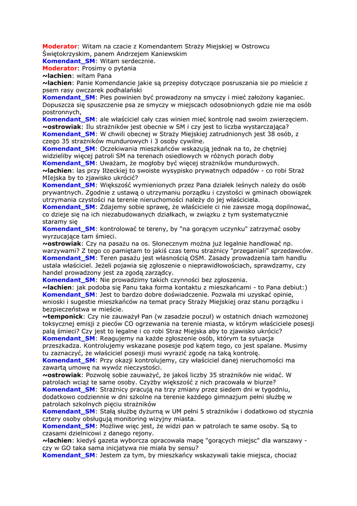 Moderator: Witam na czacie z Komendantem StraŜy Miejskiej w Ostrowcu Świętokrzyskim, panem Andrzejem Kaniewskim Komendant_SM: Witam serdecznie. Moderator: Prosimy o pytania ~lachien: witam Pana ~lachien: Panie Komendancie jakie są przepisy dotyczące posruszania sie po mieście z psem rasy owczarek podhalański Komendant_SM: Pies powinien być prowadzony na smyczy i mieć załoŜony kaganiec. Dopuszcza się spuszczenie psa ze smyczy w miejscach odosobnionych gdzie nie ma osób postronnych, Komendant_SM: ale właściciel cały czas winien mieć kontrolę nad swoim zwierzęciem. ~ostrowiak: Ilu straŜników jest obecnie w SM i czy jest to liczba wystarczająca? Komendant_SM: W chwili obecnej w StraŜy Miejskiej zatrudnionych jest 38 osób, z czego 35 straŜników mundurowych i 3 osoby cywilne. Komendant_SM: Oczekiwania mieszkańców wskazują jednak na to, Ŝe chętniej widzieliby więcej patroli SM na terenach osiedlowych w róŜnych porach doby Komendant_SM: UwaŜam, Ŝe mogłoby być więcej straŜników mundurowych. ~lachien: las przy IłŜeckiej to swoiste wysypisko prywatnych odpadów - co robi StraŜ MIejska by to zjawisko ukrócić? Komendant_SM: Większość wymienionych przez Pana działek leśnych naleŜy do osób prywantnych. Zgodnie z ustawą o utrzymaniu porządku i czystości w gminach obowiązek utrzymania czystości na terenie nieruchomości naleŜy do jej właściciela. Komendant_SM: Zdajemy sobie sprawę, Ŝe właściciele ci nie zawsze mogą dopilnować, co dzieje się na ich niezabudowanych działkach, w związku z tym systematycznie staramy się Komendant_SM: kontrolować te tereny, by "na gorącym uczynku" zatrzymać osoby wyrzucające tam śmieci. ~ostrowiak: Czy na pasaŜu na os. Słonecznym moŜna juŜ legalnie handlować np. warzywami? Z tego co pamiętam to jakiś czas temu straŜnicy "przeganiali" sprzedawców. Komendant_SM: Teren pasaŜu jest własnością OSM. Zasady prowadzenia tam handlu ustala właściciel. JeŜeli pojawia się zgłoszenie o nieprawidłowościach, sprawdzamy, czy handel prowadzony jest za zgodą zarządcy. Komendant_SM: Nie prowadzimy takich czynności bez zgłoszenia. ~lachien: jak podoba się Panu taka forma kontaktu z mieszkańcami - to Pana debiut:) Komendant_SM: Jest to bardzo dobre doświadczenie. Pozwala mi uzyskać opinie, wnioski i sugestie mieszkańców na temat pracy StraŜy Miejskiej oraz stanu porządku i bezpieczeństwa w mieście. ~temponick: Czy nie zauwaŜył Pan (w zasadzie poczuł) w ostatnich dniach wzmoŜonej toksycznej emisji z pieców CO ogrzewania na terenie miasta, w którym właściciele posesji palą śmieci? Czy jest to legalne i co robi Straz Miejska aby to zjawisko ukrócic? Komendant_SM: Reagujemy na kaŜde zgłoszenie osób, którym ta sytuacja przeszkadza. Kontrolujemy wskazane posesje pod kątem tego, co jest spalane. Musimy tu zaznaczyć, Ŝe właściciel posesji musi wyrazić zgodę na taką kontrolę. Komendant_SM: Przy okazji kontrolujemy, czy właściciel danej nieruchomości ma zawartą umowę na wywóz nieczystości. ~ostrowiak: Pozwolę sobie zauwaŜyć, Ŝe jakoś liczby 35 straŜników nie widać. W patrolach wciąŜ te same osoby. CzyŜby większość z nich pracowała w biurze? Komendant_SM: StraŜnicy pracują na trzy zmiany przez siedem dni w tygodniu, dodatkowo codziennie w dni szkolne na terenie kaŜdego gimnazjum pełni słuŜbę w patrolach szkolnych pięciu straŜników Komendant_SM: Stałą słuŜbę dyŜurną w UM pełni 5 straŜników i dodatkowo od stycznia cztery osoby obsługują monitoring wizyjny miasta. Komendant_SM: MoŜliwe więc jest, Ŝe widzi pan w patrolach te same osoby. Są to czasami dzielnicowi z danego rejony. ~lachien: kiedyś gazeta wyborcza opracowała mapę "gorących miejsc" dla warszawy czy w GO taka sama inicjatywa nie miała by sensu? Komendant_SM: Jestem za tym, by mieszkańcy wskazywali takie miejsca, chociaŜ StraŜ Miejska na własny uŜytek tworzy własną "mapę zagroŜeń". ~emdzej: Straznicy miejscy przy przejsciach dla pieszych w godzinach porannych gdy dzieci idą do szkoly.To chyba niezły pomysł- ale zanichany? Komendant_SM: Przy obecnej obsadzie etatowej zabrakłoby funkcjonariuszy do wykonywania innych zadań. ~lachien: czy na ostrowieckich przystankach autobusowych będą zakazy palenia? Komendant_SM: Zakazy takie wprowadza Rada Miasta. Komendant_SM: StraŜ Miejska moŜe je dopiero wtedy egzekwować. ~lachien: kiedy moŜna spodziewać się następnego takiego czatu z Panem? Komendant_SM: Trudno powiedzieć, zaleŜy to od Państwa zainteresowania. ~lachien: przypuśćmy: poszedłem do lasu nazbierałem prawdziwków: czy mogę je legalnie sprzedać na targowicy? Komendant_SM: Grzyby takie powinny być obejrzane przez "klasyfikatora" z Targowiska, ponadto sprzedawca powinien określić, gdzie dane grzyby były zebrane oraz podać swoje imię, nazwisko i adres zamieszkania. Komendant_SM: Wymogi te mają na celu zapewnienie bezpieczeństwa ewentualnym nabywcom. Komendant_SM: Po ich spełnieniu moŜna grzyby takie legalnie sprzedawać. ~ostrowiak: Ile mandatów w 2008r. wystawiła straŜ? Komendant_SM: Było to 1789 mandatów karnych. ~slawek: Dzień dobry Panie Komendancie. Bardzo często widuję jak w wakacje ludzie robią sobie zdjęcia na pomniku powieszonych Ostrowiaków na Rynku. Sytuacja powtórzyła się w Sylwestra mimo wolnej powierzchni przy nim. Mama będąca w Radzie Mieszkańców juŜ dwókrotnie... Moderator: Proszę o zadawanie krótszych pytań - system ma limit 256 znaków na jedno pytanie. ~lachien: czy w Ostrowcu Straz Miejska moŜe zatrzymywać kierowców przekraczających prędkość? Komendant_SM: SM w Ostrowcu Św. nie posiada fotoradaru. Urządzeniem takim dysponuje w chwili obecnej tylko ostrowiecka Policja. ~lachien: jak Pan realnie osądza bezpieczeństwo w Naszym mieście? Komendant_SM: Statystyki wskazują, Ŝe jest w miarę bezpiecznie, takie samo jest moje odczucie. ~temponick: Czy miasto jest monitorowane, a ewent
