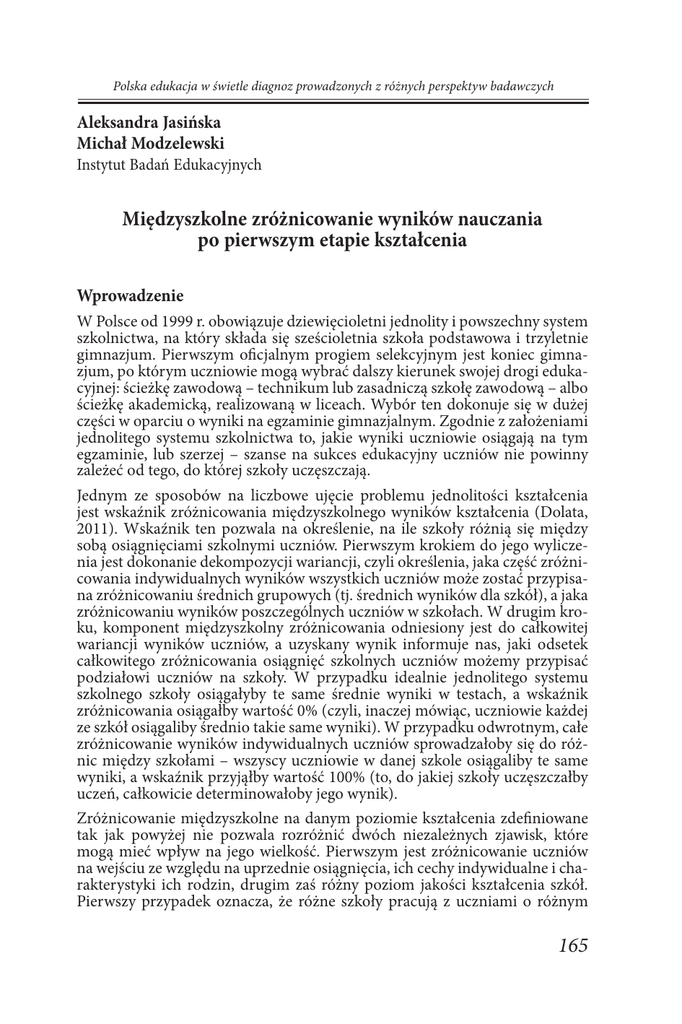 Polska edukacja w świetle diagnoz prowadzonych z różnych perspektyw badawczych Aleksandra Jasińska Michał Modzelewski Instytut Badań Edukacyjnych Międzyszkolne zróżnicowanie wyników nauczania po pierwszym etapie kształcenia Wprowadzenie W Polsce od 1999 r. obowiązuje dziewięcioletni jednolity i powszechny system szkolnictwa, na który składa się sześcioletnia szkoła podstawowa i trzyletnie gimnazjum. Pierwszym oficjalnym progiem selekcyjnym jest koniec gimnazjum, po którym uczniowie mogą wybrać dalszy kierunek swojej drogi edukacyjnej: ścieżkę zawodową – technikum lub zasadniczą szkołę zawodową – albo ścieżkę akademicką, realizowaną w liceach. Wybór ten dokonuje się w dużej części w oparciu o wyniki na egzaminie gimnazjalnym. Zgodnie z założeniami jednolitego systemu szkolnictwa to, jakie wyniki uczniowie osiągają na tym egzaminie, lub szerzej – szanse na sukces edukacyjny uczniów nie powinny zależeć od tego, do której szkoły uczęszczają. Jednym ze sposobów na liczbowe ujęcie problemu jednolitości kształcenia jest wskaźnik zróżnicowania międzyszkolnego wyników kształcenia (Dolata, 2011). Wskaźnik ten pozwala na określenie, na ile szkoły różnią się między sobą osiągnięciami szkolnymi uczniów. Pierwszym krokiem do jego wyliczenia jest dokonanie dekompozycji wariancji, czyli określenia, jaka część zróżnicowania indywidualnych wyników wszystkich uczniów może zostać przypisana zróżnicowaniu średnich grupowych (tj. średnich wyników dla szkół), a jaka zróżnicowaniu wyników poszczególnych uczniów w szkołach. W drugim kroku, komponent międzyszkolny zróżnicowania odniesiony jest do całkowitej wariancji wyników uczniów, a uzyskany wynik informuje nas, jaki odsetek całkowitego zróżnicowania osiągnięć szkolnych uczniów możemy przypisać podziałowi uczniów na szkoły. W przypadku idealnie jednolitego systemu szkolnego szkoły osiągałyby te same średnie wyniki w testach, a wskaźnik zróżnicowania osiągałby wartość 0% (czyli, inaczej mówiąc, uczniowie każdej ze szkół osiągaliby średnio takie same wyniki). W przypadku odwrotnym, całe zróżnicowanie wyników indywidualnych uczniów sprowadzałoby się do różnic między szkołami – wszyscy uczniowie w danej szkole osiągaliby te same wyniki, a wskaźnik przyjąłby wartość 100% (to, do jakiej szkoły uczęszczałby uczeń, całkowicie determinowałoby jego wynik). Zróżnicowanie międzyszkolne na danym poziomie kształcenia zdefiniowane tak jak powyżej nie pozwala rozróżnić dwóch niezależnych zjawisk, które mogą mieć wpływ na jego wielkość. Pierwszym jest zróżnicowanie uczniów na wejściu ze względu na uprzednie osiągnięcia, ich cechy indywidualne i charakterystyki ich rodzin, drugim zaś różny poziom jakości kształcenia szkół. Pierwszy przypadek oznacza, że różne szkoły pracują z uczniami o różnym 165 XIX Konferencja Diagnostyki Edukacyjnej, Gniezno 2013 poziomie uprzednich umiejętności lub różnych konfiguracjach cech indywidualnych i społecznych, mających wpływ na osiągnięcia, tzn., że w systemie istnieją szkoły, które przyjmują głównie lepszych uczniów, i takie, do których uczęszczają uczniowie słabsi. W drugiej sytuacji mamy do czynienia ze zjawiskiem, w którym szkoły nauczają z różną efektywnością, co przekłada się na zróżnicowanie ich średnich wyników. Najbardziej prawdopodobne jest jednak to, że zachodzą oba te zjawiska, przekładając się na obserwowane na danym etapie kształcenia zróżnicowanie szkół ze względu na wyniki nauczania. By dobrze zrozumieć tę swoistą dialektykę zróżnicowania, warto przedstawić dwa skrajne hipotetyczne scenariusze działania tych procesów. W pierwszym, maksymalizującym zróżnicowanie, oba wspomniane procesy działają w jednym kierunku. W systemie szkolnym mielibyśmy wtedy do czynienia z sytuacją, w której nie dość, że uczniowie byliby podzieleni między szkoły w zależności od swoich uprzednich osiągnięć lub cech indywidualnych i społecznych związanych z osiągnięciami szkolnymi, to, co więcej, szkoły skupiające uczniów lepszych uczyłyby zdecydowanie lepiej niż szkoły skupiające uczniów słabszych. Proces ten przyczyniałby się do zwiększania wyjściowego zróżnicowania wyników – lepsi stawaliby się jeszcze lepsi, a słabsi jeszcze słabsi. Drugim skrajnym scenariuszem jest ten, w którym procesy te wzajemnie się znoszą. W tym przypadku mamy do czynienia z wysokim poziomem segregacji uczniów „na wejściu”, ale system szkolny pełni funkcję kompensacyjną dla uczniów słabszych pod względem uprzednich osiągnięć. W tym scenariuszu szkoły skupiające słabszych uczniów osiągają średnio wyniki nie gorsze od szkół, do których uczęszczają uczniowie lepsi co do uprzednich osiągnięć lub o korzystniejszej konfiguracji cech indywidualnych i społecznych mających wpływ na osiągnięcia szkolne. W taki sposób można próbować interpretować przyczyny niskiego zróżnicowania międzyszkolnego, w sytuacji gdy pomiar osiągnięć podsumowuje pewien okres kształcenia. W przypadku gdy dysponujemy tylko wynikami osiągnięć szkolnych uczniów, rozplątanie wpływu tych dwóch procesów nie jest do końca możliwe. Sytuacja zmienia się jednak, gdy mamy dostęp do informacji o uprzednich osiągnięciach uczniów lub tych indywidualnych cech ucznia, które mogą mieć wpływ na jego osiągnięcia, ale nie są zależne od szkoły. Kontrolując je, jesteśmy w stanie „wytrącić” efekt związany z nielosowym przypisaniem uczniów o różnych charakterystykach do klas i uzyskać informację o zróżnicowaniu jakości pracy szkoły. Wskaźnik zróżnicowania międzyszkolnego w tej sytuacji pozwala określić, na ile szkoły różnią się co do średniej efektywności nauczania. Tak zdefiniowana miara jest punktem wyjścia dla badań szkolnych uwarunkowań 