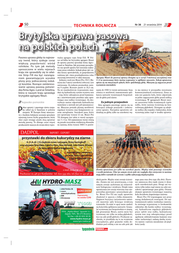 50 TECHNIKA ROLNICZA Nr 38 21 września 2014 Brytyjska uprawa pasowa na polskich polach kujawsko-pomorskie P okaz uprawy i pasowego siewu rzepaNX RGE\ï VLÚ Z ¥PLHOLQLH Z SRïRZLH VLHUSQLD : (XURSLH ğUP\ PDV]\QR ZH]NDĝG\PNROHMQ\PVH]RQHPVSU]HGDĝ\ UHMHVWUXMÈZ]URVWOLF]E\JRVSRGDUVWZNWöUH FKRÊ F]ÚĂÊ VZRMHJR DUHDïX FKFÈ XSUDZLDÊ PHWRGÈ SDVRZÈ 7R GODWHJR FRUD] ZLÚFHM SURGXFHQWöZPDV]\QGRVZRMHMRIHUW\ZSUR ZDG]D DJUHJDW\ W\SX 6WULSļ7LOO : 3RO VFHRGNLONXODWEU\W\MVNLHDJUHJDW\0]XUL GRXSUDZ\SDVRZHMVSU]HGDMHğUPD$JURļ /DQG]H¥PLHOLQD-DNSU]\]QDMHSRF]ÈWNR ZRWHQVSRVöEXSUDZ\E\ïRVWURĝQLHWUDNWR ZDQ\SU]H]UROQLNöZ-HGQDNSORQ\MDNLQL VNLHNRV]W\VSRZRGRZDï\ĝHJRVSRGDUVWZD URG]LQQHMDNLGXĝHSU]HGVLÚELRUVWZDUROQH ]DF]\QDMÈLQZHVWRZDÊZWDNLHPDV]\Q\ -HGQ\P]QLFKMHVW0]XUL3URļ7LO0D V]\QDPDPHWU\V]HURNRĂFLURERF]HMLMHVW ]DZLHV]DQD=DMHGQ\PSU]HMD]GHP]DVLH ZD U]ÚGöZ 5R]VWDZ SDVöZ WR FP 1D MHM VWDQGDUGRZ\P Z\SRVDĝHQLX ]QDM GXMHVLÚK\GUDXOLF]Q\V\VWHPZ\VLHZXQRQ ļVWRSNWöU\]DEH]SLHF]DSU]HGNDPLHQLD PLLQLHUöZQRĂFLDPLSU]HGQLH]ÚE\XSUD ZLDMÈFHRUD]UHGOLFHZ\VLHZDMÈFH=DG\V WU\EXFMH QDVLRQ RGSRZLDGD K\GUDXOLF]Q\ ZHQW\ODWRUDVLHZQLNMHVWSöïSQHXPDW\F] Q\ 0DV]\QD SRVLDGD Sï\QQÈ PRĝOLZRĂÊ UHJXODFML Z\VLHZX RUD] NRPSXWHURZ\ V\ VWHP ]DU]ÈG]DQLD 6]HURNRĂÊ SDVD NWöU\ MHVWXSUDZLDQ\Z\QRVLFP0]XUL3UR 7LOGRVWÚSQ\MHVWWDNĝHZZHUVML]DF]HSLD QHMLP2GQDMPQLHMV]HMZHUVMLUöĝQLÈ VLÚSU]HGHZV]\VWNLPZLHONRĂFLÈ]ELRUQLND QDQDVLRQDNWöUDZ\QRVLOZSRUöZ Fot. Tomasz Ślęzak x2 Pasowa uprawa gleby to najnowszy trend, który zyskuje coraz większą popularność wśród rolników. Po tym jak metody uproszczone w wielu rejonach kraju nie sprawdziły się to właśnie Strip–TilI ma być rozwiązaniem gwarantującym wysokie plony przy jednoczesnej redukcji kosztów. Rosnące zainteresowanie uprawą pasową potwierdza firma Agro–Land ze Śmielina, która w naszym kraju sprzedaje brytyjskie agregaty Mzuri. $JUHJDW\0]XULGRSDVRZHMXSUDZ\GRVWÚSQHVÈZZHUVMLPHWURZHM]DF]HSLDQHMRUD] LP]DZLHV]DQHMNWöUHPRĝQDZ\SRVDĝ\ÊZDSOLNDWRUQDZR]öZ6HNFMDXSUDZRZD RSLHUDVLÚQDPDV\ZQ\FK]ÚEDFKNWöUHVSXOFKQLDMÈJOHEÚ0DV]\QDMÈ]DJÚV]F]DSU]HG Z\VLDQLHP]LDUQLDNöZ QDQLXGROZZHUVML]DZLHV]DQHM,QQD UöĝQLFDWRPRĝOLZRĂÊ]DPRQWRZDQLDDSOL NDWRUDQDZR]öZZ\VLHZDQ\FKEH]SRĂUHG QLRGRJOHE\SRG]LDUQR WR PD PLHMVFH Z SU]\SDGNX VWRVRZDQLD NRQZHQFMRQDOQ\FKUR]VLHZDF]\=DUD]]D QLPMHVWJXPRZHNRïRNWöUHRGSRZLDGD ]DSHïQH]DJÚV]F]HQLHJOHE\SU]HGUHGOLFÈ Z\VLHZDMÈFÈ : DJUHJDWDFK 0]XUL PRĝ Za jednym przejazdem QD ]DVWRVRZDÊ NLOND Z\PLHQQ\FK W\SöZ ,GHD DJUHJDWX SDVRZHJR RSLHUD VLÚ QD UHGOLF NWöUH QDVLRQD Z\VLHZDMÈ QD NRQ NRQFHSFML MHGQHJR SU]HMD]GX L MHGQRUD WURORZDQÈJïÚERNRĂÊ'RVWÚSQHVÈRGUÚE ]RZHM XSUDZ\ 1DU]ÚG]LD XSUDZRZH RG QHUHGOLFHGODU]HSDNXLNXNXU\G]\NWöUH G]LDïXMÈQDJOHEÚW\ONRQDV]HURNRĂFLZÈ Z\VLHZDMÈMHGHQU]ÈGZĂURGNXXSUDZLD =LHPLD XSUDZLDQD MHVW W\ONR QD V]HURNRĂÊ SDVöZ 0LÚG]\ QLPL SR]RVWDMH ĂFLHUQLVNR LUHV]WNLSRĝQLZQH&KRÊSRVDP\PVLHZLHSROHQLHZ\JOÈGD]E\WHVWHW\F]QLHWRQDVLRQD PDMÈGREUHZDUXQNLGRZ]URVWXLV]\ENR]DNU\ZDMÈPLÚG]\U]ÚG]LD -) silnik Perkins 3A -) rewers elektrohydrauliczny -) EHR -) klimatyzacja Zapraszamy na stoisko C290 T1003 33+ķ+\GUR0DV]ĵ6ÚFHUVNL6- =DSROH%U]HěQR 7HOID[ www.hydro-masz.pl ZZZW\PWUDNWRUSO VNLFKSDVöZ0LÚG]\QLPL]RVWDMHĂFLHUQL VNR=LHPLDQLHMHVWSU]HZUDFDQDDW\P VDP\P ]RVWDMH ]DFKRZDQD MHM UöĝQRURG QRĂÊELRORJLF]QDLVWUXNWXUD']LÚNLWHPX RJUDQLF]DQDMHVWHUR]MDZLHWU]QDRUD]QLH SRWU]HEQHSDURZDQLHLSU]HV\FKDQLHJOH E\ 0]XUL 3URļ7LO PD U]ÚG\ XSUDZRZH ]EXGRZDï Z RSDUFLX R NLOND HOHPHQWöZ 1DMSLHUZEU\W\MVF\LQĝ\QLHURZLHXPLHĂ FLOL PDV\ZQH ]ÚE\ NUXV]ÈFH VWUXNWXUÚ ĂFLHUQLVND=DQLPLZRSFMLPRĝH]QDOHěÊ VLÚNRñFöZNDDSOLNDWRUDQDZR]öZ*UDQX ODWZ\VLHZDQ\MHVWEH]SRĂUHGQLRZ]LHPLÚ -DN JZDUDQWXMH 0]XUL QDZö] PRĝH E\Ê Z\VLHZDQ\QLHW\ONRQDMHGQÈJïÚERNRĂÊ OHF]QDFDï\SURğOJOHERZ\3URGXFHQW]D FKZDODĝHSU]HNïDGDVLÚWRQDZ\PLHUQH RV]F]ÚGQRĂFL JG\ĝ JUDQXODW WUDğD GR NïDGQLHSRGURĂOLQÚDQLHQDFDïHSROHMDN tygodnik PORADNIK rolniczy QHJRSDVDRUD]GZDW\S\GOD]Eöĝ3LHUZ V]\XPLHV]F]DGZDU]ÚG\]LDUHQZVNUDM Q\FK V]HURNRĂFLDFK SDVD 'UXJL ]DĂ Z\ VLHZDW\ONRMHGHQU]ÈG]LDUHQQDFDïHMV]H URNRĂFLXSUDZLDQHJRSDVDJOHE\2VWDWQL HOHPHQWXSUDZRZRZ\VLHZDMÈF\VWDQRZLÈ NRïDGRFLVNRZHGRJQLDWDMÈFHQDVLRQD 0]XUL3URļ7LOZVSRPDJDQ\MHVWSU]H] V]HUHJ GRGDWNRZ\FK UR]ZLÈ]Dñ 'R QDM ZDĝQLHMV]\FKQDOHĝ\UR]G]LHODF]PDWHULD ïX VLHZQHJR Z\SRVDĝRQ\ Z IRWRNRPöUNL RGG]LHOQH GOD NDĝGHM UHGOLF\ Z\VLHZDMÈ FHM K\GUDXOLF]QD UHJXODFMD JïÚERNRĂFL SUDF\ ]ÚEöZ RUD] UHGOLF K\GUDXOLF]Q\ V\VWHP QRQ VWRS ]DEH]SLHF]DMÈF\ SU]HG ]JXEQ\PRGG]LDï\ZDQLHPNDPLHQLRUD] UDGDU]DFKRZXMÈF\]DGDQÈGDZNÚZ\VLH ZXQDVLRQLQDZR]XQLH]DOHĝQLHRGSUÚG NRĂFLMD]G\ Nr 38 21 września 2014 Uprawa kombajnem 3LHUZV]È PDV]\QÈ XSUDZRZÈ ]GDQLHP 0]XUL MHVW NRPEDMQ 0RĝQD ]RVWDZLÊ ĂFLHUQLVNR QDZHW GRV\Ê GïXJLH 3U]\ W\P URG]DMX XSUDZ\ SRV]F]HJöOQ\FK SDVöZ QLH WU]HED Z\NRQ\ZDÊ ZLHOX]DELHJöZQLHPDGRJQLDWDQLDLHUR]MLQLHXZDOQLDVLÚD]RW GRDWPRVIHU\SRGF]DVSU]HU]XFDQLD]LHPL 'OD VNXWHF]QHJR VLHZX VïRPD PXVL E\Ê UöZQRPLHUQLH SRFLÚWD L UR]PLHV]F]RQD QD FDïHM SRZLHU]FKQLFRPDSU]HNïDGDÊVLÚ WDNĝHQDVWZRU]HQLHGREU\FKZDUXQNöZGRUR]ZRMXĝ\FLDELRORJLF]QHJRSRQLĝHMZDUVWZ\NWöUÈ WZRU]È UHV]WNL SRĝQLZQH 'XĝD LORĂÊ VïRP\ RUD] SU]HMD]G DJUHJDWXSDVRZHJRSRZRGXMHĝHSROH QLHSUH]HQWXMHVLÚHVWHW\F]QLH TECHNIKA ROLNICZA U]\VWQH ZDUXQNL GOD ZHJHWDFML ]Eöĝ&RFLHNDZHZHZV]\VWNLFK VSRVREDFK SV]HQLFD SORQRZDïD QLHPDO LGHQW\F]QLH : ¥PLHOLQLHXSUDZDSDVRZDGDïDW KD RUND WKD ]DĂ V\VWHP XSURV]F]RQ\WKD-HGQDN SHïHQREUD]LZ\QLNLEDGDñZ\- ïDQLDMÈVLÚGRSLHURSRSU]HGVWDZLHQLX NRPSOHWQ\FK QDNïDGöZ SRQLHVLRQ\FK QD FDï\ V\VWHP XSUDZ\$JUHJDWEH]RUNRZ\PXVLDï SUDFRZDÊ KKD NRV]W MHJR HNVSORDWDFML L ZDUWRĂÊ ]Xĝ\WHJRSDOLZDZ\QLRVïD]ï : SU]\SDGNX XSUDZ\ SDVRZHM Niskie koszty $E\ UR]ZLDÊ ZÈWSOLZRĂFL FR GR WHM XSUDZ\ Z ¥PLHOLQLH ]RVWDï\ZU]DïRĝRQHZLHOROHWQLHGRĂZLDGF]HQLDĂFLVïH3RUöZQXMÈ RQH UöĝQH VSRVRE\ XSUDZ\ UROLRUNRZ\EH]RUNRZ\LSDVRZ\-XĝSRSLHUZV]\FKWHJRURF]Q\FK]ELRUDFKZ\QLNLSU]HGVWDZLDMÈ VLÚ EDUG]R 