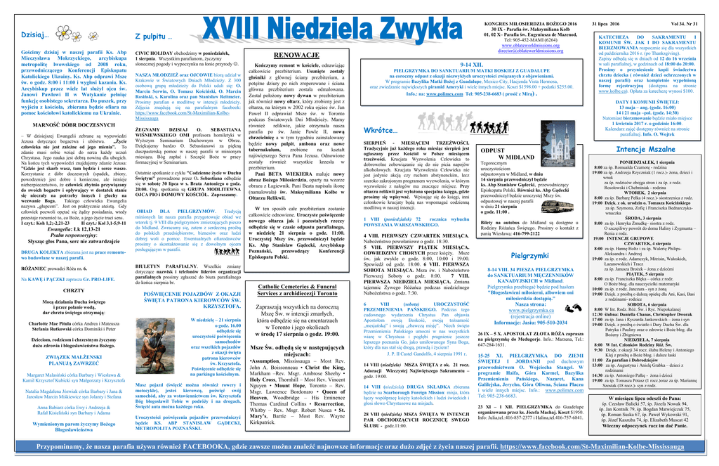 Dzisiaj… Z pulpitu … Gościmy dzisiaj w naszej parafii Ks. Abp Mieczysława Mokrzyckiego, arcybiskupa metropolitę lwowskiego od 2008 roku, przewodniczącego Konferencji Episkopatu Katolickiego Ukrainy. Ks. Abp odprawi Msze św. o godz. 8:00 i 11:00 i wygłosi kazania. Ks. Arcybiskup przez wiele lat służył ojcu św. Janowi Pawłowi II w Watykanie pełniąc funkcję osobistego sekretarza. Do puszek, przy wyjściu z kościoła, zbierana będzie ofiara na pomoc kościołowi katolickiemu na Ukrainie. CIVIC HOLIDAY obchodzimy w poniedziałek, 1 sierpnia. Wszystkim parafianom, życzymy słonecznej pogody i wypoczynku na łonie przyrody . MARNOŚĆ DÓBR DOCZESNYCH – W dzisiejszej Ewangelii zebrane są wypowiedzi Jezusa dotyczące bogactwa i ubóstwa. „Życie człowieka nie jest zależne od jego mienia”. To zdanie musi sobie wziąć do serca każdy uczeń Chrystusa. Jego nauka jest dobrą nowiną dla ubogich. Na końcu tych wypowiedzi znajdujemy zdanie Jezusa: ”Gdzie jest skarb wasz, tam będzie i serce wasze. Korzystanie z dóbr doczesnych (spadek, zbiory, powodzenie) jest dobre i konieczne, ale istnieje niebezpieczeństwo, że człowiek zbytnio przywiązany do swoich bogactw i opływający w dostatek stanie się nieczuły na potrzeby innych i głuchy na wezwanie Boga. Takiego człowieka Ewangelia nazywa „głupcem”. Jest on praktycznie ateistą. Gdy człowiek pozwoli opętać się żądzy posiadania, wtedy przestaje rozumieć to, co Boże, a jego życie traci sens. I czyt.: Koh 1,2;-2,21-23 II czyt.: Kol 3,1-5,9-11 Ewangelia: Łk 12,13-21 Psalm responsoryjny: Słysząc głos Pana, serc nie zatwardzajcie DRUGA KOLEKTA zbierana jest na prace remontowo budowlane w naszej parafii. RÓŻANIEC prowadzi Róża nr. 6. Na KAWĘ i PĄCZKI zaprasza Gr. PRO-LIFE. CHRZTY Mocą działania Ducha świętego i przez polanie wodą, dar chrztu świętego otrzymają: Charlotte Mae Pitula córka Andrea i Mateusza Stefania Rutkowski córka Dominiki i Peter Dzieciom, rodzicom i chrzestnym życzymy dużo zdrowia i błogosławieństwa Bożego. ZWIĄZEK MAŁŻENSKI PLANUJĄ ZAWRZEĆ Margaret Malasiński córka Barbary i Wiesława & Kamil Krzysztof Kubicki syn Małgorzaty i Krzysztofa Natalia Magdalena Józwiak córka Barbary i Jana & Jarosław Marcin Miśkiewicz syn Jolanty i Stefana Anna Babiarz córka Ewy i Andrzeja & Rafał Kisieliński syn Barbary i Adama Wymienionym parom życzymy Bożego Błogosławieństwa . NASZA MŁODZIEŻ oraz OJCOWIE biorą udział w Krakowie w Światowych Dniach Młodzieży. Z 300 osobową grupą młodzieży do Polski udali się: O. Marcin Serwin, O. Tomasz Kościński, O. Marcin Rosiński, s. Karolina oraz pan Stanisław Reitmeier. Prosimy parafian o modlitwę w intencji młodzieży. Zdjęcia znajdują się na parafialnym facebook: https://www.facebook.com/St-Maximilian-KolbeMississauga ŻEGNAMY DZISIAJ O. SEBASTIANA WIŚNIEWSKIEGO OMI profesora homiletyki w Wyższym Seminarium Duchownym w Obrze. Dziękujemy bardzo O. Sebastianowi za piękną duszpasterską pomoc w naszej parafii w minionym miesiącu. Bóg zapłać i Szczęść Boże w pracy formacyjnej w Seminarium. Ostatnie spotkanie z cyklu "Codzienne życie w Duchu Świętym" prowadzone przez O. Sebastiana odbędzie się w sobotę 30 lipca w s. Brata Antoniego o godz. 20:00. Org. spotkania są GRUPA MODLITEWNA OJCA PIO i DOMOWY KOŚCIÓŁ. Zapraszamy. OBIAD DLA PIELGRZYMÓW. Tradycją minionych lat nasza parafia przygotowuje obiad we wtorek tj. 9 VIII dla pielgrzymów zmierzających pieszo do Midland. Zwracamy się, zatem z serdeczną prośbą do polskich przedsiębiorstw, biznesów oraz ludzi dobrej woli o pomoc. Ewentualnych ofiarodawców prosimy o skontaktowanie się z dowolnym ojcem posługującym w parafii. BIULETYN PARAFIALNY. Wszelkie zmiany dotyczące nazwisk i telefonów liderów organizacji parafialnych prosimy zgłaszać do biura parafialnego do końca sierpnia br. POŚWIĘCENIE POJAZDÓW Z OKAZJI ŚWIĘTA PATRONA KIEROWCÓW ŚW. KRZYSZTOFA. W niedzielę – 21 sierpnia o godz. 16.00 odbędzie się uroczystość poświęcenia samochodów oraz wszelkich pojazdów z okazji święta patrona kierowców św. Krzysztofa. Poświęcenie odbędzie się na parkingu kościelnym. Masz pojazd (święcić można również rowery i motocykle), jesteś kierowcą, poświęć swój samochód, aby za wstawiennictwem św. Krzysztofa Bóg błogosławił Tobie w podróży i na drogach. Święcić auta można każdego roku. Uroczystości poświęcenia pojazdów przewodniczyć będzie KS. ABP STANISŁAW GĄDECKI, METROPOLITA POZNAŃSKI. KONGRES MIŁOSIERDZIA BOŻEGO 2016 30 IX - Parafia św. Maksymiliana Kolb 01, 02 X– Parafia św. Eugeniusza de Mazenod, Tel: 905-452-MAMI (6264) www.oblateworldmissions.org [email protected] RENOWACJE Kończymy remont w kościele, odnawiając całkowicie prezbiterium. Usunięte zostały głośniki z głównej ściany prezbiterium, a potężne dziury po nich zreperowane i ściana główna prezbiterium została odmalowana. Został położony nowy dywan w prezbiterium jak również nowy ołtarz, który zrobiony jest z ołtarza, na którym w 2002 roku ojciec św. Jan Paweł II odprawiał Msze św. w Toronto podczas Światowych Dni Młodzieży. Mamy również relikwie, jakie otrzymała nasza parafia po św. Janie Pawle II, nową chrzcielnicę a w tym tygodniu zainstalowany będzie nowy pulpit, ambona oraz nowe tabernakulum, zrobione na kształt najświętszego Serca Pana Jezusa. Odnowione zostały również wszystkie krzesła w prezbiterium. Pani BETA WIEKIERA maluje nowy obraz Bożego Miłosierdzia, oparty na wzorze obrazu z Łagiewnik. Pani Beata napisała ikonę (namalowała) św. Maksymiliana Kolbe w Ołtarzu Relikwii. W ten sposób całe prezbiterium zostanie całkowicie odnowione. Uroczyste poświęcenie nowego ołtarza jak i pozostałych rzeczy odbędzie się w czasie odpustu parafialnego, w niedzielę 21 sierpnia o godz. 11:00. Uroczystej Mszy św. przewodniczył będzie Ks. Abp Stanisław G