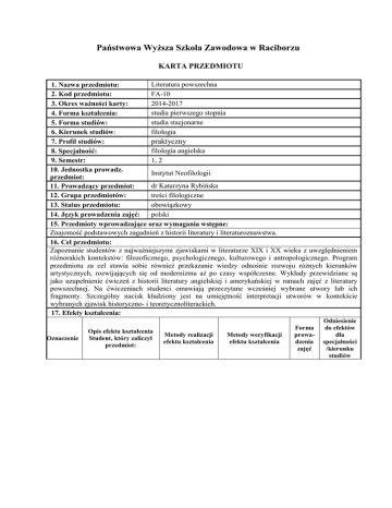 Państwowa Wyższa Szkoła Zawodowa w Raciborzu KARTA PRZEDMIOTU Literatura powszechna 1. Nazwa przedmiotu: FA-10 2. Kod przedmiotu: 2014-2017 3. Okres ważności karty: studia pierwszego stopnia 4. Forma kształcenia: studia stacjonarne 5. Forma studiów: 6. Kierunek studiów: filologia 7. Profil studiów: praktyczny filologia angielska 8. Specjalność: 1, 2 9. Semestr: 10. Jednostka prowadz. Instytut Neofilologii przedmiot: dr Katarzyna Rybińska 11. Prowadzący przedmiot: treści filologiczne 12. Grupa przedmiotów: 13. Status przedmiotu: obowiązkowy 14. Język prowadzenia zajęć: polski 15. Przedmioty wprowadzające oraz wymagania wstępne: Znajomość podstawowych zagadnień z historii literatury i literaturoznawstwa. 16. Cel przedmiotu: Zapoznanie studentów z najważniejszymi zjawiskami w literaturze XIX i XX wieku z uwzględnieniem różnorakich kontekstów: filozoficznego, psychologicznego, kulturowego i antropologicznego. Program przedmiotu za cel stawia sobie również przekazanie wiedzy odnośnie rozwoju różnych kierunków artystycznych, rozwijających się od modernizmu aż po czasy współczesne. Wykłady przewidziane są jako uzupełnienie ćwiczeń z historii literatury angielskiej i amerykańskiej w ramach zajęć z literatury powszechnej. Na ćwiczeniach studenci omawiają przeczytane wcześniej wybrane utwory lub ich fragmenty. Szczególny nacisk kładziony jest na umiejętność interpretacji utworów w kontekście wybranych zjawisk historyczno- i teoretycznoliterackich. 17. Efekty kształcenia: Oznaczenie Opis efektu kształcenia Student, który zaliczył przedmiot: Metody realizacji efektu kształcenia Metody weryfikacji efektu kształcenia Forma prowadzenia zajęć Odniesienie do efektów dla specjalności /kierunku studiów Wypowiedź ustna i pisemna/ egzamin pisemny lub ustny 03 zapamiętuje podstawowe informacje na temat teorii dzieła literackiego, poetyki i teorii literatury, które następnie wykorzystuje przy konstruowaniu własnej argumentacji naukowej. Prezentacja/ wypowiedź kontrolna w formie pisemnej K_W07 (+++) wykład, ćwiczenia 02 ma podstawową wiedzę na temat metodologii interpretacji dzieł literackich z uwzględnieniem ich kontekstu kulturowego i historycznego zorientowaną na zastosowanie w praktyce; rozpoznaje wykorzystaną w trakcie analizy tekstu artystycznego metodę badawczą.. K_W06 (+++) wykład, ćwiczenia Wypowiedź ustna lub pisemna/ test sprawdzający/egzam in pisemny lub ustny wykład/ ćwiczenia 01 ma uporządkowaną wiedzę na temat historii piśmiennictwa i/lub tradycji ustnej wybranego obszaru językowego, uwzględniającą kanon literatury – poezji, dramatu, prozy zorientowaną na zastosowanie w praktyce 1.Ocena wypowiedzi ustnej lub pisemnej weryfikująca stopień opanowania wiedzy z zakresu metodologii badań literackich. 2. Ocena testu odzwierciedlająca zakres opanowanej przez studenta wiedzy teoretycznej z dziedziny literaturoznawstwa. 3. Ocena egzaminu pisemnego lub ustnego z zakresu wiedzy przewidzianej w treściach programowych przedmiotu. 1. Ocena wypowiedzi ustnej w formie np. dialogu, dyskusji, wywiadu, komentarza, recenzji pozwalająca ocenić stopień znajomości terminologii z zakresu literaturoznawstwa przy jednoczesnym uwzględnieniu umiejętności jej praktycznego zastosowania w odniesieniu do analizy wybranego dzieła literackiego. 2. Ocena wypowiedzi pisemnej sprawdzająca znajomość aparatu pojęciowego i definicji teoretyczno-literackich. 3. Ocena egzaminu pisemnego lub ustnego z zakresu wiedzy przewidzianej w treściach programowych przedmiotu. 1. Ocena prezentacji odzwierciedlająca stopień praktycznego opanowania wiedzy z zakresu wybranych metod interpretacji dzieł literackich. 2. Ocena wypowiedzi kontrolnej w formie pisemnej (np. analiza stylistyczno- strukturalna tekstu literackiego) sprawdzająca znajomość metodologii badań filologicznych z uwzględnieniem ich kontekstu kulturowohistorycznego. K_W08 (++) Wypowiedź ustna/dyskusja z wykorzystaniem samooceny własnych kompetencji badawczych. Ocena wypowiedzi ustnej/dyskusji sprawdzająca poczynione przez studenta postępy z dziedziny literaturoznawstwa w trakcie trwania zajęć. K_U12 (+++) ćwiczenia 06 Opracowanie dossier tematycznego K_U03 (+++) ćwiczenia 05 adoptuje umiejętność stosowania metajęzyka współczesnego literaturoznawstwa w celu jego praktycznego stosowania w analizie i interpretacji dzieła literackiego weryfikuje i udoskonala poziom swojej wiedzy i zakres nabytych umiejętności, rozumie potrzebę ciągłego dokształcania się zawodowego i rozwoju osobistego, dokonuje samooceny własnych kompetencji, wyznacza i aranżuje kierunki własnego rozwoju i kształcenia Analiza tekstu literackiego ustna lub pisemna/ ćwiczenia ustne lub pisemne ćwiczenia 04 potrafi posługiwać się podstawowymi ujęciami teoretycznymi w celu analizowania utworów literackich i zjawisk językowych, rozróżnia i reorganizuje poznane metody badawcze. 1.Ocena analizy tekstu literackiego ustna lub pisemna sprawdzająca umiejętność wykorzystania nabytej przez studenta wiedzy teoretycznej oraz zapamiętanych przezeń definicji teoretycznoliterackich. 2. Ocena ćwiczeń ustnych lub pisemnych odzwierciedlająca umiejętność doboru właściwego aparatu pojęciowego w trakcie analizy wybranego tekstu. Ocena dossier tematycznego weryfikująca nabytą przez studenta umiejętność dostosowania metod, procedur i praktyk filologicznych do określonego tematyką zagadnienia. K_K01 (++) 18. Formy i wymiar zajęć: W. (15h + 15h), Ćw. (15h + 15h) 19. Treści kształcenia: Powieść realistyczna: Gustave Flaubert, Honoré de Balzac. Realizm psychologiczny: Fiodor Dostojewski, Henrik Ibsen. Naturalizm estetyczny: Charles Robert Darwin, Hippolyte A. Taine, Naturalizm estetyczny w sztuce: Théophile Gautier, Emil Zola, Anatole France, Guy de Maupassant. Symbolizm w poezji francuskiej: Charles Baudelaire, Paul Verlaine, Arthur Rimbaud. Symbolizm w poezji
