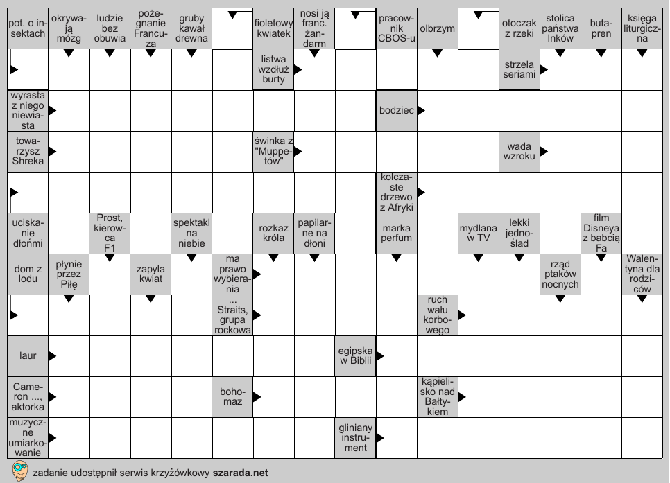 pożeludzie gnanie gruby pot. o in- okrywaj a ˛ bez sektach Francu- kawał mózg obuwia drewna za nosi ja˛ fioletowy franc. kwiatek żandarm pracownik olbrzym CBOS-u listwa wzdłuż burty stolica otoczak pa ństwa z rzeki Inków butapren ksiega ˛ liturgiczna strzela seriami wyrasta z niego niewiasta bodziec towarzysz Shreka świnka z "Muppetów" wada wzroku kolczaste drzewo z Afryki Prost, kierowca F1 uciskanie dłońmi dom z lodu płynie przez Piłe˛ rozkaz papilarne na króla dłoni spektakl na niebie zapyla kwiat ma prawo wybierania ... Straits, grupa rockowa Cameron ..., aktorka rzad ˛ ptaków nocnych ruch wału korbowego egipska w Biblii laur kapieli˛ sko nad Bałtykiem bohomaz muzyczne umiarkowanie zadanie udostepnił ˛ serwis krzyżówkowy szarada.net film Disneya z babcia˛ Fa mydlana lekki jednow TV ślad marka perfum gliniany instrument Walentyna dla rodziców