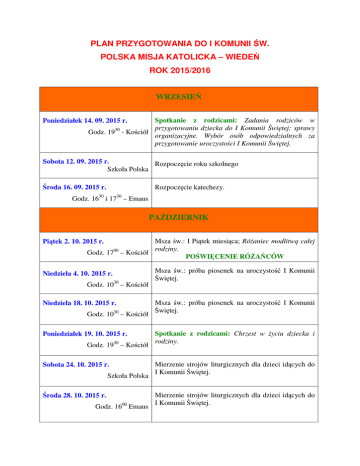 PLAN PRZYGOTOWANIA DO I KOMUNII ŚW. POLSKA MISJA KATOLICKA – WIEDEŃ ROK 2015/2016 WRZESIEŃ Spotkanie z rodzicami: Zadania rodziców w przygotowaniu dziecka do I Komunii Świętej; sprawy Godz. 1930 - Kościół organizacyjne. Wybór osób odpowiedzialnych za przygotowanie uroczystości I Komunii Świętej. Poniedziałek 14. 09. 2015 r. Sobota 12. 09. 2015 r. Rozpoczęcie roku szkolnego Szkoła Polska Środa 16. 09. 2015 r. Rozpoczęcie katechezy. Godz. 1630 i 1730 – Emaus PAŹDZIERNIK Piątek 2. 10. 2015 r. Msza św.: I Piątek miesiąca; Różaniec modlitwą całej rodziny. Godz. 1700 – Kościół POŚWIĘCENIE RÓŻAŃCÓW Niedziela 4. 10. 2015 r. Godz. 1030 – Kościół Niedziela 18. 10. 2015 r. Godz. 1030 – Kościół Poniedziałek 19. 10. 2015 r. Godz. 1930 – Kościół Sobota 24. 10. 2015 r. Szkoła Polska Środa 28. 10. 2015 r. Godz. 1600 Emaus Msza św.: próba piosenek na uroczystość I Komunii Świętej. Msza św.: próba piosenek na uroczystość I Komunii Świętej. Spotkanie z rodzicami: Chrzest w życiu dziecka i rodziny. Mierzenie strojów liturgicznych dla dzieci idących do I Komunii Świętej. Mierzenie strojów liturgicznych dla dzieci idących do I Komunii Świętej. LISTOPAD Piątek 6. 11. 2015 r. Msza św.: I Piątek miesiąca; Modlitwa za zmarłych wyrazem pamięci, wdzięczności i pomocy… Godz. 1700 – Kościół POŚWIĘCENIE KSIĄŻECZEK Niedziela 8. 11. 2015 r. Godz. 1030 – Kościół Niedziela 22. 11. 2015 r. Godz. 1030 – Kościół Msza św.: próba piosenek na uroczystość I Komunii Świętej. Msza św.: próba piosenek na uroczystość I Komunii Świętej. Spotkanie z rodzicami: O wychowaniu dziecka do modlitwy i modlitwie z dzieckiem. Godz. 1930 – Kościół Omówienie spraw związanych z rolami dzieci oraz rodziców podczas uroczystości I Komunii Świętej. Poniedziałek 23. 11. 2015 r. GRUDZIEŃ Msza św.: Roraty; I Piątek miesiąca; Adwent czuwaniem i przygotowaniem na spotkanie z Godz. 1700 – Kościół przychodzącym Jezusem. Piątek 4. 12. 2015 r. 5 – 13. 12. 2015 r. Rekolekcje Adwentowe Msza św.: św. Mikołaj nauczycielem wrażliwości serca. Niedziela 6. 12. 2015 r. Godz. 1030 – Kościół Zbiórka prezentów dla potrzebujących dzieci. Msza św.: Roraty; Matka Boża prowadzi nas na spotkanie z Jezusem. Godz. 1700 – Kościół POŚWIĘCENIE MEDALIKÓW Piątek 11. 12. 2015 r. Piątek 18. 12. 2015 r. Godz. 1700 – Kościół Msza św.: Roraty; Przygotuję Ci serce o Chryste – błogosławieństwo żłóbka. 23. 12. 2015 r. – 10. 01. 2016 r. Boże Narodzenie – przerwa świąteczna (ferie szkolne). STYCZEŃ Styczeń – cały miesiąc Kolęda – możliwość indywidualnego zaproszenia kapłana z wizytą. Środa 13. 01. 2016 r. Wznowienie katechezy po świątecznej przerwie. Godz. 1630 i 1730 – Emaus Niedziela 17. 01. 2016 r. 30 Godz. 10 - Kościół Msza św.: wspólne kolędowanie przy żłóbku. OSTATECZNY TERMIN DOSTARCZENIA DOKUMENTU O SAKRAMENCIE CHRZTU DZIECKA! 30. 01. – 7. 02. 2016 r. FERIE SEMESTRALNE - NIE MA KATECHEZY LUTY Msza św. I Piątek miesiąca Piątek 5. 02. 2016 r. Godz. 1700 – Kościół Droga Krzyżowa Piątek 12. 02. 2016 r. Godz. 1700 – Kościół Niedziela 14. 02. 2016 r. Godz. 1030 – Kościół Msza św.: próba piosenek na uroczystość I Komunii Świętej. Spotkanie z rodzicami: O świętowaniu niedzieli. Zgłaszanie dzieci i rodziców do poszczególnych ról Godz. 19 - Kościół podczas uroczystości I Komunii Świętej. Rozdanie alb. Poniedziałek 15. 02. 2016 r. 30 Piątek 19. 02. 2016 r. Droga Krzyżowa 00 Godz. 17 – Kościół Niedziela 21. 02. 2016 r. Msza św. – próba piosenek na uroczystość I Komunii 30 Godz. 10 – Kościół Świętej. Piątek 26. 02. 2016 r. Godz. 1700 – Kościół Droga Krzyżowa MARZEC Msza św.: I Piątek miesiąca; Droga Krzyżowa Piątek 4. 03. 2016 r. Godz. 1700 – Kościół Niedziela 6. 03. 2015 r. 30 Godz. 10 – Kościół Msza św. – próba piosenek na uroczystość I Komunii Świętej. Spotkanie z rodzicami: O pierwszej spowiedzi i Poniedziałek 7. 03. 2015 r. Godz. 1930 – Kościół przygotowaniu do niej dziecka. Droga Krzyżowa Piątek 11. 03. 2016 r. Godz. 1700 – Kościół Niedziela 13. 03. 2016 r. Godz. 1030 – Kościół Msza św. – próba piosenek na uroczystość I Komunii Świętej. 13. 03. – 20. 03. 2016 REKOLEKCJE WIELKOPOSTNE Msza św.: Poświęcenie palm. Niedziela 20. 03. 2016 r. Godz. 1030 – Kościół 23 – 29. 03. 2016 r. PRZERWA ŚWIĄTECZNA - WIELKANOC Środa 30. 03. 2016 r. Wznowienie katechezy po świątecznej przerwie. 30 Godz. 17 Emaus Niedziela 3. 04. 2016 r. Godz. 1030 – Kościół Poniedziałek 4. 04. 2016 r. Godz. 1930 – Kościół Niedziela 10. 04. 2016 r. Godz. 1030 – Kościół Msza św. – próba piosenek na uroczystość I Komunii Świętej. Spotkanie z rodzicami: O przeżywaniu dnia I Komunii Świętej. Sprawy organizacyjne. Msza św. – próba piosenek na uroczystość I Komunii Świętej. Poniedziałek 18. 04. 2016 r. Godz. 1630 – Kościół Próba przed I Komunią Świętą DLA WSZYSTKICH DZIECI Środa 20. 04. 2016 r. Próba przed I Komunią Świętą DLA WSZYSTKICH DZIECI Godz. 16 – Kościół 30 Sobota 23. 04. 206 r. Godz. 1600 - Kościół SPOWIEDŹ Odnowienie Przyrzeczeń Chrztu Świętego. Poświęcenie alb. Poniedziałek 25. 04. 2016 r. Próba przed I Komunią Świętą DLA WSZYSTKICH DZIECI Godz. 16 – Kościół 30 Środa 27. 04. 2016 r. Próba przed I Komunią Świętą DLA WSZYSTKICH DZIECI Godz. 16 – Kościół 30 Przygotowanie kościoła na uroczystość I Komunii św. Piątek 29. 04. 2016 r. Godz. 1930 – Kościół Sobota 30. 04. 2016 r. Godz. 1000 - Kościół • • UROCZYSTOŚĆ PIERWSZEJ KOMUNII ŚWIĘTEJ Rozdanie pamiątkowych obrazków Zdjęcia MAJ BIAŁY TYDZIEŃ Niedziela 1. 05. 2016 r. Msza św. – Dzień wdzięczności Panu Bogu Godz. 1030 – Kościół Poniedziałek 2. 05. 2016 r. Msza św. – Dzień wdzięczności Rodzicom Go