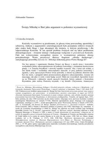 Aleksander Naumow Święty Mikołaj w Bari jako argument w polemice wyznaniowej 1.Ucieczka świętych. Kościoły wyznaniowe są przekonane, że głoszą wiarę powszechną, apostolską i soborową. Jednym z argumentów soteriologicznych było posiadanie relikwii świętych jako znaku łaski Boga i Jego akceptacji dla miejsca, w którym przebywają i dla odpowiedniego Kościoła. W ten sposób problem świętych stał się także problemem eklezjologicznym – świętość istnieje i funkcjonuje wyłącznie w prawdziwym Kościele. Fakt ten wykorzystano szczególnie mocno w wyznaniowej polemice okresu potrydenckiego. Warto przytoczyć dłuższy fragment „obroku duchowego”, zamykającego przeróbkę Żywota św. Mikołaja dokonaną przez Piotra Skargę SJ1: Nie bez sprawy i opatrzności Boskiej Święci się Boscy z onych stron i kościołów wschodnich (które odszczepieństwem od jedności kościelnej, i rozmaitem heretyctwem ginęły, i w Turecką brzydkość i niewolę wpadły) wynosili. Aby i kości ich wołały, a one harde Greki i wschodnie odszczepieńce nauczali: iż przy jedności kościelnej i zgodzie, i przy opoczystym Piotrze trwać potrzeba, a okrom tej jedności zbawion nikt być nie może, i potępiali takim przenoszeniem głupstwo odszczepieńskie, rozumu ich nauczając, tak jako w ciele z nimi będąc uczyli. Mało nie wszystkich Apostołów kości są we Włoszech i doktorów onych zacnych Greckich, którzy jedność z Kościołem Rzymskim, jako stolicą Piotrową trzymali, i tej bronili: Chryzostom, Atanazyusz, 1 Żywot św. Mikołaja, Mirreńskiego biskupa z Greckich pisarzów zebrany, zwłaszcza z Metafrasta, i od Leonarda Justiniana Patrycyusza Weneckiego, i innych, położony u Lipomana Toma I. Żył około R.P. 300. Podstawowym źródłem opracowania ks. Skargi był tom Sanctorum priscorum patrum vitae numero centum sexagintatres, per gravissimos et probatissimos auctores conscriptae, et nuper per R.P.D. Aloysium Lipomanum Episcopum Veronensem in unum volumen redactae, cum scholijs eiusdem omnium praesentium haereticorum blasphemias et delyramenta profligantibus, Venetiis, ad signum Spei, 1551, który później, do roku 1560 rozrośnie się do ośmiu tomów, włączając m.in. pierwsze łacińskie wydanie menalogionu Metafrastesa (w tomach V-VII). Materiał zgromadzony przez Alojzego (vel Luigiego) Lippomana, zmarłego w 1559 r., został uporządkowany przez Wawrzyńca Suriusa w latach 1570-1575; zob. A. Ceccherelli, Od Suriusa do Skargi. Studium porównawcze o „Żywotach świętych”, Izabelin, Świat Literacki, 2003 (=Nauka o literaturze polskiej za granicą, tom VIII). Odwołując się natomiast w tytule do Leonarda Giustinianiego (+1466) ks. Skarga ma zapewne na myśli wydanie jego łacińskiej przeróbki żywota Vita S. Nicolai, cognomento Magni, ac Myrensis antistis, tłoczonej zapewne u Alda Manuzia Starszego w Wenecji w 1501, a może w Laude deuotissime & sanctissime: composte per el nobile & magnifico misser Leonardo Iustiniano di Venetia - (Stampata in Venetia: per Bernardin venetian di Vidali habita in la contra de sancta Marina in la corte da cha corner, 1506 Adi xxv Mazo; drugie wydanie, też u B. Vitalego, w 1517). Zob. Н.В. Пак. Проблема древнерусских редакций Метафрастова жития св. Николая Мирликийского, [w:] Образ св. Николая Чудотворца в культуре древней Руси: Материалы научной конференции (22 мая 2000 года), Сaнкт-Петербург 2001, с. 33–99, gdzie oprócz uporządkowania materiału wschodnio-słowiańskiego Autorka przedstawia szczegółowo całą historię Mikołajowego Żywota. Grzegorz z Nazyanzu, i inni w Rzymie ciała swe z wschodnich stron przeniesione mają; i Męczenników wiele i Świętych panienek, do Włoch, do Wenecyi, Rzymu i indziej, wiele ztamtąd ustąpiło, przyszłą na Greki Turecką brzydkość i spustoszenie2 ukazując. Czem wszystkiem daje znać P. Bóg, iż jako sam mówi, gdzie jest ciało tam lecą i orłowie3, gdzie prawy Kościół i głowa jego widoma Piotr Św. w swoich potomkach, tam też i Święci Boscy i po śmierci być chcą. Jako Józef, póki lud Boży i Kościół jego był w Egipcie, przenosić kości swoich nie kazał. Ale gdy się winnica ona Boża i kościół jego z Egiptu prowadził, zaklął bracią swoję, aby kości jego z sobą nieśli.4 To Święci wschodni, póki Grekowie i inne patryarchie w uczestnictwie i jedności Piotra Ś. i w kościelnym posłuszeństwie stali, póty tam radzi ciały mieszkali. Ale gdy w srogie odszczepieństwa i heretyctwa, z hardości wielkiej gardząc Piotrem Ś. i jednością Ciała Chrystusowego, upadli, a Kościół prawy Boży przy stolicy Apostolskiej został: oni się też do tej stolicy w te strony za zrządzeniem Bożem przenosili, wiedząc, iż ostatek Turecka ręka pokarać za grzechy i spustoszyć miała.5 Wypowiedzi takich w XVI, XVII i XVIII wieku jest dużo, możemy tu przywołać takich polemistów jak biskupa Hipacego Pocieja6, bazylianów Leona Kreuzę Rzewuskiego7 czy Ignacego Stebelskiego8, jezuitów Benedykta Pawła Boyma9 i Jana Alojzego Kuleszę10, konwertytę na obrządek łaciński Jana Kreczmera11 i innych, omówionych gruntownie w monografii J. Stradomskiego12. Najwięcej uwagi poświęcono Mikołajowi, który w nocnym widzeniu sam poprosił o przeniesienie go z Miry do Bari.13 2 Por. Dn 9,27. To ryzykowne nieco porównanie wziął ks. Skarga z Mt 24,28. 4 Rdz 50,23-25; Wj 13,19. 5 Cytuję za przedrukiem peterburskiego wydania (1862) w: Kult..., s. 112-113. 6 H. Pociej, Уния aлъбo выкладъ преднейшихъ aрътыкулoвъ ку зъoдноченью Грековъ съ кoстеломъ Римскимъ належащихъ, Wilno 1595 i inne. 7 Przedruk wydania Wilno 1617 w: Lev Krevza’s Obrona iednosci cerkiewney and Zaxarija Kopystens’kyj’s Pal