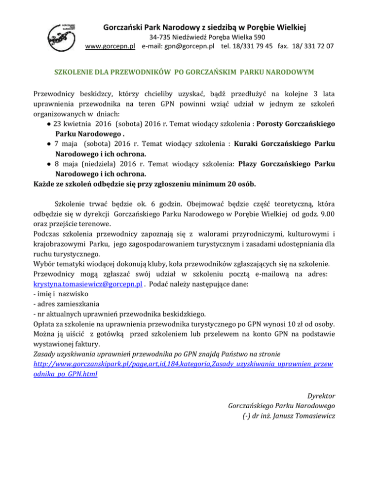 Gorczański Park Narodowy z siedzibą w Porębie Wielkiej 34-735 Niedźwiedź Poręba Wielka 590 www.gorcepn.pl e-mail: [email protected] tel. 18/331 79 45 fax. 18/ 331 72 07 SZKOLENIE DLA PRZEWODNIKÓW PO GORCZAŃSKIM PARKU NARODOWYM Przewodnicy beskidzcy, którzy chcieliby uzyskać, bądź przedłużyć na kolejne 3 lata uprawnienia przewodnika na teren GPN powinni wziąć udział w jednym ze szkoleń organizowanych w dniach: ● 23 kwietnia 2016 (sobota) 2016 r. Temat wiodący szkolenia : Porosty Gorczańskiego Parku Narodowego . ● 7 maja (sobota) 2016 r. Temat wiodący szkolenia : Kuraki Gorczańskiego Parku Narodowego i ich ochrona. ● 8 maja (niedziela) 2016 r. Temat wiodący szkolenia: Płazy Gorczańskiego Parku Narodowego i ich ochrona. Każde ze szkoleń odbędzie się przy zgłoszeniu minimum 20 osób. Szkolenie trwać będzie ok. 6 godzin. Obejmować będzie część teoretyczną, która odbędzie się w dyrekcji Gorczańskiego Parku Narodowego w Porębie Wielkiej od godz. 9.00 oraz przejście terenowe. Podczas szkolenia przewodnicy zapoznają się z walorami przyrodniczymi, kulturowymi i krajobrazowymi Parku, jego zagospodarowaniem turystycznym i zasadami udostępniania dla ruchu turystycznego. Wybór tematyki wiodącej dokonują kluby, koła przewodników zgłaszających się na szkolenie. Przewodnicy mogą zgłaszać swój udział w szkoleniu pocztą e-mailową na adres: [email protected] . Podać należy następujące dane: - imię i nazwisko - adres zamieszkania - nr aktualnych uprawnień przewodnika beskidzkiego. Opłata za szkolenie na uprawnienia przewodnika turystycznego po GPN wynosi 10 zł od osoby. Można ją uiścić z gotówką przed szkoleniem lub przelewem na konto GPN na podstawie wystawionej faktury. Zasady uzyskiwania uprawnień przewodnika po GPN znajdą Państwo na stronie http://www.gorczanskipark.pl/page,art,id,184,kategoria,Zasady_uzyskiwania_uprawnien_przew odnika_po_GPN.html Dyrektor Gorczańskiego Parku Narodowego (-) dr inż. Janusz Tomasiewicz