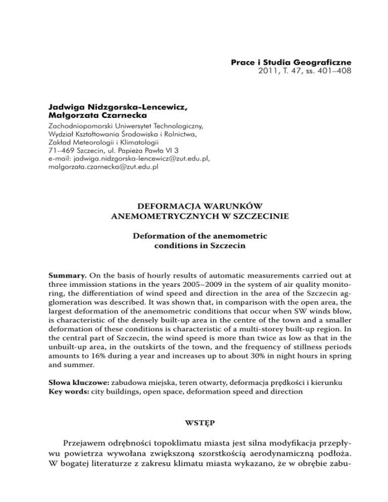 Prace i Studia Geograficzne 2011, T. 47, ss. 401–408 Jadwiga Nidzgorska-Lencewicz, Małgorzata Czarnecka Zachodniopomorski Uniwersytet Technologiczny, Wydział Kształtowania Środowiska i Rolnictwa, Zakład Meteorologii i Klimatologii 71–469 Szczecin, ul. Papieża Pawła VI 3 e-mail: [email protected], [email protected] DEFORMACJA WARUNKÓW ANEMOMETRYCZNYCH W SZCZECINIE Deformation of the anemometric conditions in Szczecin Summary. On the basis of hourly results of automatic measurements carried out at three immission stations in the years 2005–2009 in the system of air quality monitoring, the differentiation of wind speed and direction in the area of the Szczecin agglomeration was described. It was shown that, in comparison with the open area, the largest deformation of the anemometric conditions that occur when SW winds blow, is characteristic of the densely built-up area in the centre of the town and a smaller deformation of these conditions is characteristic of a multi-storey built-up region. In the central part of Szczecin, the wind speed is more than twice as low as that in the unbuilt-up area, in the outskirts of the town, and the frequency of stillness periods amounts to 16% during a year and increases up to about 30% in night hours in spring and summer. Słowa kluczowe: zabudowa miejska, teren otwarty, deformacja prędkości i kierunku Key words: city buildings, open space, deformation speed and direction WSTĘP Przejawem odrębności topoklimatu miasta jest silna modyfikacja przepływu powietrza wywołana zwiększoną szorstkością aerodynamiczną podłoża. W bogatej literaturze z zakresu klimatu miasta wykazano, że w obrębie zabu- 402 Jadwiga Nidzgorska-Lencewicz, Małgorzata Czarnecka dowy miejskiej prędkość wiatru jest na ogół o 20–30%, a w centrum nawet o 30–50% mniejsza niż na peryferiach, częściej notowane są wiatry bardzo słabe i cisze, a rzadziej wiatry silne (Fortuniak 2003, za Lee, Lewińska 2000). W skali mikroklimatu ruch powietrza jest bardzo skomplikowany, gdyż kształtuje się pod wpływem wielu czynników, takich jak np. układ komunikacyjny, charakter zabudowy, wysokość, rozstaw i orientacja budynków, odległość między nimi, i dlatego jest bardzo trudny do oszacowania (Kuchcik 2003, Xie i in. 2005). W wielu pracach udowodniono wpływ warunków anemometrycznych na występowanie, intensywność i pionowy zasięg miejskiej wyspy ciepła (Fortuniak 2003, Kassomenos, Katsoulis 2006, Stopa-Boryczka 1992, Szymanowski 2004, Unger 1996). Według Szymanowskiego (2004) w aglomeracji Wrocławia wzrost prędkości wiatru powyżej 4 m·s–1 w nocy i powyżej 1 m·s–1 w dzień, bez względu na stopień zachmurzenia, powoduje zanik lub znaczną redukcję wyspy ciepła. Z kolei wyniki badań Stopy-Boryczki (1992) wykazały, że w Warszawie zanik różnicy temperatury między miastem i otoczeniem następuje dopiero przy prędkości wiatru ponad 7 m·s–1, a wzrostowi prędkości wiatru poza miastem o 1 m·s–1 odpowiada spadek różnicy średniej temperatury o 0,11–0,15oC. Bodźce anemometryczne istotnie kształtują odczuwalność cieplną człowieka. Osłabienie prędkości wiatru w obszarze miejskim bywa szczególnie dokuczliwe w upalne letnie dni, utrudnia bowiem chłodzenie organizmu (Matzarakis i in. 2009, Czarnecka i in. 2011). Wiatr jest również elementem decydującym o warunkach aerosanitarnych powietrza, zwłaszcza w miastach o dużym zanieczyszczeniu. W zależności od kierunku może on być zarówno efektywnym czynnikiem oczyszczania powietrza miejskiego, jak i zasadniczym czynnikiem napływu zanieczyszczeń z lokalnych źródeł komunalnych, przemysłowych czy też z transportu drogowego (Czarnecka, Nidzgorska-Lencewicz 2008). Szczegółowe rozpoznanie i charakterystyka warunków anemometrycznych w skali lokalnej, zwłaszcza w obrębie zabudowy miejskiej, może być postawą rozwiązań praktycznych, np. konkretnych rozwiązań planistycznych zmierzających do poprawy warunków bioklimatycznych i aerosanitarnych. Tymczasem źródłem dotychczasowej wiedzy o warunkach anemometrycznych w rejonie Szczecina były pomiary w jedynej stacji meteorologicznej IMGW w Szczecinie-Dąbiu. Możliwości oszacowania zróżnicowania klimatu miasta pojawiły się wraz z uruchomieniem systemu automatycznych pomiarów meteorologicznych, w ramach monitoringu jakości powietrza, prowadzonych przez WIOŚ w Szczecinie. Celem niniejszej pracy jest próba określenia czasowej i przestrzennej zmienności prędkości i kierunku wiatru w obrębie aglomeracji szczecińskiej. Deformacja warunków anemometrycznych w Szczecinie 403 MATERIAŁY I METODY Materiały podstawowe obejmowały wyniki chwilowych pomiarów prędkości i kierunku wiatru na wysokości 10 m n.p.m., z pełnych godzin według UTC, z trzech punktów w aglomeracji Szczecina, z lat 2005–2009. Automatyczne stacje meteorologiczne, z których uzyskano dane, funkcjonują w systemie monitoringu jakości powietrza w ramach WIOŚ. Stacja przy ul. Piłsudskiego jest zlokalizowana w obrębie zwartej zabudowy, w centralnej części miasta, natomiast dwie pozostałe stacje, przy ulicy Łącznej i ulicy Andrzejewskiego, znajdują się na obrzeżach miasta. Stacja przy ul. Łącznej reprezentuje teren otwarty, w sąsiedztwie niskiej, luźnej zabudowy jednorodzinnej, a punkt pomiarowy przy ul. Andrzejewskiego znajduje się w obrębie wielokondygnacyjnej zabudowy blokowej, w pobliżu głównej drogi dojazdowej do Szczecina. WYNIKI W badanym 5-leciu przeciętnie największe prędkości wiatru występowały w niezabudowanym rejonie Szczecina, przy ul. Łącznej i wahały się od około 2,5 m.s–1 w sierpniu do 3,5 m.s–1 w styczniu (ryc. 1). W zabudowanych dzielnicach miasta prędkości wiatru były o połowę mniejsze. Szczególnie niekorzystne warunki przewietrzania panowały w śródmiejskiej, najbardziej zanieczyszczonej części Szczecina, gdzie w żadnym miesiącu roku średnia prędkość wiatru nie