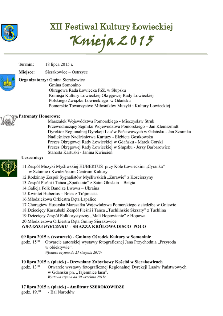 XII Festiwal Kultury Łowieckiej Knieja 2 0 1 5 Termin: 18 lipca 2015 r. Miejsce: Sierakowice – Ostrzyce Organizatorzy: Gmina Sierakowice Gmina Somonino Okręgowa Rada Łowiecka PZŁ w Słupsku Komisja Kultury Łowieckiej Okręgowej Rady Łowieckiej Polskiego Związku Łowieckiego w Gdańsku Pomorskie Towarzystwo Miłośników Muzyki i Kultury Łowieckiej Patronaty Honorowe: Marszałek Województwa Pomorskiego - Mieczysław Struk Przewodniczący Sejmiku Województwa Pomorskiego – Jan Kleinszmidt Dyrektor Regionalnej Dyrekcji Lasów Państwowych w Gdańsku - Jan Szramka Nadleśniczy Nadleśnictwa Kartuzy - Elżbieta Gostkowska Prezes Okręgowej Rady Łowieckiej w Gdańsku - Marek Gorski Prezes Okręgowej Rady Łowieckiej w Słupsku - Jerzy Barbarowicz Starosta Kartuski - Janina Kwiecień Uczestnicy: 11.Zespół Muzyki Myśliwskiej HUBERTUS przy Kole Łowieckim „Cyranka” w Sztumie i Kwidzińskim Centrum Kultury 12.Rodzinny Zespół Sygnalistów Myśliwskich „Żurawie” z Kościerzyny 13.Zespół Pieśni i Tańca „Spotkanie” z Saint Ghislain – Belgia 14.Galicja Folk Band ze Lwowa – Ukraina 15.Kwintet Hubertus – Brass z Trójmiasta 16.Młodzieżowa Orkiestra Dęta Łapalice 17.Chorągiew Husarska Marszałka Województwa Pomorskiego z siedzibą w Gniewie 18.Dziecięcy Kaszubski Zespół Pieśni i Tańca „Tuchlińskie Skrzaty” z Tuchlina 19.Dziecięcy Zespół Folklorystyczny „Mali Hopowianie” z Hopowa 20.Młodzieżowa Orkiestra Dęta Gminy Sierakowice GWIAZDA WIECZORU - SHAZZA KRÓLOWA DISCO POLO 09 lipca 2015 r. (czwartek) - Gminny Ośrodek Kultury w Somoninie godz. 1500 Otwarcie autorskiej wystawy fotograficznej Jana Przychodnia „Przyroda w obiektywie”. Wystawa czynna do 21 sierpnia 2015r. 10 lipca 2015 r. (piątek) - Drewniany Zabytkowy Kościół w Sierakowicach godz. 1300 Otwarcie wystawy fotograficznej Regionalnej Dyrekcji Lasów Państwowych w Gdańsku pn. „Tajemnice lasu”. Wystawa czynna do 30 września 2015r. 17 lipca 2015 r. (piątek) - Amfiteatr SZEROKOWIDZE godz. 19.00 - Bal Narodów 18 lipca 2015 r. (sobota) - Drewniany Zabytkowy Kościół w Sierakowicach godz.1000 XI Kaszubski Przegląd Sygnałów i Muzyki Myśliwskiej, Przegląd o „Fanfarę Żurawia”, I Kaszubski Konkurs Oceny Poroży Jeleni „Paśnik kawowy” Ogłoszenie wyników, wręczenie nagród Ołtarz Papieski godz. 1530 godz. 1600 Zbiórka myśliwych i pocztów sztandarowych, zespołów folklorystycznych Wręczenie nagród głównych Koncert laureatów XI Kaszubskiego Przeglądu Sygnałów i Muzyki Myśliwskiej Msza Święta Hubertowska pod przewodnictwem Kapelana Myśliwych, Leśników i Rycerzy Diecezji Pelplińskiej – ks. Andrzeja Kossa Oprawa muzyczna: Zespół HUBERTUS Parada ulicami Sierakowic: Kartuską, Słupską do Amfiteatru SZEROKOWIDZE - Młodzieżowa Orkiestra Dęta Gminy Sierakowice - poczty sztandarowe - gospodarze, goście - myśliwi - zespoły folklorystyczne, myśliwskie - jeźdźcy Amfiteatr SZEROKOWIDZE Konferansjer: Piotr Kukier 17.00 - 17.15 Hejnał myśliwski - Rodzinny Zespół Sygnalistów Myśliwskich „Żurawie” z Kościerzyny Uroczyste otwarcie Festiwalu przez Wójta Gminy Sierakowice Tadeusza Kobielę i Wójta Gminy Somonino Mariana Kryszewskiego Konferansjer, CD Sponsorzy Wyprowadzenie sztandarów Kół Łowieckich 17.15 - 17.45 Zespół Muzyki Myśliwskiej HUBERTUS 30’ Konferansjer, CD Sponsorzy 17.50 - 18.10 Dziecięcy Kaszubski Zespół Pieśni i Tańca „Tuchlińskie Skrzaty” 20’ 18.15 - 18.45 Pokazy rasy psów myśliwskich (Piotr Kukier) 30' Konferansjer, CD Sponsorzy 18.50 - 19.10 Galicja Folk Band 20’ 19.10 - 19.40 Pokazy rasy psów myśliwskich 30’ 19.40 - 20.00 Galicja Folk Band 20’ 20.00 - 21.00 Chorągiew Husarska 60’ Konferansjer, CD Sponsorzy 21.00 - 21.40 Zespół Pieśni i Tańca „Spotkanie” 40' Konferansjer, CD Sponsorzy 21.45 - 23.00 Shazza – Królowa Disco Polo Imprezy towarzyszące: - Kiermasze Zacnego Jadła, Napitku i Rękodzieła - Stoiska z akcesoriami myśliwskimi - Kuchnia kaszubska i myśliwska - Kącik przyrodniczy dla dzieci - Porady hodowców OSTRZYCE – Scena Koncertowa w Ostrzycach Występy zespołów folklorystycznych, myśliwskich i orkiestry dętej, program artystyczny dla dzieci, pokazy pracy sokołów i sów, wieczorna zabawa z DJ 14.00 – 15.00 Galicja Folk Band 60' 18.30 – 19.10 Zespół Pieśni i Tańca „Spotkanie” 40' Imprezy towarzyszące: - Kiermasze Zacnego Jadła, Napitku i Rękodzieła - Kiermasze myśliwskie - Kuchnia kaszubska i myśliwska 01 sierpnia 2015 roku (sobota) Biesiada Myśliwska w Mirachowie – Kabaret OTTO /impreza biletowana/