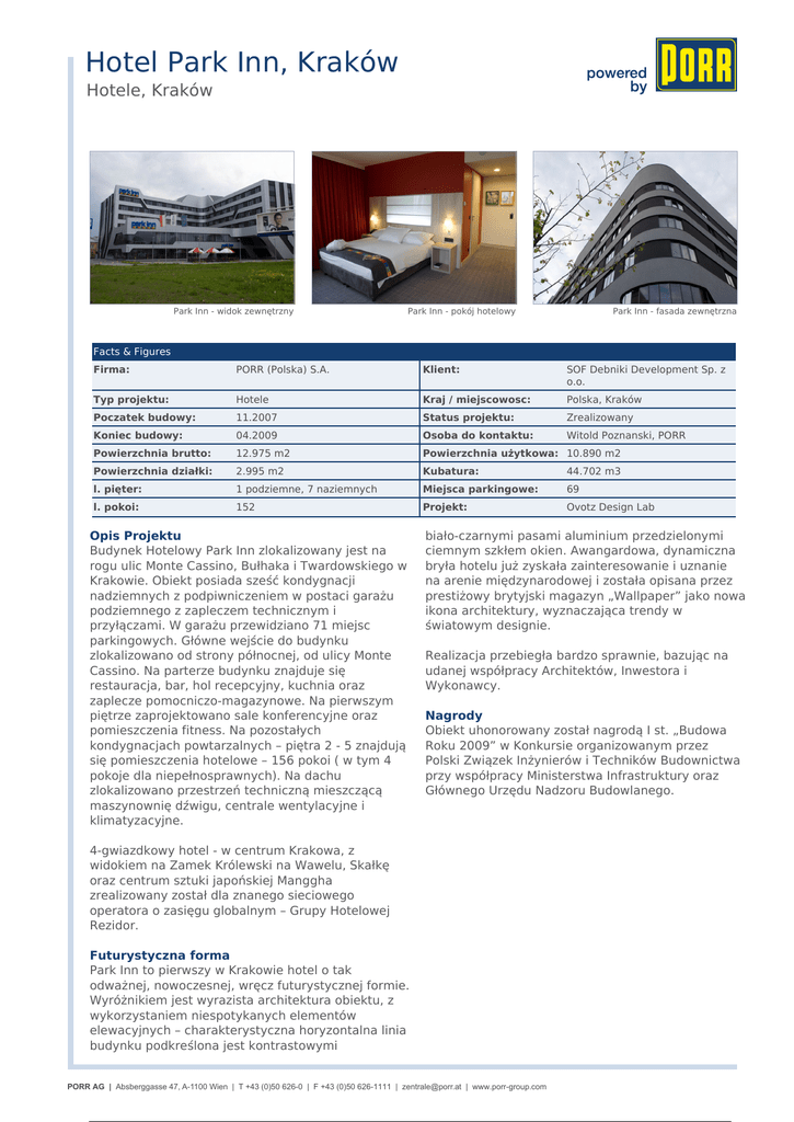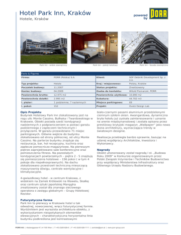 Hotel Park Inn, Kraków Hotele, Kraków Park Inn - widok zewnętrzny Park Inn - pokój hotelowy Park Inn - fasada zewnętrzna Facts & Figures Firma: PORR (Polska) S.A. Klient: SOF Debniki Development Sp. z o.o. Typ projektu: Hotele Kraj / miejscowosc: Polska, Kraków Poczatek budowy: 11.2007 Status projektu: Zrealizowany Koniec budowy: 04.2009 Osoba do kontaktu: Witold Poznanski, PORR Powierzchnia brutto: 12.975 m2 Powierzchnia użytkowa: 10.890 m2 Powierzchnia działki: 2.995 m2 Kubatura: 44.702 m3 l. pięter: 1 podziemne, 7 naziemnych Miejsca parkingowe: 69 l. pokoi: 152 Projekt: Ovotz Design Lab Opis Projektu Budynek Hotelowy Park Inn zlokalizowany jest na rogu ulic Monte Cassino, Bułhaka i Twardowskiego w Krakowie. Obiekt posiada sześć kondygnacji nadziemnych z podpiwniczeniem w postaci garażu podziemnego z zapleczem technicznym i przyłączami. W garażu przewidziano 71 miejsc parkingowych. Główne wejście do budynku zlokalizowano od strony północnej, od ulicy Monte Cassino. Na parterze budynku znajduje się restauracja, bar, hol recepcyjny, kuchnia oraz zaplecze pomocniczo-magazynowe. Na pierwszym piętrze zaprojektowano sale konferencyjne oraz pomieszczenia fitness. Na pozostałych kondygnacjach powtarzalnych – piętra 2 - 5 znajdują się pomieszczenia hotelowe – 156 pokoi ( w tym 4 pokoje dla niepełnosprawnych). Na dachu zlokalizowano przestrzeń techniczną mieszczącą maszynownię dźwigu, centrale wentylacyjne i klimatyzacyjne. biało-czarnymi pasami aluminium przedzielonymi ciemnym szkłem okien. Awangardowa, dynamiczna bryła hotelu już zyskała zainteresowanie i uznanie na arenie międzynarodowej i została opisana przez prestiżowy brytyjski magazyn „Wallpaper” jako nowa ikona architektury, wyznaczająca trendy w światowym designie. Realizacja przebiegła bardzo sprawnie, bazując na udanej współpracy Architektów, Inwestora i Wykonawcy. Nagrody Obiekt uhonorowany został nagrodą I st. „Budowa Roku 2009” w Konkursie organizowanym przez Polski Związek Inżynierów i Techników Budownictwa przy współpracy Ministerstwa Infrastruktury oraz Głównego Urzędu Nadzoru Budowlanego. 4-gwiazdkowy hotel - w centrum Krakowa, z widokiem na Zamek Królewski na Wawelu, Skałkę oraz centrum sztuki japońskiej Manggha zrealizowany został dla znanego sieciowego operatora o zasięgu globalnym – Grupy Hotelowej Rezidor. Futurystyczna forma Park Inn to pierwszy w Krakowie hotel o tak odważnej, nowoczesnej, wręcz futurystycznej formie. Wyróżnikiem jest wyrazista architektura obiektu, z wykorzystaniem niespotykanych elementów elewacyjnych – charakterystyczna horyzontalna linia budynku podkreślona jest kontrastowymi PORR AG | Absberggasse 47, A-1100 Wien | T | F | [email protected] | ZZZSRUUJURXSFRP Powered by TCPDF (www.tcpdf.org)