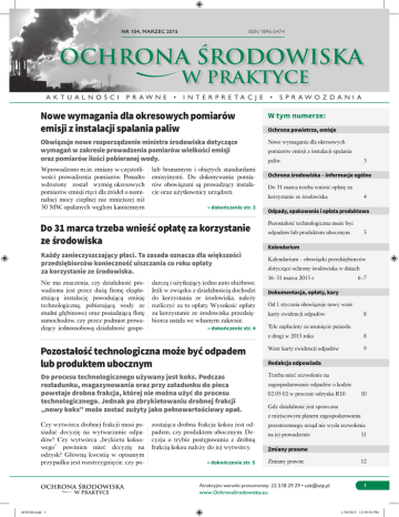 NR 104, marzec 2015 ISSN 1896-5474 OCHRONA ŚRODOWISKA W PRAKTYCE A K T U A L N O Ś C I P R AW N E • I N T E R P R E TA C J E • S P R AW O Z D A N I A Nowe wymagania dla okresowych pomiarów emisji z instalacji spalania paliw W tym numerze: Obwiązuje nowe rozporządzenie ministra środowiska dotyczące wymagań w zakresie prowadzenia pomiarów wielkości emisji oraz pomiarów ilości pobieranej wody. Nowe wymagania dla okresowych Wprowadzono m.in. zmiany w częstotliwości prowadzenia pomiarów. Ponadto wdrożony został wymóg okresowych pomiarów emisji rtęci dla źródeł o nominalnej mocy cieplnej nie mniejszej niż 50 MW, opalanych węglem kamiennym lub brunatnym i objętych standardami emisyjnymi. Do dokonywania pomiarów obowiązani są prowadzący instalacje oraz użytkownicy urządzeń. » dokończenie str. 3 Do 31 marca trzeba wnieść opłatę za korzystanie ze środowiska Każdy zanieczyszczający płaci. Ta zasada oznacza dla większości przedsiębiorców konieczność uiszczania co roku opłaty za korzystanie ze środowiska. Nie ma znaczenia, czy działalność prowadzona jest przez dużą firmę eksploatującą instalację powodującą emisję technologiczną, pobierającą wody ze studni głębinowej oraz posiadającą flotę samochodów, czy przez podmiot prowadzący jednoosobową działalność gospo- darczą i użytkujący jedno auto służbowe. Jeśli w związku z działalnością dochodzi do korzystania ze środowiska, należy rozliczyć za to opłaty. Wysokość opłaty za korzystanie ze środowiska przedsiębiorca ustala we własnym zakresie. » dokończenie str. 4 Ochrona powietrza, emisje pomiarów emisji z instalacji spalania paliw 3 Ochrona środowiska – informacje ogólne Do 31 marca trzeba wnieść opłatę za korzystanie ze środowiska 4 Odpady, opakowania i opłata produktowa Pozostałość technologiczna może być odpadem lub produktem ubocznym 5 Kalendarium Kalendarium – obowiązki przedsiębiorców dotyczące ochrony środowiska w dniach 16–31 marca 2015 r. 6–7 Dokumentacja, opłaty, kary Od 1 stycznia obowiązuje nowy wzór karty ewidencji odpadów 8 Tyle zapłacimy za usunięcie pojazdu z drogi w 2015 roku 8 Pozostałość technologiczna może być odpadem lub produktem ubocznym Wzór karty ewidencji odpadów 9 Do procesu technologicznego używany jest koks. Podczas rozładunku, magazynowania oraz przy załadunku do pieca powstaje drobna frakcja, której nie można użyć do procesu technologicznego. Jednak po zbrykietowaniu drobnej frakcji „nowy koks” może zostać zużyty jako pełnowartościowy opał. Trzeba mieć zezwolenie na Czy wytwórca drobnej frakcji musi posiadać decyzję na wytwarzanie odpadów? Czy wytwórca „brykietu koksowego” powinien mieć decyzję na odzysk? Główną kwestią w opisanym przypadku jest rozstrzygnięcie, czy po- przestrzennego, urząd nie wyda zezwolenia zostająca drobna frakcja koksu jest odpadem, czy produktem ubocznym. Decyzja o trybie postępowania z drobną frakcją koksu należy do jej wytwórcy. » dokończenie str. 5 Redakcja odpowiada zagospodarowanie odpadów o kodzie 02 05 02 w procesie odzysku R10 Gdy działalność jest sprzeczna z miejscowym planem zagospodarowania na jej prowadzenie 11 Zmiany prawne Zmiany prawne Atrakcyjne warunki prenumeraty: 22 518 29 29 • [email protected] www.OchronaSrodowiska.eu AOS104.indd 1 10 12 1 1/30/2015 12:58:54 PM O D R E D A K C J I Drogi Czytelniku! Nadszedł miesiąc sprawozdawczości i rozliczeń. Marzec to jeden z najbardziej pracochłonnych i intensywnych okresów dla każdego specjalisty ds. ochrony środowiska – czas składania sprawozdań odpadowych oraz rozliczania się z korzystania ze środowiska. Każdy podmiot korzystający ze środowiska jest obowiązany do 31 marca wnieść z tego tytułu opłatę. Kto konkretnie musi zapłacić? Ile i za jakie korzystanie? Wyjaśnienie w artykule na str. 4. Kolejny ważny temat, który poruszamy w tym numerze, to nowy wzór karty ewidencji odpadu. KEO to jeden z najważniejszych i niezbędnych dokumentów przy właściwym gospodarowaniu odpadami w firmie. Co się zatem zmieniło w 2015 roku? Odpowiedź na str. 8–9. Ponadto polecam nasze „Kalendarium”. Na str. 6–7 omawiamy obowiązki dotyczące drugiej połowy marca 2015 roku. KARTA ODPADU: 17 04 02 NAZWA Aluminium RODZAJ ODPADU Odpad inny niż niebezpieczny SKŁAD CHEMICZNY Aluminium zawiera zazwyczaj ok. 99% glinu lub stanowi jego stop np. z żelazem, miedzią, cynkiem, tytanem, krzemem OPIS Odpad z budowy, remontów, demontażu obiektów budowlanych Najczęściej spotykana postać to np. aluminiowe konstrukcje i profile, taśmy aluminiowe, elementy grzejne, elementy regałów itp. UWAGA! Odpad w postaci aluminium klasyfikuje się do odpadów innych niż niebezpieczne. MINIMALIZACJA ILOŚCI WYTWARZANIA Nie ma możliwości minimalizacji ilości wytwarzania tego rodzaju odpadów. Jest ona uzależniona od wielkości oraz częstotliwości przeprowadzanych prac. W przypadku gdy prace remontowe, budowlane czy rozbiórkowe prowadzone są przez zewnętrzną firmę budowlaną, to jeżeli umowa nie świadczy inaczej, wytwórcą odpadów, a jednocześnie zobowiązanym do ich prawidłowego dalszego zagospodarowania jest podmiot świadczący usługę. MAGAZYNOWANIE Nie ma specjalnych wymagań co do magazynowania tego rodzaju odpadów. Najczęściej, w zależności od ilości, wielkości oraz wysokiej wartości tego rodzaju odpadów, magazynuje się je na utwardzonej, ogrodzonej powierzchni w kontenerze lub na paletach albo w zamykanym magazynie zabezpieczonym przed dostępem osób trzecich. Zapraszam do lektury Przez firmę posiadającą stosowne zezwolenie na gospodarowanie tego rodzaju odpadami. Często przekazywane są do punktu skupu surowców wtórnych. redaktor miesięcznika „Ochrona środowiska w praktyce” Uwaga! Wówczas należy pamiętać o uzyskaniu karty przekazania odpadu. Formularz przyjęcia metali nie może być traktowany jako 