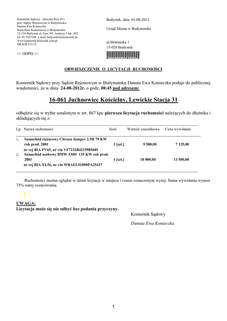 Komornik Sądowy (dawniej Rew.IV) przy Sądzie Rejonowym w Białymstoku Danuta Ewa Konieczka Kancelaria Komornicza w Białymstoku 15-124 Białystok ul. Gen. Wł. Andersa 5 lok. 502 tel. 85 7425100 e-mail: [email protected] www.komornik-bialystok.com.pl DK KM 615/12 Białystok, dnia 01-08-2012 << ODPIS >> *0020000740007* Urząd Miasta w Białymstoku ul.Słonimska 1 15-028 Białystok OBWIESZCZENIE O LICYTACJI RUCHOMOŚCI Komornik Sądowy przy Sądzie Rejonowym w Białymstoku Danuta Ewa Konieczka podaje do publicznej wiadomości, że w dniu 24-08-2012r. o godz. 08:45 pod adresem: 16-061 Juchnowiec Kościelny, Lewickie Stacja 31 odbędzie się w trybie ustalonym w art. 867 kpc pierwsza licytacja ruchomości należących do dłużnika i składających się z: _______________________________________________________________________________________________________________________ Lp. Nazwa ruchomości Ilość Wartość szacunkowa Cena wywołania _________________________________________________________________________________________________________________________ 1. 2. Samochód ciężarowy Citroen Jumper 2.5D 79 KW rok prod. 2001 nr rej BIA FV65, nr vin VF7232B4215985685 Samochód osobowy BMW 330D 135 KW rok prod. 2001 nr rej BIA XL56, nr vin WBAEL91090PA25437 1 [szt.] 9 500,00 7 125,00 1 [szt.] 18 000,00 13 500,00 _______________________________________________________________________________________________________________________ Ruchomości można oglądać w dzień licytacji w miejscu i czasie oznaczonym wyżej. Suma wywołania wynosi 75% sumy oszacowania. UWAGA: Licytacja może się nie odbyć bez podania przyczyny. Komornik Sądowy Danuta Ewa Konieczka 1