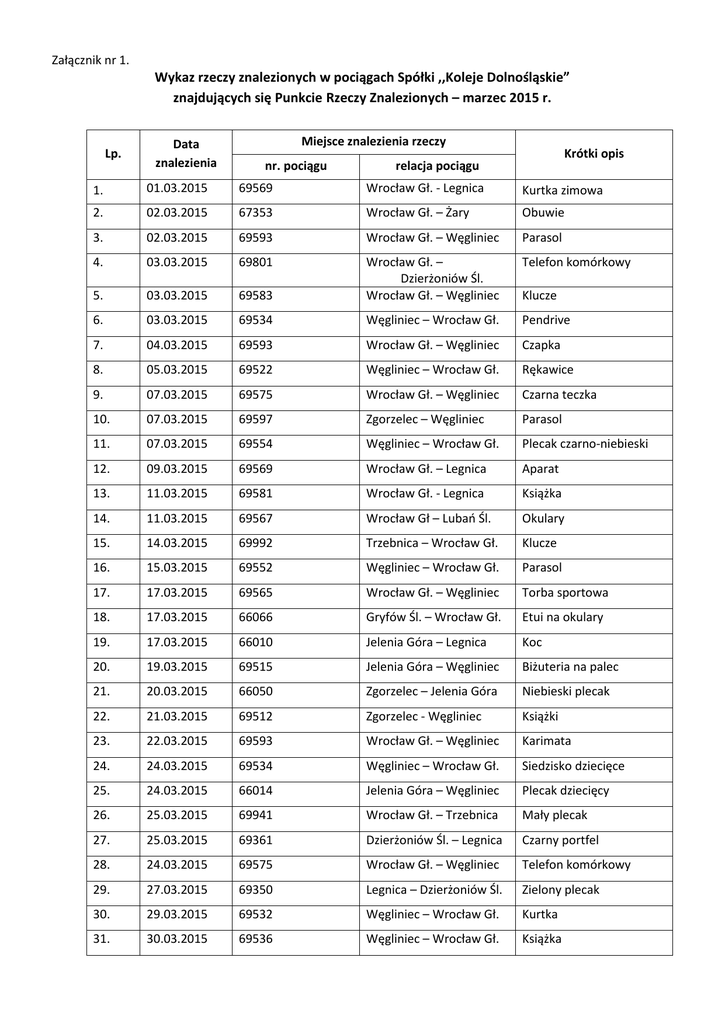 Załącznik nr 1. Wykaz rzeczy znalezionych w pociągach Spółki ,,Koleje Dolnośląskie” znajdujących się Punkcie Rzeczy Znalezionych – marzec 2015 r. Lp. Data znalezienia Miejsce znalezienia rzeczy nr. pociągu Krótki opis relacja pociągu 1. 01.03.2015 69569 Wrocław Gł. - Legnica Kurtka zimowa 2. 02.03.2015 67353 Wrocław Gł. – Żary Obuwie 3. 02.03.2015 69593 Wrocław Gł. – Węgliniec Parasol 4. 03.03.2015 69801 Telefon komórkowy 5. 03.03.2015 69583 Wrocław Gł. – Dzierżoniów Śl. Wrocław Gł. – Węgliniec 6. 03.03.2015 69534 Węgliniec – Wrocław Gł. Pendrive 7. 04.03.2015 69593 Wrocław Gł. – Węgliniec Czapka 8. 05.03.2015 69522 Węgliniec – Wrocław Gł. Rękawice 9. 07.03.2015 69575 Wrocław Gł. – Węgliniec Czarna teczka 10. 07.03.2015 69597 Zgorzelec – Węgliniec Parasol 11. 07.03.2015 69554 Węgliniec – Wrocław Gł. Plecak czarno-niebieski 12. 09.03.2015 69569 Wrocław Gł. – Legnica Aparat 13. 11.03.2015 69581 Wrocław Gł. - Legnica Książka 14. 11.03.2015 69567 Wrocław Gł – Lubań Śl. Okulary 15. 14.03.2015 69992 Trzebnica – Wrocław Gł. Klucze 16. 15.03.2015 69552 Węgliniec – Wrocław Gł. Parasol 17. 17.03.2015 69565 Wrocław Gł. – Węgliniec Torba sportowa 18. 17.03.2015 66066 Gryfów Śl. – Wrocław Gł. Etui na okulary 19. 17.03.2015 66010 Jelenia Góra – Legnica Koc 20. 19.03.2015 69515 Jelenia Góra – Węgliniec Biżuteria na palec 21. 20.03.2015 66050 Zgorzelec – Jelenia Góra Niebieski plecak 22. 21.03.2015 69512 Zgorzelec - Węgliniec Książki 23. 22.03.2015 69593 Wrocław Gł. – Węgliniec Karimata 24. 24.03.2015 69534 Węgliniec – Wrocław Gł. Siedzisko dziecięce 25. 24.03.2015 66014 Jelenia Góra – Węgliniec Plecak dziecięcy 26. 25.03.2015 69941 Wrocław Gł. – Trzebnica Mały plecak 27. 25.03.2015 69361 Dzierżoniów Śl. – Legnica Czarny portfel 28. 24.03.2015 69575 Wrocław Gł. – Węgliniec Telefon komórkowy 29. 27.03.2015 69350 Legnica – Dzierżoniów Śl. Zielony plecak 30. 29.03.2015 69532 Węgliniec – Wrocław Gł. Kurtka 31. 30.03.2015 69536 Węgliniec – Wrocław Gł. Książka Klucze 32. 30.03.2015 69536 Węgliniec – Wrocław Gł. Czapka 33. 31.03.2015 69879 Telefon komórkowy 34. 31.03.2015 69585 Wrocław Gł. – Szklarska Poręba Grn. Wrocław Gł. – Węgliniec 35. 31.03.2015 69803 Wrocław Gł. – Dzierżoniów Śl. Torba z logo Politechniki Wrocławskiej z zawartością Telefon komórkowy