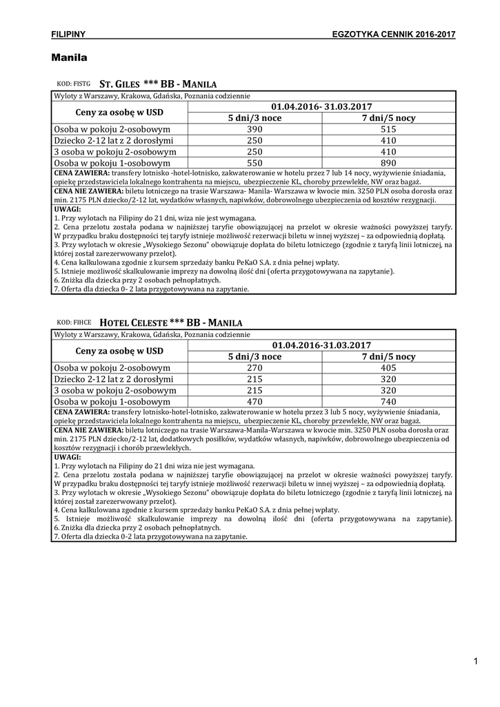 FILIPINY EGZOTYKA CENNIK 2016-2017 Manila KOD: FISTG ST. GILES *** BB - MANILA Wyloty z Warszawy, Krakowa, Gdańska, Poznania codziennie Ceny za osobę w USD Osoba w pokoju 2-osobowym Dziecko 2-12 lat z 2 dorosłymi 3 osoba w pokoju 2-osobowym Osoba w pokoju 1-osobowym 01.04.2016- 31.03.2017 5 dni/3 noce 7 dni/5 nocy 390 515 250 410 250 410 550 890 CENA ZAWIERA: transfery lotnisko -hotel-lotnisko, zakwaterowanie w hotelu przez 7 lub 14 nocy, wyżywienie śniadania, opiekę przedstawiciela lokalnego kontrahenta na miejscu, ubezpieczenie KL, choroby przewlekłe, NW oraz bagaż. CENA NIE ZAWIERA: biletu lotniczego na trasie Warszawa- Manila- Warszawa w kwocie min. 3250 PLN osoba dorosła oraz min. 2175 PLN dziecko/2-12 lat, wydatków własnych, napiwków, dobrowolnego ubezpieczenia od kosztów rezygnacji. UWAGI: 1. Przy wylotach na Filipiny do 21 dni, wiza nie jest wymagana. 2. Cena przelotu została podana w najniższej taryfie obowiązującej na przelot w okresie ważności powyższej taryfy. W przypadku braku dostępności tej taryfy istnieje możliwość rezerwacji biletu w innej wyższej – za odpowiednią dopłatą. 3. Przy wylotach w okresie „Wysokiego Sezonu” obowiązuje dopłata do biletu lotniczego (zgodnie z taryfą linii lotniczej, na której został zarezerwowany przelot). 4. Cena kalkulowana zgodnie z kursem sprzedaży banku PeKaO S.A. z dnia pełnej wpłaty. 5. Istnieje możliwość skalkulowanie imprezy na dowolną ilość dni (oferta przygotowywana na zapytanie). 6. Zniżka dla dziecka przy 2 osobach pełnopłatnych. 7. Oferta dla dziecka 0- 2 lata przygotowywana na zapytanie. KOD: FIHCE HOTEL CELESTE *** BB - MANILA Wyloty z Warszawy, Krakowa, Gdańska, Poznania codziennie Ceny za osobę w USD Osoba w pokoju 2-osobowym Dziecko 2-12 lat z 2 dorosłymi 3 osoba w pokoju 2-osobowym Osoba w pokoju 1-osobowym 01.04.2016-31.03.2017 5 dni/3 noce 7 dni/5 nocy 270 405 215 320 215 320 470 740 CENA ZAWIERA: transfery lotnisko-hotel-lotnisko, zakwaterowanie w hotelu przez 3 lub 5 nocy, wyżywienie śniadania, opiekę przedstawiciela lokalnego kontrahenta na miejscu, ubezpieczenie KL, choroby przewlekłe, NW oraz bagaż. CENA NIE ZAWIERA: biletu lotniczego na trasie Warszawa-Manila-Warszawa w kwocie min. 3250 PLN osoba dorosła oraz min. 2175 PLN dziecko/2-12 lat, dodatkowych posiłków, wydatków własnych, napiwków, dobrowolnego ubezpieczenia od kosztów rezygnacji i chorób przewlekłych. UWAGI: 1. Przy wylotach na Filipiny do 21 dni wiza nie jest wymagana. 2. Cena przelotu została podana w najniższej taryfie obowiązującej na przelot w okresie ważności powyższej taryfy. W przypadku braku dostępności tej taryfy istnieje możliwość rezerwacji biletu w innej wyższej – za odpowiednią dopłatą. 3. Przy wylotach w okresie „Wysokiego Sezonu” obowiązuje dopłata do biletu lotniczego (zgodnie z taryfą linii lotniczej, na której został zarezerwowany przelot). 4. Cena kalkulowana zgodnie z kursem sprzedaży banku PeKaO S.A. z dnia pełnej wpłaty. 5. Istnieje możliwość skalkulowanie imprezy na dowolną ilość dni (oferta przygotowywana na zapytanie). 6. Zniżka dla dziecka przy 2 osobach pełnopłatnych. 7. Oferta dla dziecka 0-2 lata przygotowywana na zapytanie. 1 FILIPINY KOD: FIMNP EGZOTYKA CENNIK 2016-2017 PENINSULA ***** BB - MANILA Wyloty z Warszawy, Krakowa, Gdańska, Poznania codziennie Ceny za osobę w USD Osoba w pokoju 2-osobowym Dziecko 2-12 lat z 2 dorosłymi 3 osoba w pokoju 2-osobowym Osoba w pokoju 1-osobowym 01.04.2016-31.03.2017 5 dni/3 noce 7 dni/5 nocy 365 575 290 445 290 445 675 1 085 CENA ZAWIERA: transfery lotnisko-hotel-lotnisko, zakwaterowanie w hotelu przez 3 lub 5 nocy, wyżywienie śniadania, opiekę przedstawiciela lokalnego kontrahenta na miejscu, ubezpieczenie KL, choroby przewlekłe, NW oraz bagaż. CENA NIE ZAWIERA: biletu lotniczego na trasie Warszawa-Manila-Warszawa w kwocie min. 3250 PLN osoba dorosła oraz min. 2175 PLN dziecko/2-12 lat, dodatkowych posiłków, wydatków własnych, napiwków, dobrowolnego ubezpieczenia od kosztów rezygnacji i chorób przewlekłych. UWAGI: 1. Przy wylotach na Filipiny do 21 dni wiza nie jest wymagana. 2. Cena przelotu została podana w najniższej taryfie obowiązującej na przelot w okresie ważności powyższej taryfy. W przypadku braku dostępności tej taryfy istnieje możliwość rezerwacji biletu w innej wyższej – za odpowiednią dopłatą. 3. Przy wylotach w okresie „Wysokiego Sezonu” obowiązuje dopłata do biletu lotniczego (zgodnie z taryfą linii lotniczej, na której został zarezerwowany przelot). 4. Cena kalkulowana zgodnie z kursem sprzedaży banku PeKaO S.A. z dnia pełnej wpłaty. 5. Istnieje możliwość skalkulowanie imprezy na dowolną ilość dni (oferta przygotowywana na zapytanie). 6. Zniżka dla dziecka przy 2 osobach pełnopłatnych. 7. Oferta dla dziecka 0-2 lata przygotowywana na zapytanie. KOD: FIOGS ORCHID GARDEN SUITES *** BB - MANILA Wyloty z Warszawy, Krakowa, Gdańska, Poznania codziennie Ceny za osobę w USD Osoba w pokoju 2-osobowym Dziecko 2-12 lat z 2 dorosłymi 3 osoba w pokoju 2-osobowym Osoba w pokoju 1-osobowym 01.04.2016- 31.03.2017 5 dni/3 noce 5 dni/3 noce 390 390 250 250 250 250 550 550 CENA ZAWIERA: transfery lotnisko -hotel-lotnisko, zakwaterowanie w hotelu przez 7 lub 14 nocy, wyżywienie śniadania, opiekę przedstawiciela lokalnego kontrahenta na miejscu, ubezpieczenie KL, choroby przewlekłe, NW oraz bagaż. CENA NIE ZAWIERA: biletu lotniczego na trasie Warszawa- Manila- Warszawa w kwocie min. 3250 PLN osoba dorosła oraz min. 2175 PLN dziecko/2-12 lat, dodatkowych posiłków, wydatków własnych, napiwków, dobrowolnego ubezpieczenia od kosztów rezygnacji i chorób przewlekłych. UWAGI: 1. Przy wylotach na Filipiny do 21 dni, wiza nie jest wymagana. 2. Cena przelotu została podana w najniższej taryfie obowiązującej na przelot w okresie ważności powyższej taryfy. W przypadku braku dostępności tej taryfy istnieje możliwość