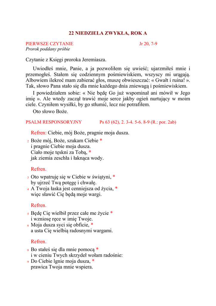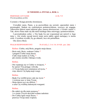 22 NIEDZIELA ZWYKŁA, ROK A PIERWSZE CZYTANIE Prorok poddany próbie Jr 20, 7-9 Czytanie z Księgi proroka Jeremiasza. Uwiodłeś mnie, Panie, a ja pozwoliłem się uwieść; ujarzmiłeś mnie i przemogłeś. Stałem się codziennym pośmiewiskiem, wszyscy mi urągają. Albowiem ilekroć mam zabierać głos, muszę obwieszczać: « Gwałt i ruina! ». Tak, słowo Pana stało się dla mnie każdego dnia zniewagą i pośmiewiskiem. I powiedziałem sobie: « Nie będę Go już wspominał ani mówił w Jego imię ». Ale wtedy zaczął trawić moje serce jakby ogień nurtujący w moim ciele. Czyniłem wysiłki, by go stłumić, lecz nie potrafiłem. Oto słowo Boże. PSALM RESPONSORYJNY 2 3 4 5 6 8 9 Ps 63 (62), 2. 3-4. 5-6. 8-9 (R.: por. 2ab) Refren: Ciebie, mój Boże, pragnie moja dusza. Boże mój, Boże, szukam Ciebie * i pragnie Ciebie moja dusza. Ciało moje tęskni za Tobą, * jak ziemia zeschła i łaknąca wody. Refren. Oto wpatruję się w Ciebie w świątyni, * by ujrzeć Twą potęgę i chwałę. A Twoja łaska jest cenniejsza od życia, * więc sławić Cię będą moje wargi. Refren. Będę Cię wielbił przez całe me życie * i wzniosę ręce w imię Twoje. Moja dusza syci się obficie, * a usta Cię wielbią radosnymi wargami. Refren. Bo stałeś się dla mnie pomocą * i w cieniu Twych skrzydeł wołam radośnie: Do Ciebie lgnie moja dusza, * prawica Twoja mnie wspiera. DRUGIE CZYTANIE Rozumna służba Boża Rz 12, 1-2 Czytanie z Listu świętego Pawła Apostoła do Rzymian. Proszę was, bracia, przez miłosierdzie Boże, abyście dali ciała swoje na ofiarę żywą, świętą, Bogu przyjemną, jako wyraz waszej rozumnej służby Bożej. Nie bierzcie więc wzoru z tego świata, lecz przemieniajcie się przez odnawianie umysłu, abyście umieli rozpoznać, jaka jest wola Boża: co jest dobre, co Bogu przyjemne i co doskonałe. Oto słowo Boże. ŚPIEW PRZED EWANGELIĄ por. Ef 1, 17-18 Aklamacja: Alleluja, alleluja, alleluja. Niech Ojciec naszego Pana Jezusa Chrystusa przeniknie nasze serca swoim światłem, abyśmy wiedzieli, czym jest nadzieja naszego powołania. Aklamacja: Alleluja, alleluja, alleluja. EWANGELIA Jeśli kto chce pójść za Mną, niech się zaprze samego siebie Mt 16, 21-27 Słowa Ewangelii według świętego Mateusza. Jezus zaczął wskazywać swoim uczniom na to, że musi iść do Jerozolimy i wiele wycierpieć od starszych i arcykapłanów, i uczonych w Piśmie; że będzie zabity i trzeciego dnia zmartwychwstanie. A Piotr wziął Go na bok i począł robić Mu wyrzuty: « Panie, niech Cię Bóg broni! Nie przyjdzie to nigdy na Ciebie ». Lecz On odwrócił się i rzekł do Piotra: « Zejdź Mi z oczu, szatanie! Jesteś Mi zawadą, bo nie myślisz o tym, co Boże, ale o tym, co ludzkie ». Wtedy Jezus rzekł do swoich uczniów: « Jeśli kto chce pójść za Mną, niech się zaprze samego siebie, niech weźmie krzyż swój i niech Mnie naśladuje. Bo kto chce zachować swoje życie, straci je; a kto straci swe życie z mego powodu, znajdzie je. Cóż bowiem za korzyść odniesie człowiek, choćby cały świat zyskał, a na swej duszy szkodę poniósł? Albo co da człowiek w zamian za swoją duszę? Albowiem Syn Człowieczy przyjdzie w chwale Ojca swego razem z aniołami swoimi, i wtedy odda każdemu według jego postępowania ». Oto słowo Pańskie.