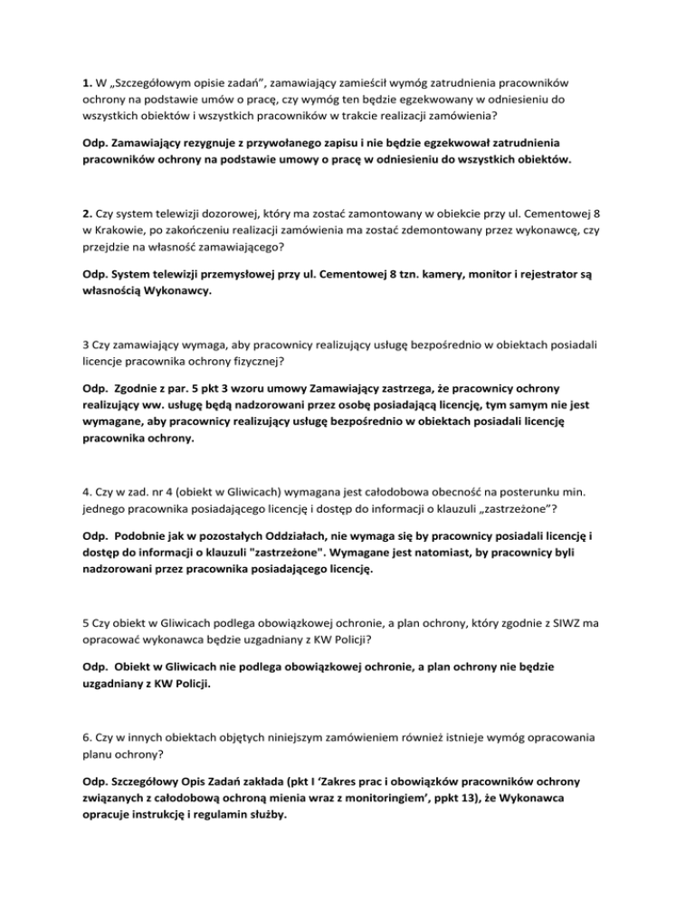 1. W „Szczegółowym opisie zadań”, zamawiający zamieścił wymóg zatrudnienia pracowników ochrony na podstawie umów o pracę, czy wymóg ten będzie egzekwowany w odniesieniu do wszystkich obiektów i wszystkich pracowników w trakcie realizacji zamówienia? Odp. Zamawiający rezygnuje z przywołanego zapisu i nie będzie egzekwował zatrudnienia pracowników ochrony na podstawie umowy o pracę w odniesieniu do wszystkich obiektów. 2. Czy system telewizji dozorowej, który ma zostać zamontowany w obiekcie przy ul. Cementowej 8 w Krakowie, po zakończeniu realizacji zamówienia ma zostać zdemontowany przez wykonawcę, czy przejdzie na własność zamawiającego? Odp. System telewizji przemysłowej przy ul. Cementowej 8 tzn. kamery, monitor i rejestrator są własnością Wykonawcy. 3 Czy zamawiający wymaga, aby pracownicy realizujący usługę bezpośrednio w obiektach posiadali licencje pracownika ochrony fizycznej? Odp. Zgodnie z par. 5 pkt 3 wzoru umowy Zamawiający zastrzega, że pracownicy ochrony realizujący ww. usługę będą nadzorowani przez osobę posiadającą licencję, tym samym nie jest wymagane, aby pracownicy realizujący usługę bezpośrednio w obiektach posiadali licencję pracownika ochrony. 4. Czy w zad. nr 4 (obiekt w Gliwicach) wymagana jest całodobowa obecność na posterunku min. jednego pracownika posiadającego licencję i dostęp do informacji o klauzuli „zastrzeżone”? Odp. Podobnie jak w pozostałych Oddziałach, nie wymaga się by pracownicy posiadali licencję i dostęp do informacji o klauzuli "zastrzeżone". Wymagane jest natomiast, by pracownicy byli nadzorowani przez pracownika posiadającego licencję. 5 Czy obiekt w Gliwicach podlega obowiązkowej ochronie, a plan ochrony, który zgodnie z SIWZ ma opracować wykonawca będzie uzgadniany z KW Policji? Odp. Obiekt w Gliwicach nie podlega obowiązkowej ochronie, a plan ochrony nie będzie uzgadniany z KW Policji. 6. Czy w innych obiektach objętych niniejszym zamówieniem również istnieje wymóg opracowania planu ochrony? Odp. Szczegółowy Opis Zadań zakłada (pkt I ‘Zakres prac i obowiązków pracowników ochrony związanych z całodobową ochroną mienia wraz z monitoringiem’, ppkt 13), że Wykonawca opracuje instrukcję i regulamin służby. 7. Czy Zamawiający wymaga zapewnienia grup interwencyjnych? Odp. Zgodnie z pkt II h) (Zadanie nr 4 - GLIWICE) załącznika nr 1 do SIWZ Wykonawca powinien mieć całodobowo działający system nadzoru i koordynacji oraz posiadać wyposażenie zgodne z prawem, niezbędne do pełnienia nadzoru, a w razie potrzeby do udzielenia wsparcia pracownikom chronionego obiektu. W przypadku pozostałych obiektów ze specyfiki działalności firm ochrony mienia powinna wynikać możliwość pełnienia nadzoru oraz w razie potrzeby udzielenia wsparcia pracownikom chronionego obiektu.