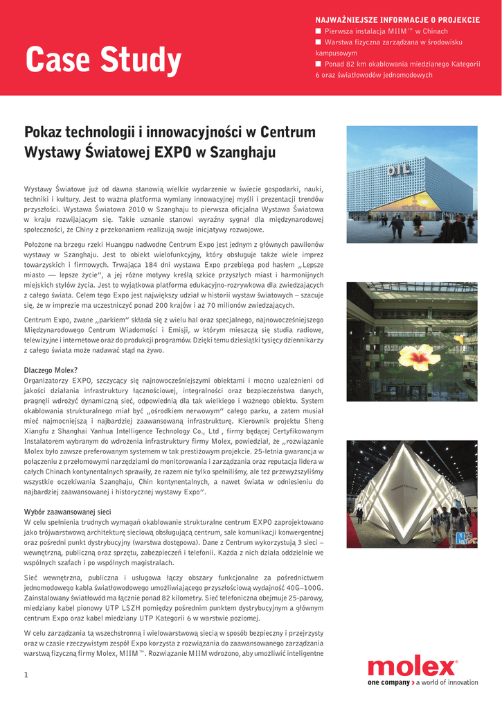 Case Study NAJWAŻNIEJSZE INFORMACJE O PROJEKCIE n Pierwsza instalacja MIIM™ w Chinach n Warstwa fizyczna zarządzana w środowisku kampusowym n Ponad 82 km okablowania miedzianego Kategorii 6 oraz światłowodów jednomodowych Pokaz technologii i innowacyjności w Centrum Wystawy Światowej EXPO w Szanghaju Wystawy Światowe już od dawna stanowią wielkie wydarzenie w świecie gospodarki, nauki, techniki i kultury. Jest to ważna platforma wymiany innowacyjnej myśli i prezentacji trendów przyszłości. Wystawa Światowa 2010 w Szanghaju to pierwsza oficjalna Wystawa Światowa w kraju rozwijającym się. Takie uznanie stanowi wyraźny sygnał dla międzynarodowej społeczności, że Chiny z przekonaniem realizują swoje inicjatywy rozwojowe. Położone na brzegu rzeki Huangpu nadwodne Centrum Expo jest jednym z głównych pawilonów wystawy w Szanghaju. Jest to obiekt wielofunkcyjny, który obsługuje także wiele imprez towarzyskich i firmowych. Trwająca 184 dni wystawa Expo przebiega pod hasłem „Lepsze miasto — lepsze życie”, a jej różne motywy kreślą szkice przyszłych miast i harmonijnych miejskich stylów życia. Jest to wyjątkowa platforma edukacyjno-rozrywkowa dla zwiedzających z całego świata. Celem tego Expo jest największy udział w historii wystaw światowych – szacuje się, że w imprezie ma uczestniczyć ponad 200 krajów i aż 70 milionów zwiedzających. Centrum Expo, zwane „parkiem” składa się z wielu hal oraz specjalnego, najnowocześniejszego Międzynarodowego Centrum Wiadomości i Emisji, w którym mieszczą się studia radiowe, telewizyjne i internetowe oraz do produkcji programów. Dzięki temu dziesiątki tysięcy dziennikarzy z całego świata może nadawać stąd na żywo. Dlaczego Molex? Organizatorzy EXPO, szczycący się najnowocześniejszymi obiektami i mocno uzależnieni od jakości działania infrastruktury łącznościowej, integralności oraz bezpieczeństwa danych, pragnęli wdrożyć dynamiczną sieć, odpowiednią dla tak wielkiego i ważnego obiektu. System okablowania strukturalnego miał być „ośrodkiem nerwowym” całego parku, a zatem musiał mieć najmocniejszą i najbardziej zaawansowaną infrastrukturę. Kierownik projektu Sheng Xiangfu z Shanghai Yanhua Intelligence Technology Co., Ltd , firmy będącej Certyfikowanym Instalatorem wybranym do wdrożenia infrastruktury firmy Molex, powiedział, że „rozwiązanie Molex było zawsze preferowanym systemem w tak prestiżowym projekcie. 25-letnia gwarancja w połączeniu z przełomowymi narzędziami do monitorowania i zarządzania oraz reputacja lidera w całych Chinach kontynentalnych sprawiły, że razem nie tylko spełniliśmy, ale też przewyższyliśmy wszystkie oczekiwania Szanghaju, Chin kontynentalnych, a nawet świata w odniesieniu do najbardziej zaawansowanej i historycznej wystawy Expo”. Wybór zaawansowanej sieci W celu spełnienia trudnych wymagań okablowanie strukturalne centrum EXPO zaprojektowano jako trójwarstwową architekturę sieciową obsługującą centrum, sale komunikacji konwergentnej oraz pośredni punkt dystrybucyjny (warstwa dostępowa). Dane z Centrum wykorzystują 3 sieci – wewnętrzną, publiczną oraz sprzętu, zabezpieczeń i telefonii. Każda z nich działa oddzielnie we wspólnych szafach i po wspólnych magistralach. Sieć wewnętrzna, publiczna i usługowa łączy obszary funkcjonalne za pośrednictwem jednomodowego kabla światłowodowego umożliwiającego przyszłościową wydajność 40G–100G. Zainstalowany światłowód ma łącznie ponad 82 kilometry. Sieć telefoniczna obejmuje 25-parowy, miedziany kabel pionowy UTP LSZH pomiędzy pośrednim punktem dystrybucyjnym a głównym centrum Expo oraz kabel miedziany UTP Kategorii 6 w warstwie poziomej. W celu zarządzania tą wszechstronną i wielowarstwową siecią w sposób bezpieczny i przejrzysty oraz w czasie rzeczywistym zespół Expo korzysta z rozwiązania do zaawansowanego zarządzania warstwą fizyczną firmy Molex, MIIM™. Rozwiązanie MIIM wdrożono, aby umożliwić inteligentne 1 NAJWAŻNIEJSZE INFORMACJE O PROJEKCIE n Pierwsza instalacja MIIM™ w Chinach n Warstwa fizyczna zarządzana w środowisku kampusowym n Ponad 82 km okablowania miedzianego Kategorii 6 oraz światłowodów jednomodowych Case Study Pokaz technologii i innowacyjności w Centrum Wystawy Światowej EXPO w Szanghaju monitorowanie systemu okablowania w centrum informacyjnym, centrum przeciwpożarowym oraz w salach komunikacji konwergentnej. Sheng Xiangfu powiedział, że „system MIIM jest doskonale przygotowany do zarządzania dużymi środowiskami kampusowymi. Dla zespołu Expo zasadniczymi kryteriami transmisji danych były szybkość, bezpieczeństwo, dokładność i odporność, a MIIM był bez wątpienia jedynym rozwiązaniem na rynku oferującym te zalety”. Za pomocą MIIM nieustannie monitoruje się setki kanałów o znaczeniu krytycznym w sieci wewnętrznej, publicznej, sprzętowej i zabezpieczeń w celu zapewnienia pomyślnego przebiegu Wystawy 2010 w Szanghaju. Molex – zwycięskie rozwiązanie Centrum EXPO w Szanghaju zaprojektowano z myślą o innowacyjności i niezawodności. Ponieważ miał to być w Szanghaju budynek-ikona, długoterminowe rozwiązanie infrastrukturalne było nieodzownym elementem jego statusu – słynnego na całym świecie centrum konferencyjnego. Zaawansowane rozwiązania infrastrukturalne firmy Molex wybrano do obsługi centrum EXPO oraz w celu umocnienia jego wizerunku jako jednej z najważniejszych inwestycji w infrastrukturę sieciową w Chinach. Jako najważniejszy budynek Wystawy 2010 centrum uzyskało 8 kluczowych wskaźników efektywności w zakresie standaryzacji, zaawansowanych technologii, praktyczności, elastyczności, kompatybilności, bezpieczeństwa, niezawodności i opłacalności. Na uzyskanie tych prestiżowych wskaźników znaczący wpływ miało rozwiązanie do zaawansowanego zarządzania warstwą fizyczną MIIM. Timothy Lam, r