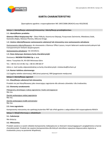 Data sporządzenia: 2015-06-01 / wersja 1-PL KARTA CHARAKTERYSTYKI [Sporządzona zgodnie z rozporządzeniem WE 1907/2006 (REACH) oraz 453/2010] Sekcja 1: Identyfikacja substancji/mieszaniny i identyfikacja przedsiębiorstwa 1.1. Identyfikator produktu Glamour Effect Księżycowy Pył – Złota Półkula, Kosmiczna Odyseja, Purpurowe Zaćmienie, Miedziany Szlak, Gwiezdna Bajka, Różowa Planeta, Mleczna Droga. 1.2. Istotne zidentyfikowane zastosowania substancji lub mieszaniny oraz zastosowania odradzane Zastosowania zidentyfikowane: do stosowania z Glamour Effect Lazura, innymi lakierami wodorozcieńczalnymi lub transparentnymi farbami dyspersyjnymi. Zastosowania odradzane: nie określono. 1.3. Dane dotyczące dostawcy karty charakterystyki Dostawca: INCHEM POLONIA Sp. z. o.o. Adres: Tuszyńska 54, 95-020 Wiśniowa Góra Tel.: +48 42 213 23 00; Fax: +48 42 299 68 37 Adres e- mail osoby odpowiedzialnej za kartę charakterystyki: [email protected] 1.4. Numer telefonu alarmowego 112 (ogólny telefon alarmowy), 998 (straż pożarna), 999 (pogotowie medyczne) Sekcja 2: Identyfikacja zagrożeń 2.1. Klasyfikacja substancji lub mieszaniny Produkt nie jest klasyfikowany jako stwarzający zagrożenie dla zdrowia człowieka i dla środowiska. 2.2. Elementy oznakowania Piktogramy określające rodzaj zagrożenia i hasło ostrzegawcze Nie ma. Zwroty wskazujące rodzaj zagrożenia Nie ma. Zwroty wskazujące środki ostrożności Nie ma. 2.3. Inne zagrożenia Komponenty mieszaniny nie spełniają kryteriów PBT lub vPvB zgodnie z załącznikiem XIII rozporządzenia REACH. Sekcja 3: Skład/informacja o składnikach 3.1. Substancje Nie dotyczy. 3.2. Mieszaniny Produkt zawiera w swoim składzie komponenty niebezpieczne w ilościach niewymagających uwzględnienia w karcie charakterystyki. Produkt nie zawiera komponentów dla których określono najwyższe dopuszczalne stężenia w środowisku pracy na poziomie Wspólnoty. Strona 1 z 7 Sekcja 4: Środki pierwszej pomocy 4.1. Opis środków pierwszej pomocy W kontakcie ze skórą: zdjąć zanieczyszczoną odzież. Zanieczyszczone partie skóry zmyć dokładnie za pomocą wody z mydłem. Nie stosować rozpuszczalników. W przypadku wystąpienia niepokojących objawów skonsultować się z lekarzem. W kontakcie z oczami: chronić niepodrażnione oko, wyjąć szkła kontaktowe. Zanieczyszczone oczy przepłukiwać dokładnie wodą przez kilka minut. Unikać silnego strumienia wody - ryzyko uszkodzenia rogówki. Skonsultować się z lekarzem w przypadku wystąpienia niepokojących objawów. W przypadku spożycia: nie wywoływać wymiotów! Przepłukać usta wodą. Zasięgnąć porady lekarza lub wezwać pogotowie, pokazać opakowanie lub etykietę. Po narażeniu drogą oddechową: wyprowadzić poszkodowanego na świeże powietrze, zapewnić ciepło i spokój. Skonsultować się z lekarzem w razie wystąpienia niepokojących dolegliwości. 4.2. Najważniejsze ostre i opóźnione objawy oraz skutki narażenia W kontakcie ze skórą: w przypadku częstego lub długotrwałego kontaktu może wystąpić wysuszenie, zaczerwienienie, chwilowe podrażnienie. W kontakcie z oczami: możliwe zaczerwienie, łzawienie, pieczenie. Inhalacja: narażenie tą drogą nie powoduje negatywnych skutków zdrowotnych. Po połknięciu: może powodować podrażnienie błon śluzowych przewodu pokarmowego, nudności, wymioty. 4.3. Wskazania dotyczące wszelkiej natychmiastowej pomocy lekarskiej i szczególnego postępowania z poszkodowanym Decyzję o sposobie postępowania ratunkowego podejmuje lekarz po dokładnej ocenie stanu poszkodowanego. Sekcja 5: Postępowanie w przypadku pożaru 5.1. Środki gaśnicze Odpowiednie środki gaśnicze: CO2, proszek gaśniczy, piana lub rozpylony strumień wody. Niewłaściwe środki gaśnicze: zwarty strumień wody – niebezpieczeństwo rozprzestrzenienia pożaru. 5.2. Szczególne zagrożenia związane z substancją lub mieszaniną W warunkach pożaru może wydzielać się drażniący, czarny, gęsty dym zawierający tlenki węgla [CO, CO2]. Unikać wdychania produktów spalania, mogą stwarzać zagrożenie dla zdrowia. 5.3. Informacje dla straży pożarnej Środki ochrony ogólnej typowe w przypadku pożaru. Nie należy przebywać w zagrożonej ogniem strefie bez odpowiedniego ubrania odpornego na chemikalia i aparatu do oddychania z niezależnym obiegiem powietrza. Zagrożone ogniem pojemniki chłodzić bezpiecznej odległości rozpylonym strumieniem wody. Nie należy dopuścić do przedostania się wody gaśniczej do kanalizacji, wód powierzchniowych i gruntowych. Sekcja 6: Postępowanie w przypadku niezamierzonego uwolnieni a do środowiska 6.1. Indywidualne środki ostrożności, wyposażenie ochronne i procedury w sytuacjach awaryjnych Dla osób nienależących do personelu likwidującego skutki awarii: ograniczyć dostęp osób postronnych do obszaru awarii do czasu zakończenia odpowiednich operacji oczyszczania. W przypadku dużych wycieków odizolować zagrożony obszar. Stosować środki ochrony indywidualnej. Unikać zanieczyszczenia oczu i skóry. Zapewnić odpowiednią wentylację. Dla osób likwidujących skutki awarii: dopilnować, aby usuwanie awarii i jej skutków przeprowadzał wyłącznie przeszkolony personel. Stosować środki ochrony indywidualnej. 6.2. Środki ostrożności w zakresie ochrony środowiska Nie należy dopuścić do przedostania się produktu do wód gruntowych, zbiorników i cieków wodnych ani do kanalizacji. W razie potrzeby wezwać odpowiednie służby ratownicze. Strona 2 z 7 6.3. Metody i materiały zapobiegające rozprzestrzenianiu się skażenia i służące do usuwania skażenia Uszkodzone opakowanie umieścić w opakowaniu awaryjnym. Zebrać materiałami pochłaniającymi ciecze (np. piasek, ziemia, uniwersalne substancje wiążące, krzemionka, itp.). Oczyścić zanieczyszczone miejsce. Zebrany materiał potraktować jak odpady. 6.4. Odniesienia do innych sekcji Postępowanie z odpadami produktu –