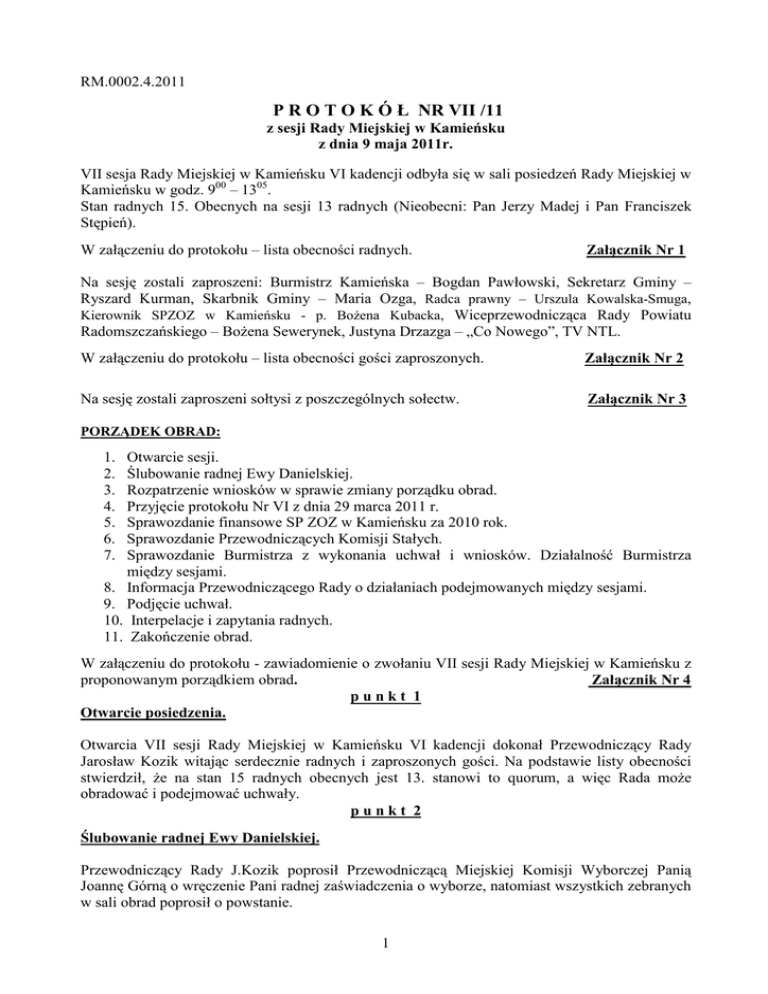 RM.0002.4.2011 P R O T O K Ó Ł NR VII /11 z sesji Rady Miejskiej w Kamieńsku z dnia 9 maja 2011r. VII sesja Rady Miejskiej w Kamieńsku VI kadencji odbyła się w sali posiedzeń Rady Miejskiej w Kamieńsku w godz. 900 – 1305. Stan radnych 15. Obecnych na sesji 13 radnych (Nieobecni: Pan Jerzy Madej i Pan Franciszek Stępień). W załączeniu do protokołu – lista obecności radnych. Załącznik Nr 1 Na sesję zostali zaproszeni: Burmistrz Kamieńska – Bogdan Pawłowski, Sekretarz Gminy – Ryszard Kurman, Skarbnik Gminy – Maria Ozga, Radca prawny – Urszula Kowalska-Smuga, Kierownik SPZOZ w Kamieńsku - p. Bożena Kubacka, Wiceprzewodnicząca Rady Powiatu Radomszczańskiego – Bożena Sewerynek, Justyna Drzazga – „Co Nowego”, TV NTL. W załączeniu do protokołu – lista obecności gości zaproszonych. Załącznik Nr 2 Na sesję zostali zaproszeni sołtysi z poszczególnych sołectw. Załącznik Nr 3 PORZĄDEK OBRAD: 1. 2. 3. 4. 5. 6. 7. Otwarcie sesji. Ślubowanie radnej Ewy Danielskiej. Rozpatrzenie wniosków w sprawie zmiany porządku obrad. Przyjęcie protokołu Nr VI z dnia 29 marca 2011 r. Sprawozdanie finansowe SP ZOZ w Kamieńsku za 2010 rok. Sprawozdanie Przewodniczących Komisji Stałych. Sprawozdanie Burmistrza z wykonania uchwał i wniosków. Działalność Burmistrza między sesjami. 8. Informacja Przewodniczącego Rady o działaniach podejmowanych między sesjami. 9. Podjęcie uchwał. 10. Interpelacje i zapytania radnych. 11. Zakończenie obrad. W załączeniu do protokołu - zawiadomienie o zwołaniu VII sesji Rady Miejskiej w Kamieńsku z proponowanym porządkiem obrad. Załącznik Nr 4 punkt 1 Otwarcie posiedzenia. Otwarcia VII sesji Rady Miejskiej w Kamieńsku VI kadencji dokonał Przewodniczący Rady Jarosław Kozik witając serdecznie radnych i zaproszonych gości. Na podstawie listy obecności stwierdził, że na stan 15 radnych obecnych jest 13. stanowi to quorum, a więc Rada może obradować i podejmować uchwały. punkt 2 Ślubowanie radnej Ewy Danielskiej. Przewodniczący Rady J.Kozik poprosił Przewodniczącą Miejskiej Komisji Wyborczej Panią Joannę Górną o wręczenie Pani radnej zaświadczenia o wyborze, natomiast wszystkich zebranych w sali obrad poprosił o powstanie. 1 Przewodnicząca MKW wręczyła radnej Ewie Danielskiej zaświadczenia o wyborze na radną Rady Miejskiej w Kamieńsku życząc jednocześnie owocnej pracy. Przewodniczący Rady J.Kozik podziękował Pani Przewodniczącej MKW, następnie poinformował radną Ewę Danielską, że odczyta tekst ślubowania, a Pani Radna wypowie wg swojego wyboru słowo „ślubuję” lub zwrot „ślubuję tak mi dopomóż Bóg”. Przewodniczący Rady odczytał tekst ślubowania: „Wierny Konstytucji i prawu Rzeczypospolitej Polskiej ślubuję uroczyście obowiązki radnego sprawować godnie, rzetelnie i uczciwie, mając na względzie dobro mojej gminy i jej mieszkańców.” Po odczytaniu roty radna Ewa Danielska złożyła ślubowanie wypowiadając zwrot „ślubuję tak mi dopomóż Bóg.” punkt 3 Rozpatrzenie wniosków w sprawie zmiany porządku obrad. Burmistrz B.Pawłowski zgłosił wniosek o rozszerzenie punktu 9. Podjęcie uchwał o dwie uchwały: 1) w sprawie zmiany uchwały dotyczącej trybu postępowania o udzielenie dotacji na inne zadania niż określone w uchwale o działalności pożytku publicznego i wolontariacie; 2) w sprawie zmiany uchwały dotyczącej przeprowadzenia konsultacji z mieszkańcami sołectwa Ochocice w sprawie podziału sołectwa na sołectwo Ochocice i sołectwo Aleksandrów. Przewodniczący Rady J.Kozik poddał pod głosowanie ww. wniosek. Ad. 1) Głosowało 13 radnych. Za przyjęciem ww. wniosku głosowało 13 radnych. W wyniku głosowania ww. wniosek został przyjęty jednogłośnie. Ad. 2) Głosowało 13 radnych. Za przyjęciem ww. wniosku głosowało 13 radnych. W wyniku głosowania ww. wniosek został przyjęty jednogłośnie. Więcej wniosków do porządku obrad nie zgłoszono. W związku z wyczerpaniem punktu 3. Przewodniczący Rady przeszedł do punktu 4. punkt 4 Przyjęcie protokołu Nr VI z dnia 29 marca 2011 r. Przewodniczący Rady J.Kozik powiedział, że protokół był wyłożony w biurze Rady był do wglądu i każdy z Państwa radnych mógł się zapoznać z jego treścią. Ponadto poinformował, że została wniesiona jedna poprawka, która została uwzględniona w protokole. Następnie Przewodniczący Rady zapytał czy są jakieś uwagi do protokołu. Nie zgłoszono uwag do protokołu Nr VI z dnia 29 marca 2011 r. Przewodniczący Rady J.Kozik poddał pod głosowanie przyjęcie ww. protokołu. Głosowało 13 radnych. Za przyjęciem ww. protokołu głosowało 12 radnych. 1 radny głosował „przeciw”. W wyniku głosowania ww. protokół został przyjęty. 2 punkt 5 Sprawozdanie finansowe SP ZOZ w Kamieńsku za 2010 rok. W związku z omawianym tematem na sesję przybyła Kierownik SPZOZ w Kamieńsku Pani Bożena Kubacka. Kierownik SPZOZ powiedziała, że zgodnie z ustawą o rachunkowości (Art. 64.1 ust. 4) badaniu i ogłaszaniu podlegają roczne sprawozdania finansowe, które spełniły, co najmniej dwa z następujących warunków: a) średnioroczne zatrudnienie w przeliczeniu na pełne etaty wyniosło co najmniej 50 osób. b) Suma aktywów bilansu na koniec roku obrotowego stanowiła równowartość w walucie polskiej 2.500.000 EURO c) Przychód netto ze sprzedaży towarów i usług oraz operacji finansowych stanowi równowartość 5.000.000 EURO. Zgodnie z w/w ustawą SP ZOZ Kamieńsk nie spełnia warunków do badania i ogłoszenia sprawozdania finansowego, ponieważ: a) suma aktywów i pasywów bilansu na dzień 31.12.2010r. wynosiła 328.415,04 b) przychód ze sprzedaży towarów i usług oraz operacji finansowych wynosi 1.064.030,34. Pani Kierownik dodała: „Na koniec roku 2010 uzyskaliśmy (nie będę się wdawać w szczegóły, bo mieliście to Państwo przedstawione na Komisji zdrowia i Radzie Społecznej SPZOZ) wypra