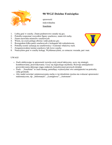 90 WGZ Dzielne Fenixiątka sprawność indywidualna Szachista 1. 2. 3. 4. 5. 6. 7. 8. Lubię grać w szachy. Znam podstawowe zasady tej gry. Potrafię rozpoznać wszystkie figury szachowe, znam ich ruchy. Znam nazwiska mistrzów szachowych. Wiem, na czym polega obrona i atak podczas gry. Rozegrałem kilka partii szachowych z kolegami lub rodzeństwem. Potrafię ocenić sytuację na szachownicy i wykonać właściwy ruch. Zorganizowałem turniej szachowy lub żywe szachy. Nauczyłem grać w szachy kolegę. Wytłumaczyłem, co oznacza: roszada, pat i mat. UWAGI • • • Zuch zdobywając tę sprawność rozwija swój zmysł taktyczny, uczy się strategii, kombinowania, przewidywania. Uczy się logicznego myślenia. Rozwija umiejętności przewidywania dalszego ciągu zadarzeń, konsekwencji pewnych działań. Zuch – „Szachista” to zuch strateg, potrafiący wykorzystać swe umiejętności na potrzeby całej gromady. Aby nadal rozwijać zainteresowania zucha w tej dziedzinie można mu wskazać sprawności matematyczne, np. „Informatyk”, „Łamigłowa”, „Astronom”.