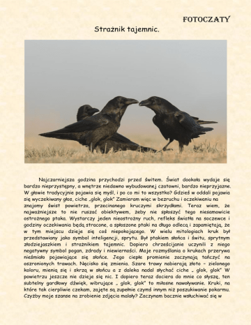 FOTOCZATY Strażnik tajemnic. Najczarniejsza godzina przychodzi przed świtem. Świat dookoła wydaje się bardzo nieprzystępny, a wnętrze niedawno wybudowanej czatowni, bardzo nieprzyjazne. W głowie tradycyjnie pojawia się myśl, i po co mi to wszystko? Gdzieś w oddali pojawia się wyczekiwany głos, ciche „glok, glok” Zamieram więc w bezruchu i oczekiwaniu na znajomy świst powietrza, przecinanego kruczymi skrzydłami. Teraz wiem, że najważniejsze to nie ruszać obiektywem, żeby nie spłoszyć tego niesamowicie ostrożnego ptaka. Wystarczy jeden nieostrożny ruch, refleks światła na soczewce i godziny oczekiwania będą stracone, a spłoszone ptaki na długo odlecą i zapamiętają, że w tym miejscu dzieje się coś niepokojącego. W wielu mitologiach kruk był przedstawiany jako symbol inteligencji, sprytu. Był ptakiem słońca i świtu, sprytnym złodziejaszkiem i strażnikiem tajemnic. Dopiero chrześcijanie uczynili z niego negatywny symbol pogan, zdrady i niewierności. Moje rozmyślania o krukach przerywa nieśmiało pojawiające się słońce. Jego ciepłe promienie zaczynają tańczyć na oszronionych trawach. Nęcisko się zmienia. Szare trawy nabierają złoto – zielonego koloru, mienią się i skrzą w słońcu a z daleka nadal słychać ciche „ glok, glok” W powietrzu jeszcze nie dzieje się nic. I dopiero teraz dociera do mnie co słyszę, ten subtelny gardłowy dźwięk, wibrujące „ glok, glok” to miłosne nawoływanie. Kruki, na które tak cierpliwie czekam, zajęte są zupełnie czymś innym niż poszukiwanie pokarmu. Czyżby moje szanse na zrobienie zdjęcia malały? Zaczynam bacznie wsłuchiwać się w FOTOCZATY odgłosy dookoła mnie. Kruki to gaduły, potrafią ze sobą rozmawiać używając bogatej gamy dźwięków. Kląskanie, gulgotanie, krakanie to te najbardziej znane. Ale jest też wiele innych. Inaczej nawołują się oznajmiając znalezienie pokarmu, jeszcze inaczej wołają, kiedy nie mogą poradzić sobie z dobraniem się do mięsa. Czymś zaciekawione zwołują posiłki, bo w gromadzie raźniej i bezpieczniej. Szczytem kruczej finezji językowej są ich miłosne rozmowy. Więc nasłuchuję i czekam. Miłosne „ glok, glok” cichnie gdzieś w oddali a nade mną pojawia się samotny ptak. Ostrożnie i wysoko zatacza koło nad nęciskiem. Pętle powoli zacieśniają się i w końcu czarny strażnik tajemnic ląduje tuż przede mną. Jest piękny, pióra lśnią i mienią się w promieniach wschodzącego słońca. Ktoś kto powiedział, że kruki są po prostu czarne, chyba na oczy ich nie widział. Ptak nerwowo lustruje nęcisko, obraca głowę na wszystkie strony, podskakuje i nawołuje towarzyszy. I lśni w słońcu. Na piórach jak duchy pojawiają się i znikają niebiesko - zielone refleksy. Nie chcę ruszać aparatem, żeby nie spłoszyć tego bacznego obserwatora, czekam więc, aż któryś podskok pchnie ptaka tuż przed mój obiektyw. To pierwszy gość przed nową czatownią, dla tego tak ważne jest, żeby go niczym nie wystraszyć. Kiedy przyzwyczają się do nowej stołówki będzie trochę łatwiej. Kruki to pewnego rodzaju forpoczta dla drapieżników. Więc liczę na to, że zaraz za tymi czarnulkami ściągną przed mój obiektyw myszołowy a może nawet bielik. Tym czasem próbuje nacieszyć oczy jednym z piękniejszych widoków – krukiem lśniącym w promieniach wschodzącego słońca i szronie.