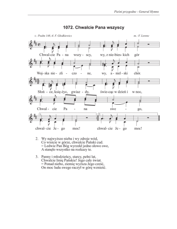 Pieśni przygodne - General Hymns 1072. Chwalcie Pana wszyscy t.: Psalm 148, tł. F. Głodkiewicz Chwal-cie Pa - na Woj- ska nie - zli - m.: F. Lorenc wszy - scy, czo - ne, Słoń - ce, księ-życ, gwiaz - dy, Chwal - cie Pa chwal- cie Je - go - moc! wy, z nie-bies- kich wy, a - niel - ski świe-cąc w dzień i na swe gór chór. w noc, - go, chwal- cie Je - go moc! 2. Wy najwyższe nieba i wy zdroje wód, Co wisicie w górze, chwalcie Pański cud. = Ledwie Pan Bóg wyrzekł jedno słowo swe, A stanęło wszystko na rozkazy te. 3. Panny i młodzieńcy, starcy, pełni lat, Chwalcie Imię Pańskie! Jego cały świat. = Ponad niebo, ziemię wyższa Jego cześć, On moc ludu swego raczył w górę wznieść.