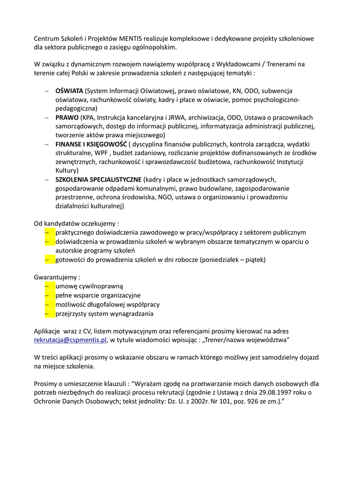 Centrum Szkoleń i Projektów MENTIS realizuje kompleksowe i dedykowane projekty szkoleniowe dla sektora publicznego o zasięgu ogólnopolskim. W związku z dynamicznym rozwojem nawiążemy współpracę z Wykładowcami / Trenerami na terenie całej Polski w zakresie prowadzenia szkoleń z następującej tematyki : OŚWIATA (System Informacji Oświatowej, prawo oświatowe, KN, ODO, subwencja oświatowa, rachunkowość oświaty, kadry i płace w oświacie, pomoc psychologicznopedagogiczna) PRAWO (KPA, Instrukcja kancelaryjna i JRWA, archiwizacja, ODO, Ustawa o pracownikach samorządowych, dostęp do informacji publicznej, informatyzacja administracji publicznej, tworzenie aktów prawa miejscowego) FINANSE I KSIĘGOWOŚĆ ( dyscyplina finansów publicznych, kontrola zarządcza, wydatki strukturalne, WPF , budżet zadaniowy, rozliczanie projektów dofinansowanych ze środków zewnętrznych, rachunkowość i sprawozdawczość budżetowa, rachunkowość Instytucji Kultury) SZKOLENIA SPECJALISTYCZNE (kadry i płace w jednostkach samorządowych, gospodarowanie odpadami komunalnymi, prawo budowlane, zagospodarowanie przestrzenne, ochrona środowiska, NGO, ustawa o organizowaniu i prowadzeniu działalności kulturalnej) Od kandydatów oczekujemy : praktycznego doświadczenia zawodowego w pracy/współpracy z sektorem publicznym doświadczenia w prowadzeniu szkoleń w wybranym obszarze tematycznym w oparciu o autorskie programy szkoleń gotowości do prowadzenia szkoleń w dni robocze (poniedziałek – piątek) Gwarantujemy : umowę cywilnoprawną pełne wsparcie organizacyjne możliwość długofalowej współpracy przejrzysty system wynagradzania Aplikacje wraz z CV, listem motywacyjnym oraz referencjami prosimy kierować na adres [email protected], w tytule wiadomości wpisując : „Trener/nazwa województwa” W treści aplikacji prosimy o wskazanie obszaru w ramach którego możliwy jest samodzielny dojazd na miejsce szkolenia. Prosimy o umieszczenie klauzuli : “Wyrażam zgodę na przetwarzanie moich danych osobowych dla potrzeb niezbędnych do realizacji procesu rekrutacji (zgodnie z Ustawą z dnia 29.08.1997 roku o Ochronie Danych Osobowych; tekst jednolity: Dz. U. z 2002r. Nr 101, poz. 926 ze zm.).”
