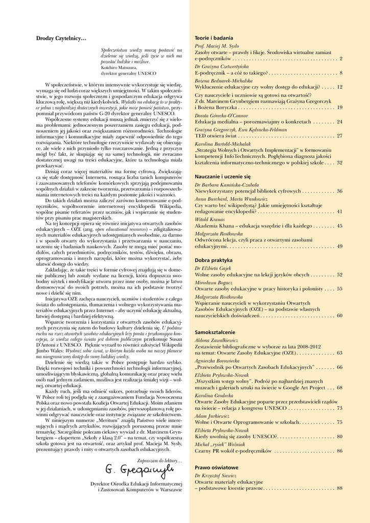 Drodzy Czytelnicy… Teorie i badania Społeczeństwa wiedzy muszą postawić na dzielenie się wiedzą, jeśli życie w nich ma pozostać ludzkie i możliwe. Koïchiro Matsuura, dyrektor generalny UNESCO W społeczeństwie, w którym intensywnie wykorzystuje się wiedzę, wymaga się od ludzi coraz większych umiejętności. W takim społeczeństwie, w jego rozwoju społecznym i gospodarczym edukacja odgrywa kluczową rolę, większą niż kiedykolwiek. Wydatki na edukację to w praktyce jedna z najbardziej skutecznych inwestycji, jakie może ponieść państwo, przypomniał przywódcom państw G-20 dyrektor generalny UNESCO. Współczesne systemy edukacji muszą jednak zmierzyć się z wieloma problemami: jednoczesnym poszerzaniem zasięgu edukacji, podnoszeniem jej jakości oraz zwiększaniem różnorodności. Technologie informacyjne i komunikacyjne miały zapewnić odpowiednie do tego rozwiązania. Niektóre technologie rzeczywiście wydawały się obiecujące, ale wiele z nich przyniosło tylko rozczarowanie. Jedną z przyczyn mógł być fakt, że skupiając się na samej technologii, nie zwracano dostatecznej uwagi na treści edukacyjne, które ta technologia miała przekazywać. Dzisiaj coraz więcej materiałów ma formę cyfrową. Zwiększająca się stale dostępność Internetu, rosnąca liczba tanich komputerów i zaawansowanych telefonów komórkowych sprzyjają podejmowaniu wspólnych działań w zakresie tworzenia, przetwarzania i rozpowszechniania internetowych treści na każdym poziomie jakości i ważności. Do takich działań można zaliczyć zarówno konstruowanie e-podręczników, współtworzenie internetowej encyklopedii Wikipedia, wspólne pisanie referatów przez uczniów, jak i wspieranie się studentów przy pisaniu prac magisterskich. Na tej koncepcji opiera się również inicjatywa otwartych zasobów edukacyjnych – OZE (ang. open educational resources) – zdigitalizowanych materiałów edukacyjnych udostępnianych swobodnie, za darmo i w sposób otwarty do wykorzystania i przetwarzania w nauczaniu, uczeniu się i badaniach naukowych. Zasoby te mogą mieć postać modułów, całych przedmiotów, podręczników, testów, dźwięku, obrazu, oprogramowania i innych narzędzi, które można wykorzystać, żeby ułatwić dostęp do wiedzy. Zakładając, że takie treści w formie cyfrowej znajdują się w domenie publicznej lub zostały wydane na licencji, która dopuszcza swobodny użytek i modyfikacje utworu przez inne osoby, można je łatwo dostosowywać do swoich potrzeb, można na ich podstawie tworzyć nowe i dzielić się nim. Inicjatywa OZE zachęca nauczycieli, uczniów i studentów z całego świata do udostępniania, tłumaczenia i wolnego wykorzystywania materiałów edukacyjnych przez Internet – aby uczynić edukację aktualną, łatwiej dostępną i bardziej efektywną. Wsparcie tworzenia i korzystania z otwartych zasobów edukacyjnych przyczynia się zatem do budowy kultury dzielenia się. U podstaw ruchu na rzecz otwartych zasobów edukacyjnych leży prosta i przekonująca koncepcja, że wiedza całego świata jest dobrem publicznym przekonuje Susan D’Antoni z UNESCO. Pięknie wyraził to również założyciel Wikipedii Jimbo Wales: Wyobraź sobie świat, w którym każda osoba na naszej planecie ma nieograniczony dostęp do sumy ludzkiej wiedzy. Dzielenie się wiedzą także w Polsce postępuje bardzo szybko. Dzięki rozwojowi techniki i powszechności technologii informacyjnej, umożliwiającym błyskawiczną, globalną komunikację oraz pracę wielu osób nad jednym zadaniem, możliwa jest realizacja śmiałej wizji – wolnej, otwartej edukacji. Każdy ruch, jeśli ma odnieść sukces, potrzebuje swoich liderów. W Polsce roli tej podjęła się z zaangażowaniem Fundacja Nowoczesna Polska oraz nowo powstała Koalicja Otwartej Edukacji. Moim zdaniem w jej działaniach, w udostępnianiu zasobów, pierwszoplanową rolę powinni odgrywać nauczyciele oraz instytucje związane ze szkolnictwem. W niniejszym numerze „Meritum” znajdą Państwo wiele interesujących i mądrych artykułów, rozwijających poruszoną przeze mnie tematykę. Szczególnie polecam ciekawy wywiad z dr. Marcinem Grynbergiem – ekspertem „Szkoły z klasą 2.0” – na temat, czy współczesna szkoła gotowa jest na otwartość, oraz artykuł prof. Macieja M. Sysły, prezentujący prawdy i mity o otwartych zasobach edukacyjnych. Prof. Maciej M. Sysło Zasoby otwarte – prawdy i fikcje. Środowiska wirtualne zamiast e-podręczników . . . . . . . . . . . . . . . . . . . . . . . . . . . . . . . . . . . . . . . 2 Dr Grażyna Czetwertyńska E-podręcznik – a cóż to takiego? . . . . . . . . . . . . . . . . . . . . . . . . . 8 Bożena Bednarek-Michalska Wykluczenie edukacyjne czy wolny dostęp do edukacji? . . . . . . 12 Czy nauczyciele i uczniowie są gotowi na otwartość? Z dr. Marcinem Grynbergiem rozmawiają Grażyna Gregorczyk i Bożena Boryczka . . . . . . . . . . . . . . . . . . . . . . . . . . . . . . . . . . . 19 Dorota Górecka-O’Connor Edukacja medialna – porozmawiajmy o konkretach . . . . . . . . . 24 Grażyna Gregorczyk, Ewa Kędracka-Feldman TED otwiera świat . . . . . . . . . . . . . . . . . . . . . . . . . . . . . . . . . . . . 27 Karolina Bartołd-Michalak „Strategia Wolnych i Otwartych Implementacji” w formowaniu kompetencji InfoTechnicznych. Pogłębiona diagnoza jakości kształcenia informatyczno-technicznego w polskiej szkole . . . . 32 Nauczanie i uczenie się Dr Barbara Kamińska-Czubała Niewykorzystany potencjał bibliotek cyfrowych . . . . . . . . . . . . 36 Anna Burchard, Marta Wnukowicz Czy warto być wikipedystą? Jakie umiejętności kształtuje redagowanie encyklopedii? . . . . . . . . . . . . . . . . . . . . . . . . . . . . 41 Witold Kranas Akademia Khana – edukacja wszędzie i dla każdego . . . . . . . . . 45 Małgorzata Rostkowska Odwrócona lekcja, czyli praca z otwartymi zasobami edukacyjnymi . . . . . . . . 