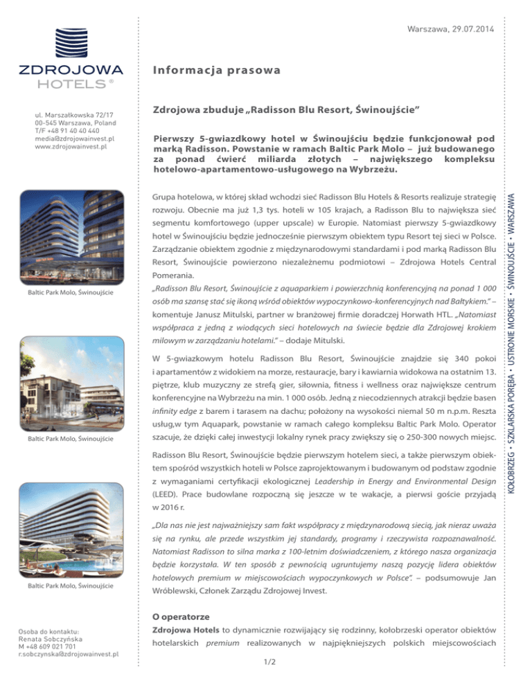Warszawa, 29.07.2014 Informacja prasowa Zdrojowa zbuduje „Radisson Blu Resort, Świnoujście” hotel w Świnoujściu będzie jednocześnie pierwszym obiektem typu Resort tej sieci w Polsce. Zarządzanie obiektem zgodnie z międzynarodowymi standardami i pod marką Radisson Blu Resort, Świnoujście powierzono niezależnemu podmiotowi – Zdrojowa Hotels Central Pomerania. Baltic Park Molo, Świnoujście „Radisson Blu Resort, Świnoujście z aquaparkiem i powierzchnią konferencyjną na ponad 1 000 osób ma szansę stać się ikoną wśród obiektów wypoczynkowo-konferencyjnych nad Bałtykiem.” – komentuje Janusz Mitulski, partner w branżowej firmie doradczej Horwath HTL. „Natomiast współpraca z jedną z wiodących sieci hotelowych na świecie będzie dla Zdrojowej krokiem milowym w zarządzaniu hotelami.” – dodaje Mitulski. W 5-gwiazkowym hotelu Radisson Blu Resort, Świnoujście znajdzie się 340 pokoi i apartamentów z widokiem na morze, restauracje, bary i kawiarnia widokowa na ostatnim 13. piętrze, klub muzyczny ze strefą gier, siłownia, fitness i wellness oraz największe centrum konferencyjne na Wybrzeżu na min. 1 000 osób. Jedną z niecodziennych atrakcji będzie basen infinity edge z barem i tarasem na dachu; położony na wysokości niemal 50 m n.p.m. Reszta usług,w tym Aquapark, powstanie w ramach całego kompleksu Baltic Park Molo. Operator Baltic Park Molo, Świnoujście szacuje, że dzięki całej inwestycji lokalny rynek pracy zwiększy się o 250-300 nowych miejsc. Radisson Blu Resort, Świnoujście będzie pierwszym hotelem sieci, a także pierwszym obiektem spośród wszystkich hoteli w Polsce zaprojektowanym i budowanym od podstaw zgodnie z wymaganiami certyfikacji ekologicznej Leadership in Energy and Environmental Design (LEED). Prace budowlane rozpoczną się jeszcze w te wakacje, a pierwsi goście przyjadą w 2016 r. „Dla nas nie jest najważniejszy sam fakt współpracy z międzynarodową siecią, jak nieraz uważa się na rynku, ale przede wszystkim jej standardy, programy i rzeczywista rozpoznawalność. Natomiast Radisson to silna marka z 100-letnim doświadczeniem, z którego nasza organizacja będzie korzystała. W ten sposób z pewnością ugruntujemy naszą pozycję lidera obiektów Baltic Park Molo, Świnoujście hotelowych premium w miejscowościach wypoczynkowych w Polsce”. – podsumowuje Jan Wróblewski, Członek Zarządu Zdrojowej Invest. O operatorze Osoba do kontaktu: Renata Sobczyńska M +48 609 021 701 [email protected] Zdrojowa Hotels to dynamicznie rozwijający się rodzinny, kołobrzeski operator obiektów hotelarskich premium realizowanych w najpiękniejszych polskich miejscowościach 1/2 ŚWINOUJŚCIE segmentu komfortowego (upper upscale) w Europie. Natomiast pierwszy 5-gwiazdkowy USTRONIE MORSKIE rozwoju. Obecnie ma już 1,3 tys. hoteli w 105 krajach, a Radisson Blu to największa sieć SZKLARSKA PORĘBA Grupa hotelowa, w której skład wchodzi sieć Radisson Blu Hotels & Resorts realizuje strategię WARSZAWA Pierwszy 5-gwiazdkowy hotel w Świnoujściu będzie funkcjonował pod marką Radisson. Powstanie w ramach Baltic Park Molo – już budowanego za ponad ćwierć miliarda złotych – największego kompleksu hotelowo-apartamentowo-usługowego na Wybrzeżu. KOŁOBRZEG ul. Marszałkowska 72/17 00-545 Warszawa, Poland T/F +48 91 40 40 440 [email protected] www.zdrojowainvest.pl wypoczynkowych i tylko w najlepszych lokalizacjach. Aktualnie prowadzi 6 obiektów nad morzem i w górach, w tym najnowsze: Cristal Resort Szklarska Poręba, Boulevard Ustronie Morskie i Diune Hotel*****. Zdrojowa odnosi sukcesy i zdobywa liczne nagrody i wyróżnienia. W tym wybór Marine Hotel***** & Ultra Marine na centrum pobytowe Reprezentacji Danii podczas Euro 2012, nagroda Best Hotel Award 2012 i 2013 (dwa lata z rzędu), a także Profit Hotel Award 2013 dla ul. Marszałkowska 72/17 00-545 Warszawa, Poland T/F +48 91 40 40 440 [email protected] www.zdrojowainvest.pl Marine Hotel*****, TopHotel Sea 2011 w Polsce oraz HolidayCheck Award 2014 w kategorii „Dla Par” dla Sand Hotel****. Zdrojowa Hotels oraz Zdrojowa Invest – deweloper jej obiektów i lider second home w Polsce – tworzą holding Zdrojowa z ponad 400-osobową kadrą. Zdrojowa jest grupą odpowiedzialną społecznie, troszczącą się o rozwój sztuki i środowisko w ramach programów: Zdrojowa Art i Zdrojowa Eco Friendly. Radisson Blu Resort, Świnoujście. ŚWINOUJŚCIE Copyright © Zdrojowa Hotels Central Pomerania Sp. z o.o. WARSZAWA Zdrojowa Hotels Central Pomerania to podmiot powołany w celu zarządzania hotelem SZKLARSKA PORĘBA USTRONIE MORSKIE Baltic Park Molo, Świnoujście KOŁOBRZEG Baltic Park Molo, Świnoujście Baltic Park Molo, Świnoujście Osoba do kontaktu: Renata Sobczyńska M +48 609 021 701 [email protected] 2/2